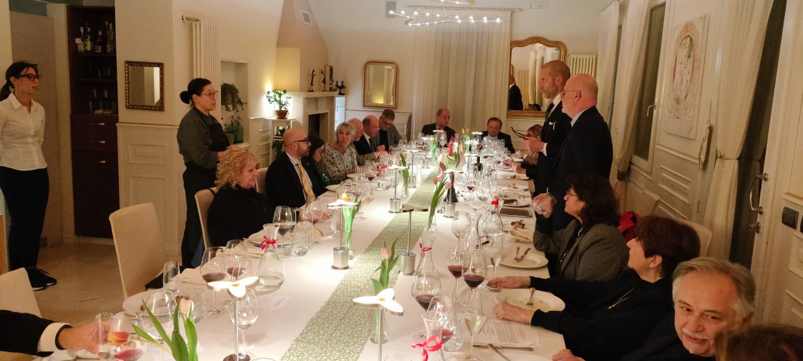 Il calore e la genuinità della gestione familiare della "Locanda ai Capitelli" hanno reso piacevolissima la prima riunione conviviale dopo la pausa invernale, immersi nel cuore delle colline venete, tra i vigneti e le mura medievali di Soave. Il Simposiarca Alberto Rubinelli ha presentato un menu preparato con materie prime fortemente legate al territorio. Apprezzati in modo particolare gli gnocchetti di rapa rossa con ricotta affumicata. Una magnifica sala e un personale giovane, professionale e attento hanno reso particolarmente suggestivo l’incontro della Delegazione. Uno straordinario e seducente calice di vino Amarone, proposto e servito dal Simposiarca, ha accresciuto il valore del brindisi al prestigioso programma annuale della Delegazione.