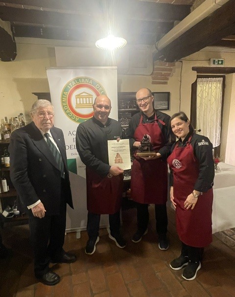 Un folto numero di Accademici della Delegazione di Modena si è ritrovato nei locali della Salumeria-Hosteria Giuseppe Giusti, in via Carlo Farini, nel centro di Modena, per la consegna del Gran Premio triennale “La Rezdora”, istituito nel 1966 e che prevede un attestato e un bronzetto raffigurante un’anziana signora che fa “la sfoglia”. La famiglia Morandi ha ricevuto il Gran Premio “La Rezdora” per il triennio 2023-2026, in qualità di gestore da anni della Salumeria-Hosteria Giusti, uno dei locali più antichi e iconici della città. Agli accademici, Cecilia Morandi ha offerto gnocco fritto, salumi e formaggi, frittatina di zucchine, erbazzone, lasagne, crostate di amarene e… lambrusco. Attestato e bronzetto sono stati consegnati alla famiglia Morandi dal Delegato Mario Baraldi e dal Simposiarca Pietro Cantore, alla presenza del Segretario Marco Righi e del Tesoriere Giulio Galizia, che hanno curato l’organizzazione della serata per il piacere di tutti gli Accademici presenti.