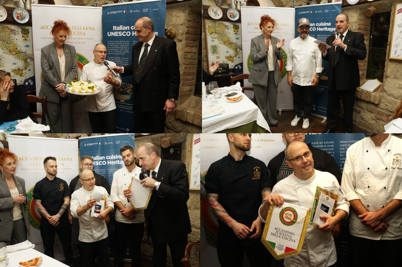 Il 27 febbraio 2026, presso il MagNet Kozossegi Haz di Budapest, si è svolto il Seminario organizzato dalla Delegazione di Budapest con il Comitato Dante Alighieri, parte della Società Dante Alighieri. Dopo i saluti della Presidente Edit Császi e del Delegato Michele Fasciano, la Vice Delegata Maria Carmela Gaetani Aronica ha aperto i lavori con la conferenza “La Cucina Italiana patrimonio immateriale UNESCO”, illustrando il valore del riconoscimento, che celebra identità, tradizioni, innovazioni e saperi trasmessi nel tempo. Ha evidenziato come la cucina italiana sia uno stile di vita fondato su condivisione, rispetto degli ingredienti e biodiversità, e come il riconoscimento UNESCO rafforzi la tutela dei prodotti italiani, affermando il cibo come espressione culturale. Il Prof. Roberto Volpe (CNR) ha approfondito il tema della corretta alimentazione, sottolineando il ruolo della dieta mediterranea nella salute e longevità e l’importanza dei legumi nella prevenzione cardiovascolare. Al termine, il Delegato ha donato il volume “I fagioli, i ceci e gli altri legumi” alla Dott.ssa Császi e al Prof. Volpe, elogiandone l’attività scientifica e divulgativa. La serata si è conclusa con una cena italiana presso il ristorante Krizia, preparata dallo chef Graziano Cattaneo, in un clima di cordiale convivialità.