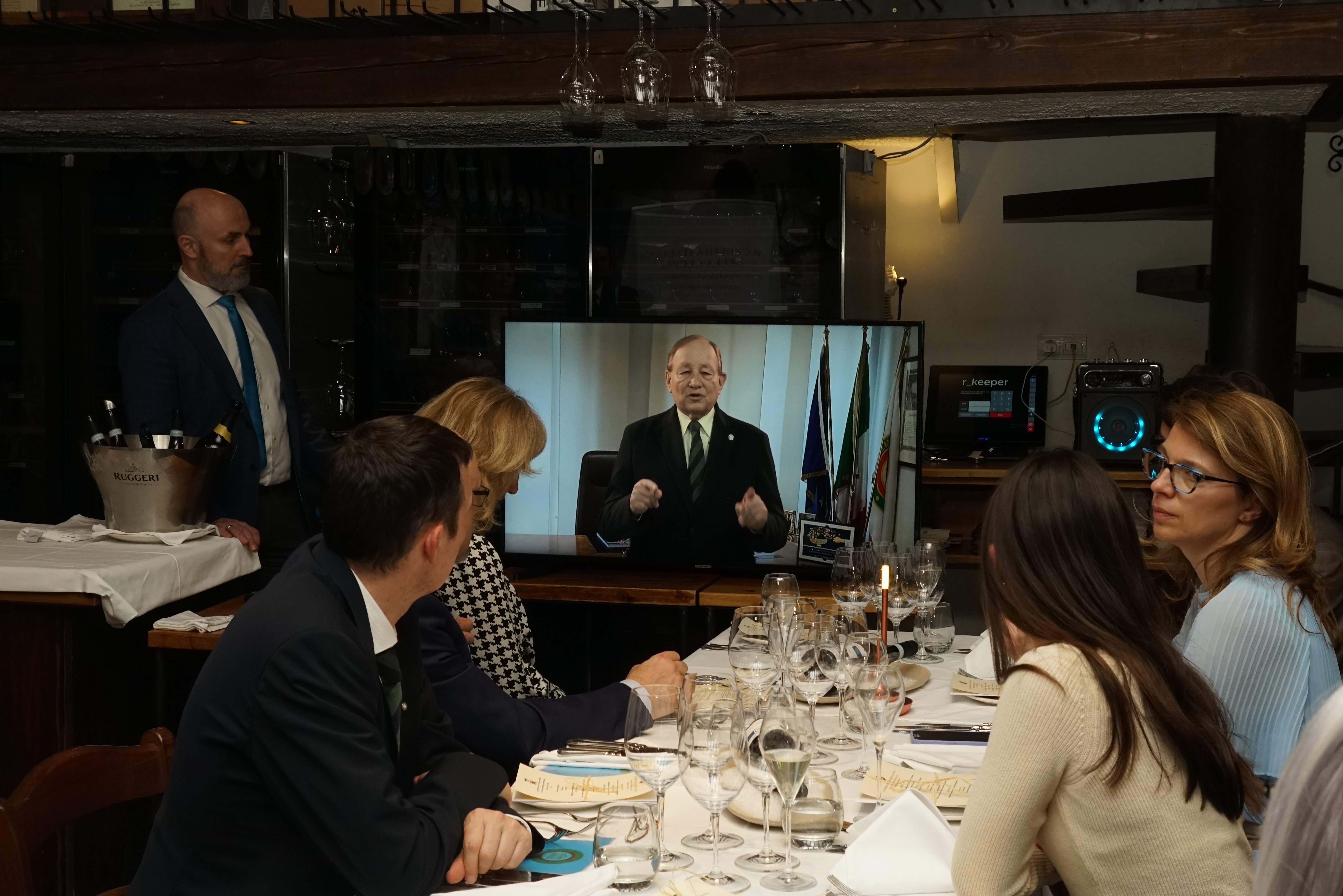 Il Simposiarca Herman Zaaiman ha aperto la serata con un intervento, colto e divertente al tempo stesso, sul tema della "Cultura della tavola imbandita". Herman Zaaiman, esperto di argenteria e di antichità, ha raccontato con passione e coinvolgimento come - in tutte le epoche storiche – il gusto e le tecnologie del tempo abbiano creato stili e costumi differenti nella decorazione e nel servizio a tavola. Durante tutte le epoche storiche, stili e costumi evolvono seguendo lo stesso filo conduttore: il desiderio di mostrare la bellezza e l’eleganza sulla tavola come cornice di accoglienza degli ospiti e decorazione delle vivande. La relazione è stata accompagnata dalla proiezione di una bella raccolta di immagini provenienti da musei e pubblicazioni dell’autore Christian Baur, presente alla riunione conviviale. Questo primo convivio del 2026 ha fornito l’occasione per dare il benvenuto al neo Accademico Giuseppe Gullo, accolto dall’inizio dell’anno. L’incontro si è tenuto presso il ristorante dello Schlosshotel Grünwald, un locale che la Delegazione non visitava da molti anni. Il gestore li ha accolti con molta attenzione in una sala a loro dedicata.