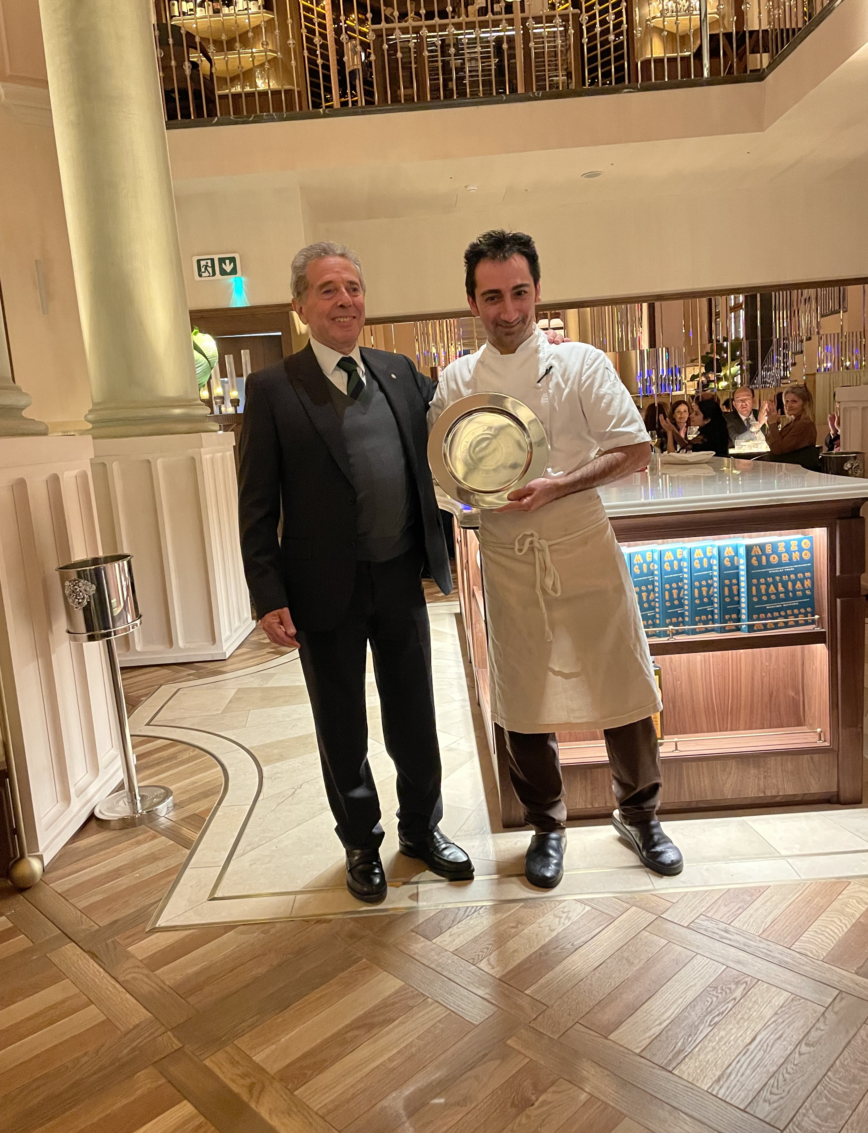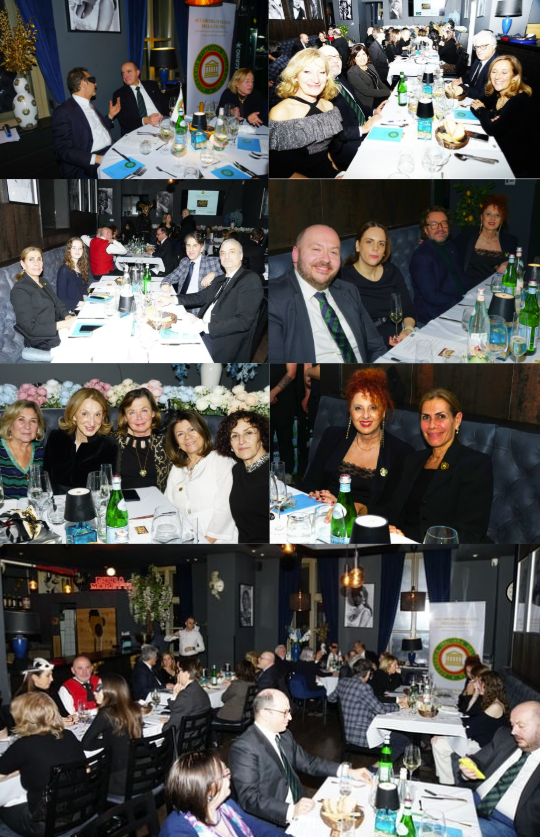 La sera del 26 gennaio 2026, circa settanta partecipanti della Delegazione di Londra si sono riuniti presso il Corinthia Hotel per celebrare il ritorno dello chef Francesco Mazzei sulla scena londinese con il nuovo ristorante Mezzogiorno by Francesco Mazzei, affacciato sul Tamigi. Tra i presenti il Console Generale Domenico Bellantone, il Direttore ICE/ITA Giovanni Sacchi, la Console Rossella Gentile e l’Addetto al coordinamento di polizia e giudiziaria dell’Ambasciata d’Italia Federico Sciaudone. È stato degustato un menu di grande raffinatezza e autenticità, aperto da assaggi di tonno piccante, pizzette con ’nduja al miele e arancini al pomodoro, in abbinamento a La Scolca Brut bianco e rosé. Sono seguite lasagnette ai carciofi romani e ombrina al forno con salsa verde e caponata siciliana, accompagnate da Gavi di Gavi Etichetta Nera e Chianti Riserva Castello di Albola, piatti che hanno raccolto ampi consensi. Il dessert ha previsto sorbetto al mandarino e torta al cioccolato amaro, abbinati a Sauvignon Ca’ Bolani. "Mezzogiorno" è stato definito dallo chef una “trattoria elegante”, con una cucina che valorizza i sapori tradizionali della sua terra. La serata, di grande successo, ha visto Francesco Mazzei intrattenersi tra i tavoli illustrando i piatti. Applausi finali al personale di sala e alla Simposiarca Silvia Mazzola; il Delegato ha quindi consegnato il piatto ricordo dell’Accademia al resident chef Francesco Chiarelli, storico collaboratore di Mazzei.