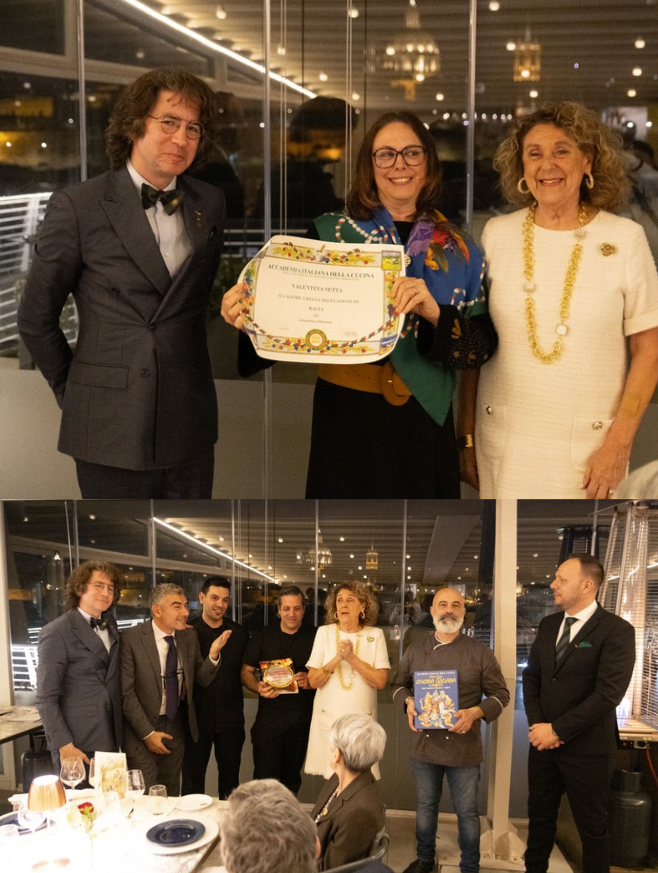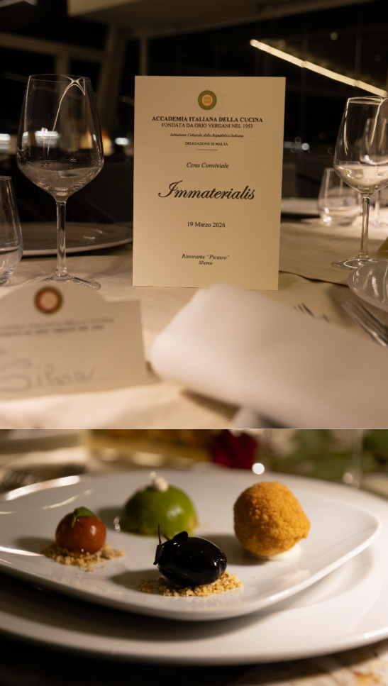 Un’atmosfera elegante e carica di emozione ha accompagnato l’Ecumenica Straordinaria ospitata dal ristorante Picasso, organizzata per celebrare il prestigioso riconoscimento Unesco alla cucina italiana. La sala, con ampie vetrate affacciate su La Valletta, ha fatto da suggestiva cornice a un evento capace di unire convivialità ed emozione, espressione del “saper vivere” italiano. La serata si è aperta con l’ascolto di Vai Italia, brano interpretato da Al Bano con il Piccolo Coro dell’Antoniano, che ha accompagnato il percorso della candidatura. Spunto, per la Delegata, per raccontare il lungo lavoro dell’Accademia per raggiungere questo traguardo e le motivazioni del riconoscimento. Protagonista il menu curato da chef Claudio Schiavone, coadiuvato da chef Emanuele Valerio e con la collaborazione di chef Maurizio Coco, patron del ristorante: un viaggio tra i sapori italiani, dal cappon magro alle alici in saor, dalla pappa al pomodoro al risotto, fino allo stracotto e alla pasticceria siciliana, in un racconto di tradizioni e territori. Gli Accademici hanno presentato piatti e vini, arricchendoli di curiosità e riferimenti culturali. A metà serata Giovanni Costantino ha intrattenuto i presenti con ironia e riflessione sul legame tra cucina, storia, arte e scienza. A suggellare la serata sono state infine gli ingressi ufficiali dei nuovi Accademici Daniela Primiani, Nerio Buzio e Gianni Stefanelli e della nomina, ad Accademica Onoraria, di S. E. l’Ambasciatrice Valentina Setta. Un momento solenne che ha conferito ulteriore prestigio a un evento di cui la Delegazione di Malta può, a pieno titolo, dirsi orgogliosa.