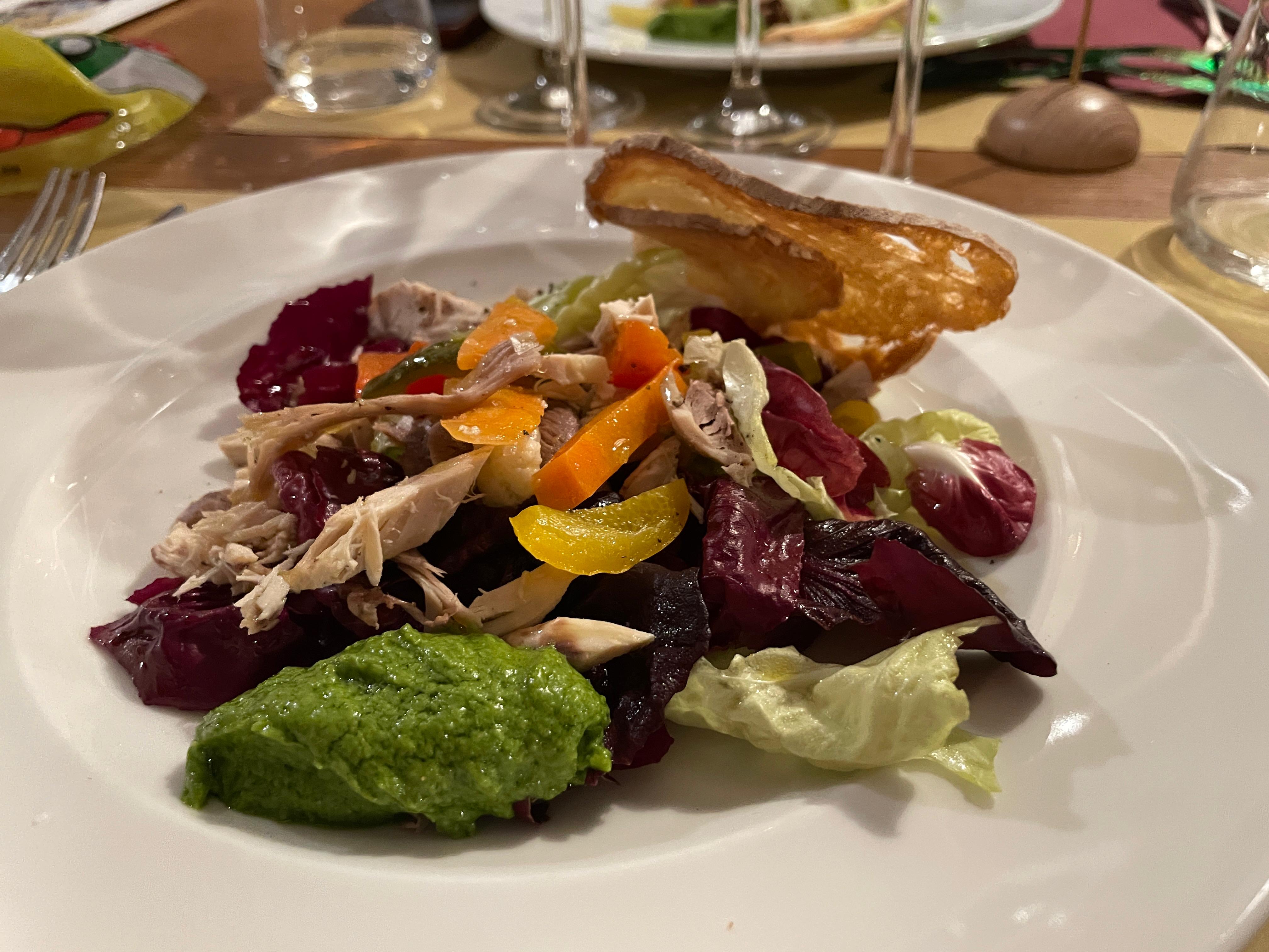 Dopo la tradizionale bagna cauda di gennaio, la Delegazione di Biella ha onorato il fritto misto piemontese. Il convivio si è svolto presso l’Osteria della Villa a Castellengo, un piccolo borgo dominato da un imponente castello. Il locale si trova all’interno di un antico caseggiato dell’800 che conserva stanze decorate ed affrescate ed offre una calda atmosfera. La cena si è basata esclusivamente sul piatto principe della cucina piemontese illustrato dalla Delegata Marialuisa Bertotto che ne ha raccontato l’origine storica, l’evoluzione, gli ingredienti classici e modaioli, le varianti regionali e la tecnica di cottura. Prima del fritto misto, gli Accademici hanno gustato una deliziosa cipolla cotta al forno per poi passare ad abbondanti porzioni dei tradizionali ingredienti di fritti: milanese di vitello, di pollo, e di maiale impanata in grattato di grissini, salsiccia, cervella, filone, granelli, fegato, cavolfiore, carota, zucchina, amaretto, semolino dolce, mela. Ha accompagnato la cena un vino del territorio. È stata una serata piacevole, armoniosa ed informale che si è conclusa con i ringraziamenti al gestore e cuoco Elion Keci al quale la Delegata Bertotto ha consegnato il piatto 2026 dell’Accademia.