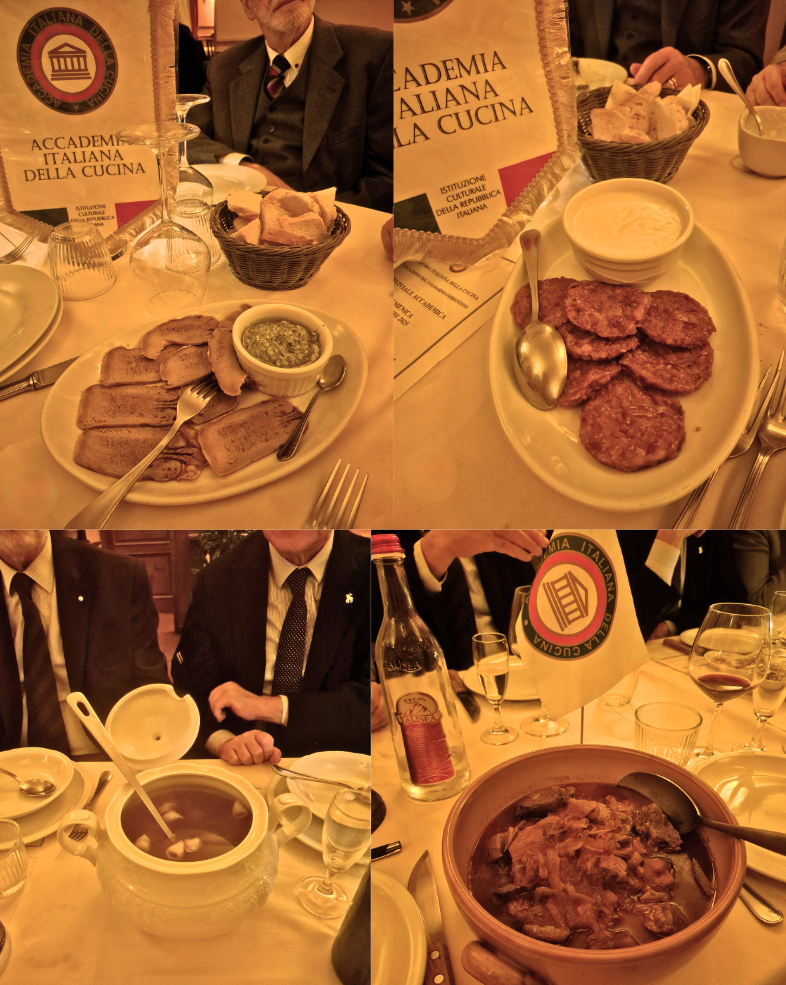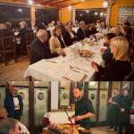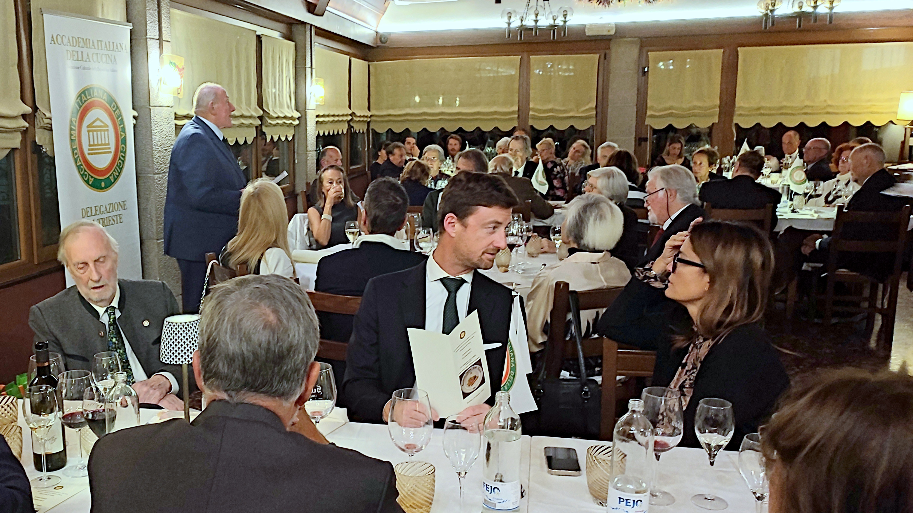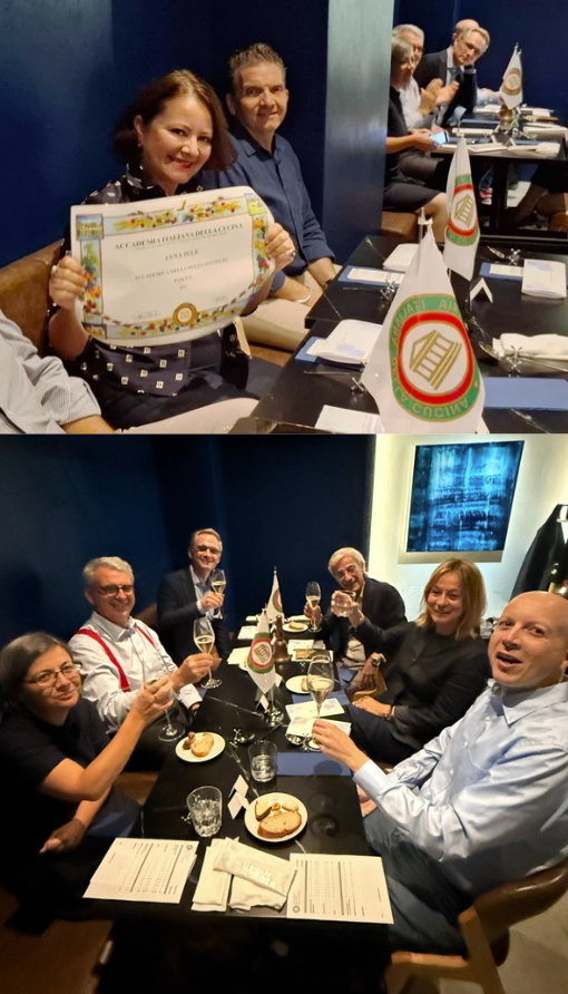 La Cena Ecumenica della Delegazione di Monaco di Baviera si è svolta in un clima di grande convivialità presso l’Osteria Italiana, il più antico ristorante italiano ancora attivo in Germania, fondato nel 1890. Durante la serata sono stati consegnati due riconoscimenti: l’Attestato di Benemerenza a Beppe Cannici, per i quarant’anni di appartenenza all’Accademia, e il Diploma di Appartenenza venticinquennale ad Eva Janda. Entrambi hanno espresso gratitudine verso l’istituzione e gli altri membri, sottolineando il ruolo dell’Accademia nella diffusione della cultura gastronomica italiana. Stephanie Deiters, Simposiarca dell’evento, insieme al gestore Prisco De Stefano e allo chef Umberto Bressanin, ha sviluppato il tema dell’anno proponendo un bollito misto servito al carrello, accompagnato da salse preparate in cucina. Il menù, aperto e concluso da portate dai sapori autunnali e da un primo dedicato alle carni arrosto, ha ottenuto grande apprezzamento, anche per la scenografia del bollito e la preparazione a vista dello zabaione. L’abbinamento dei vini e l’eccellente servizio di sala hanno completato la serata.
