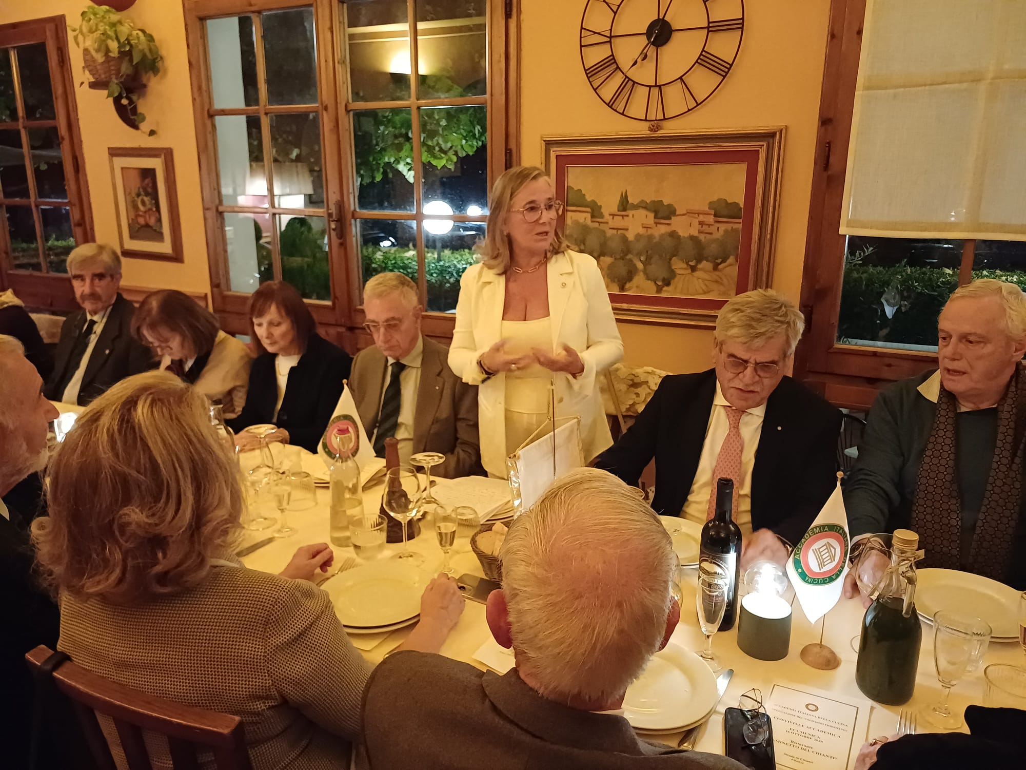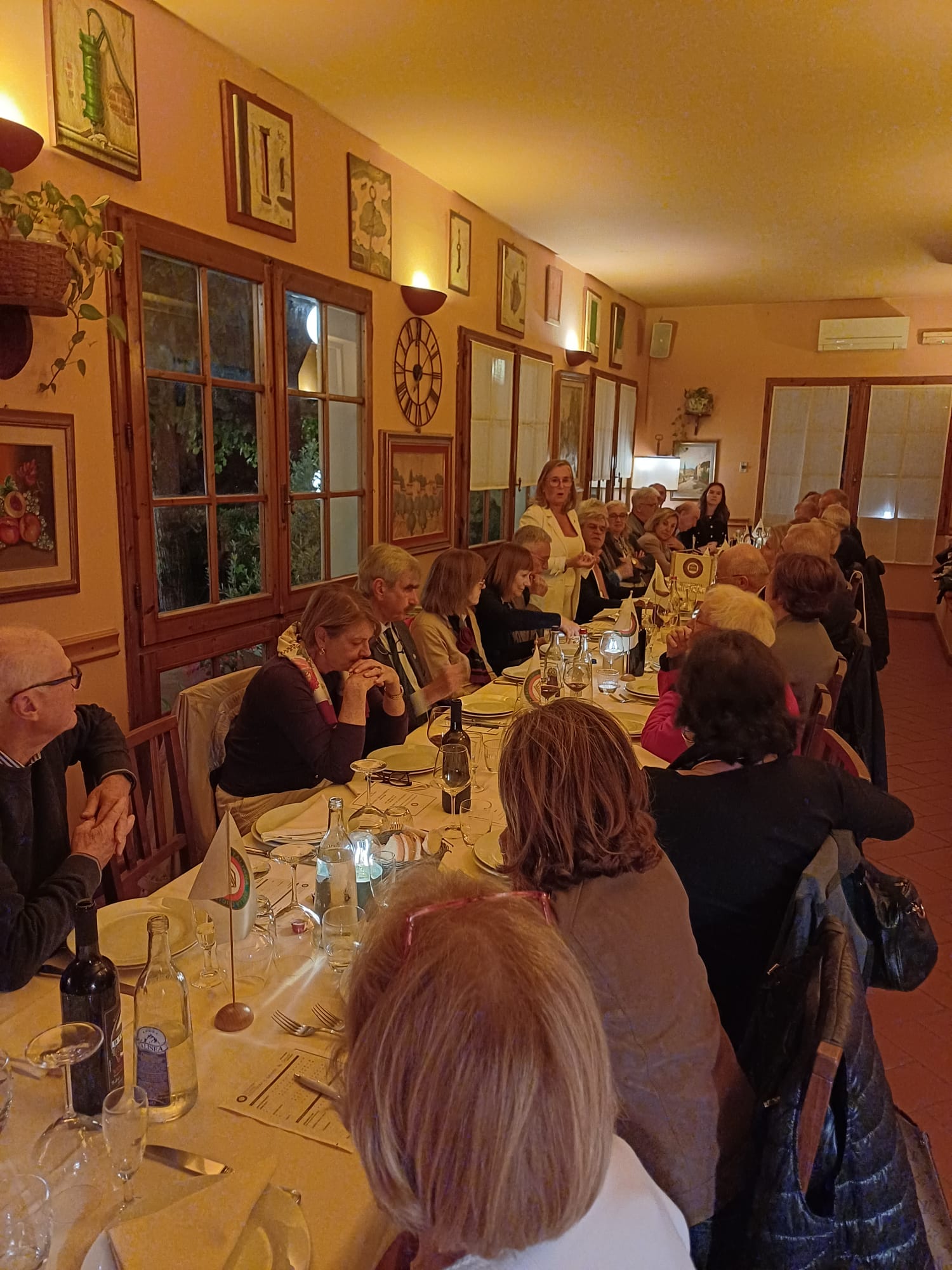 La tradizionale cena ecumenica della Delegazione reatina si è svolta alla trattoria “La Palazzina” di Rieti. Dopo i saluti del Delegato Francesco Maria Palomba e la presentazione del menu nella veste di Simposiarca, l’Accademica Valeria Lettera ha tenuto un intervento culturale. I vini sono stati illustrati da Enrico Maria Concutelli, responsabile di area della Cantina Casale del Giglio. Tra i partecipanti: il Prefetto di Rieti Pinuccia Niglio, il Colonnello Valerio Marra, il Colonnello Gianluca Ferraro e il Dr. Michele Tota, Vice Questore Vicario. Dopo l’aperitivo di polpettine fritte di “allesso”, i partecipanti hanno degustato le porchette PAT di Selci (Giorgio Giorgini), Poggio Bustone (Oreste Battisti) e Cantalice (Enzo Crosti), accompagnate da una giardiniera e da altre preparazioni della chef Oksana Pidhorodetska, eccellente interprete della cucina reatina. Il menù comprendeva polenta in umido con spuntature, salsicce, polpettine e pancetta; “allesso” di gallina, lingua, cotechino, muscolo e biancostato con varie salse; zampetti con salsa verde; patate lesse e fagiolini; e crostata di mele cotogne secondo la ricetta di Bartolomeo Scappi. In abbinamento, i vini di Casale del Giglio.