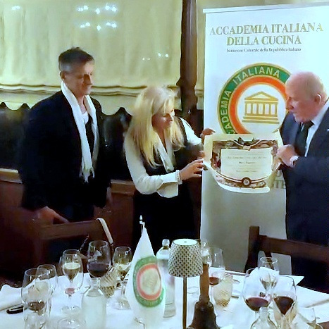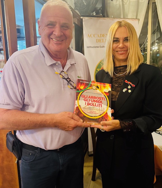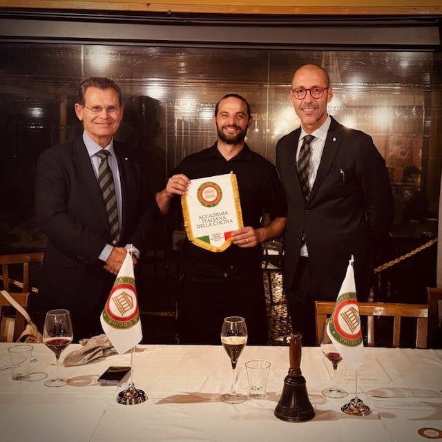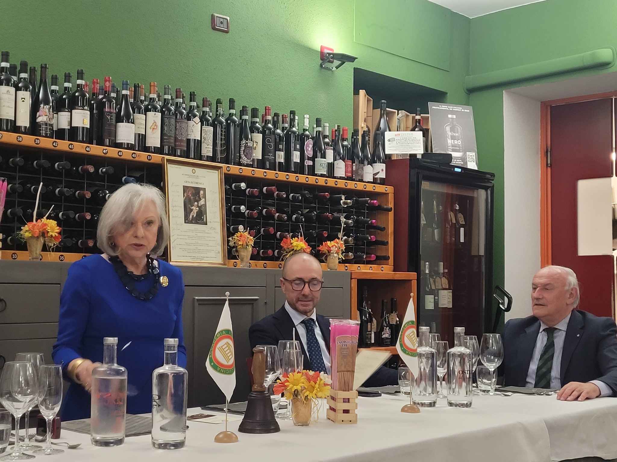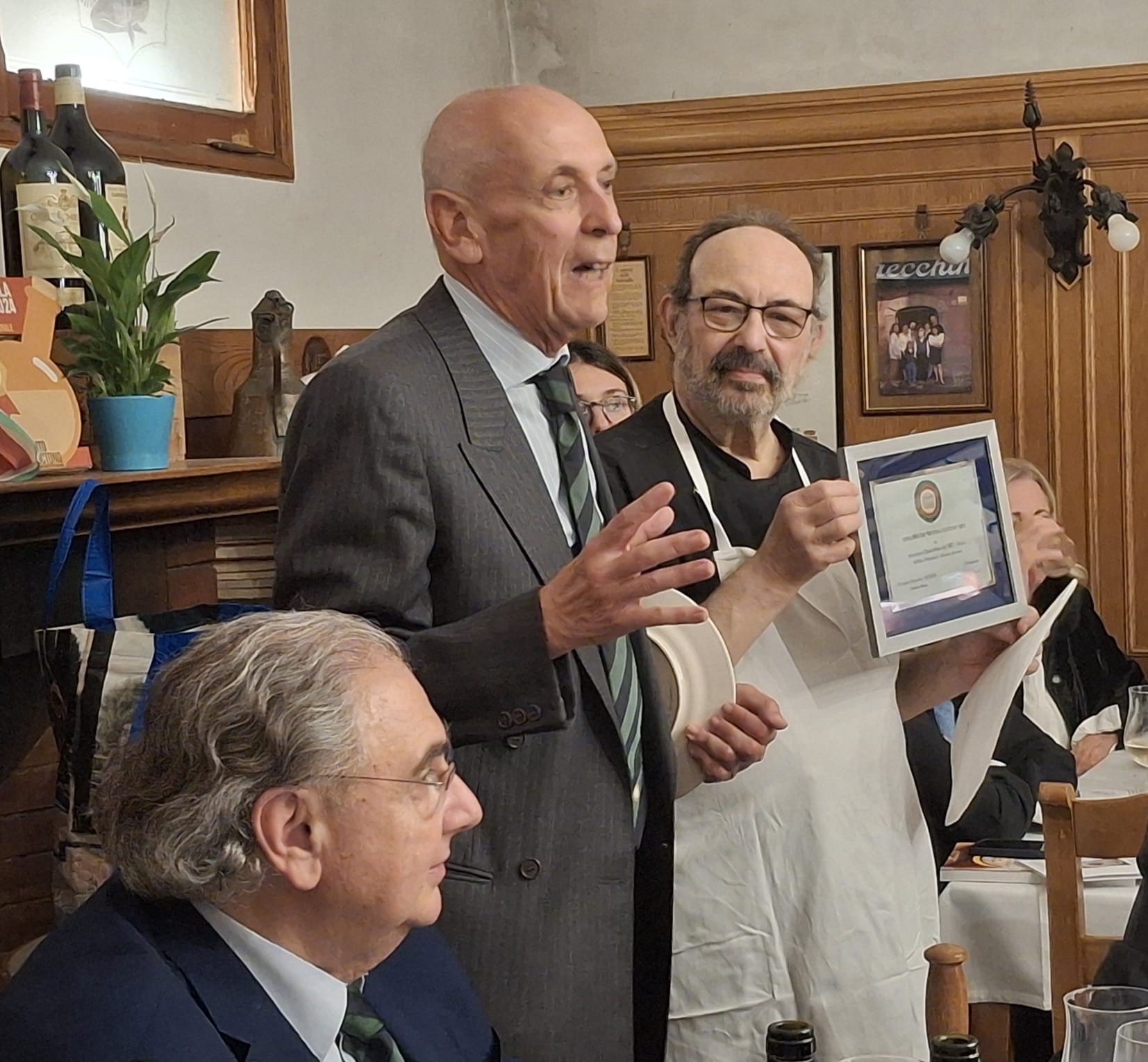 In occasione della cena ecumenica, il Delegato di Roma Eur-Ostiense, Claudio Nacca, ha consegnato il Diploma di Buona Cucina ai fratelli Ennio, Francesco e Marina Mariani, quinta generazione alla guida dello storico locale "Checchino dal 1887", mentre in sala si affaccia già la sesta con i figli di Marina e Francesco. Il riconoscimento premia l’eccellente cucina di Ennio e la custodia della tradizione romanesca, legata alle carni e al celebre quinto quarto: la leggenda vuole che proprio qui sia nata la coda alla vaccinara, creata agli inizi del Novecento dalla bisnonna Fermina. L’ambiente celebra la romanità con il soffitto a botte, gli arredi storici e le stampe originali di Pinelli, donate ai genitori dei fratelli Mariani da Giuseppe Ceccarelli, giornalista nonché primo Delegato dell’Accademia Italiana della Cucina di Roma. Checchino, quindi, è anche la casa della Delegazione romana sin dalla sua fondazione, oltre settant’anni fa. Per questo la Delegazione Roma Eur-Ostiense, competente per territorio, ha voluto condividere la cena ecumenica 2025 con la Delegazione di Roma. Durante la serata, il Delegato di Roma, Giuseppe Florio, ha consegnato i diplomi per i quarant’anni di appartenenza agli Accademici Paolo Basili e Francesco Ricciardi, accolti da calorosi applausi. La Direttrice del CST di Roma, Silvia De Vincentiis, ha infine illustrato il volume dedicato al tema ecumenico dell’anno: “Gli arrosti, gli umidi e i bolliti nella cucina della tradizione regionale”, con un approfondimento sulla Città metropolitana di Roma.