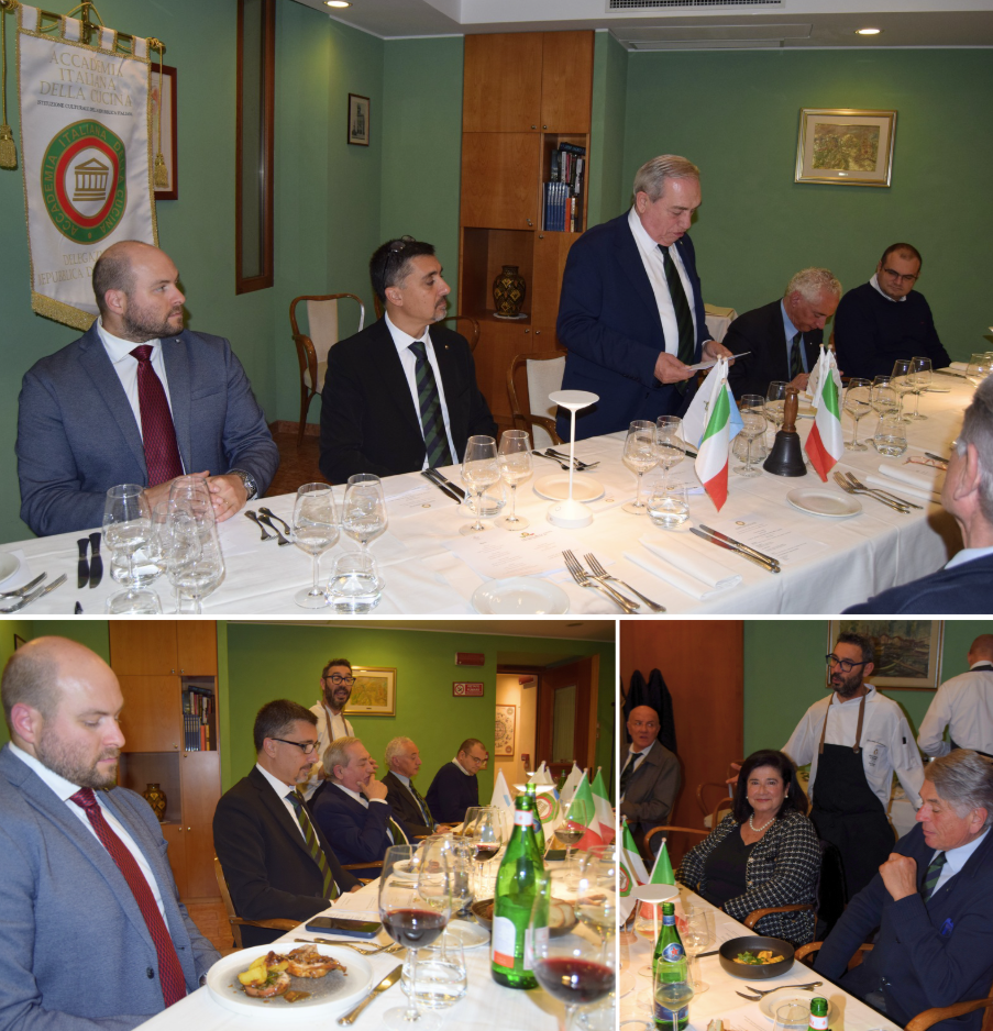 Lo chef Walter Miculan del ristorante L’Italiano dell’Hotel Concorde ha interpretato magistralmente il tema dell’anno, combinando in modo innovativo elementi della tradizione, come il risotto allo zafferano con guanciale di manzo o il petto di manzo, proposto brasato anziché tradizionalmente lessato con salsa verde, e inserendo sorprendenti guizzi di creatività, come il pepe rosa sulla panna cotta. Il ristorante, situato all’interno dell’Hotel Concorde nella zona di Heliopoli, offre un ambiente accogliente. Lo chef ha raccontato con passione il suo percorso professionale, che include una lunga carriera in diversi Paesi, tra cui le Figi, e ha illustrato con entusiasmo i punti salienti dei piatti presentati. La riunione è stata anche l’occasione per consegnare il materiale associativo a diversi nuovi Accademici. Simposiarchi dell'evento sono stati il Legato Massimo Acciarini e l'Accademica Rossella Fanelli.
