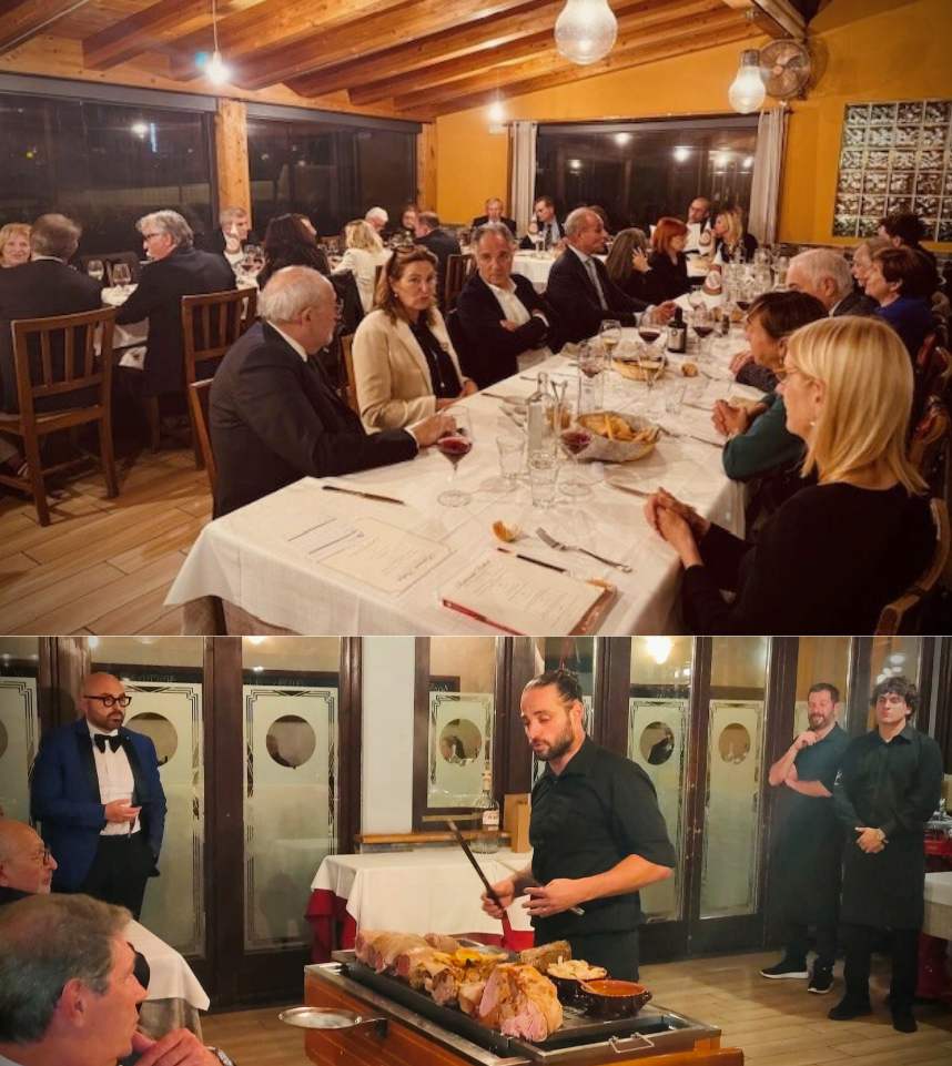Cena ecumenica al ristorante La Kiuva di Arnad con un menu predisposto dal Simposiarca Cesarino Collé rigorosamente a base del tema della serata: finissima di carne salée con insalata croccante e dressing di noci; bis di pappardelle al ragù di cinghiale e gnocchetti di castagne con fonduta al Bleu d’Aoste; carbonade di manzo cotto allo Chardonnay con polenta; torta di compleanno della Delegazione Monterosa. Al termine della serata, l’Accademico Robert Rosset ha presentato l’edizione 2025 del volume della Biblioteca di Cultura Gastronomica dell’Accademia intitolato “Gli arrosti, gli umidi, i bolliti nella cucina della tradizione regionale”. Oltre alla cena ecumenica gli Accademici hanno festeggiato la ricorrenza dei venti anni della Delegazione Monterosa con una meravigliosa torta preparata per l’occasione da Gloria della pasticceria Gatò di Aosta. Gradito ospite, il Presidente della Regione Valle d’Aosta Renzo Testolin, da sempre amico della Delegazione e dell’Accademia Italiana della Cucina.