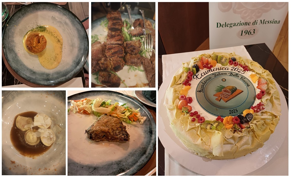 Per celebrare l’Ecumenica 2025 gli Accademici si sono ritrovati al Toronero, ristorante bisteccheria, visitata in passato e dove fu celebrata l’Ecumenica 2019 (sul tema pasta fresca ripiena e gli gnocchi). Il ristorante, guidato dai patron Francesco Vinci e Fabrizio La Rosa, si è raccontato attraverso le peculiarità della cucina dello chef Mirko Cannata con piatti della tradizione a base di carni di qualità. Il Delegato ha presentato il tema dell’anno e il componente il CST Sicilia orientale, Saverio Pugliatti, ha illustrato i contenuti delle declinazioni regionali oggetto del XII volume della Biblioteca di Cultura Gastronomica. Sono stati serviti: flan di zucca rossa con colatura di Parmigiano 24 mesi alla zafferano, bottoni di pasta fresca farciti con stracotto di manzo, fondo bruno, petali di pomodoro e pecorino siciliano. Particolarmente apprezzato il bollito ammollicato ricordo di un’antica ricetta messinese “canni bugghiuta e ‘rrustuta”, che gioca il suo appeal su contrasti e consistenze: morbido dentro e croccante fuori con l’abbrustolito della carne grigliata che si sposa alla dolcezza di quella bollita. Dopo la grigliata con braciole alla messinese e l’arrosto di scottona siciliana, la torta Ecumenica al limone della pasticceria Ragusa. La scelta del menu e della cantina è stata condivisa dagli Accademici e approvata dal Delegato e dalla Consulta, con la consegna della vetrofania e del volume tematico dell’Ecumenica.
