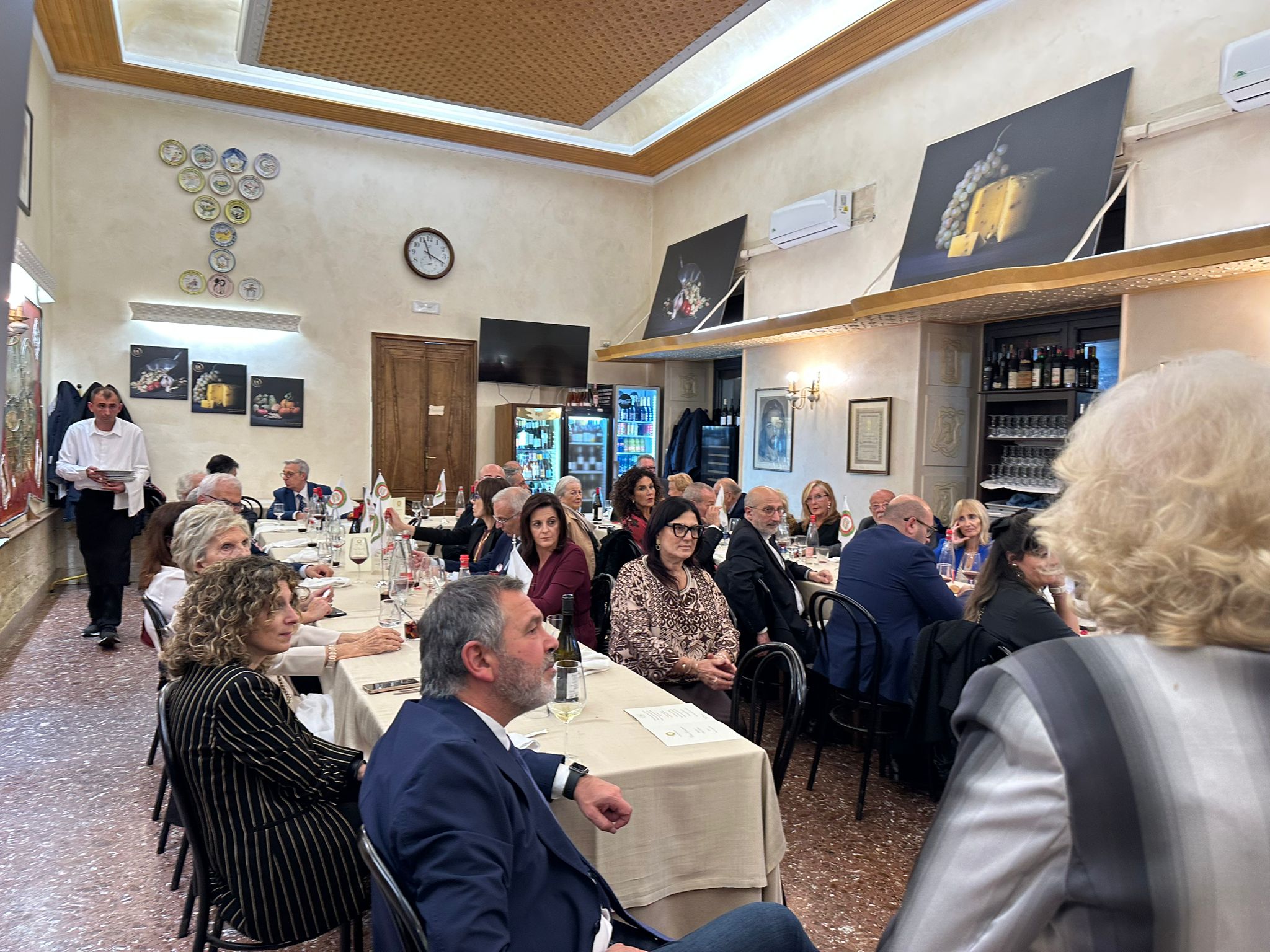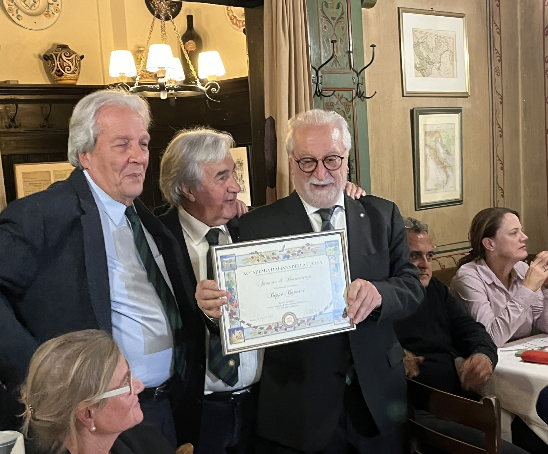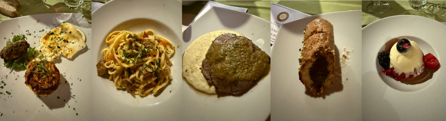 La Cena Ecumenica della Delegazione di Monaco di Baviera si è svolta in un clima di grande convivialità presso l’Osteria Italiana, il più antico ristorante italiano ancora attivo in Germania, fondato nel 1890. Durante la serata sono stati consegnati due riconoscimenti: l’Attestato di Benemerenza a Beppe Cannici, per i quarant’anni di appartenenza all’Accademia, e il Diploma di Appartenenza venticinquennale ad Eva Janda. Entrambi hanno espresso gratitudine verso l’istituzione e gli altri membri, sottolineando il ruolo dell’Accademia nella diffusione della cultura gastronomica italiana. Stephanie Deiters, Simposiarca dell’evento, insieme al gestore Prisco De Stefano e allo chef Umberto Bressanin, ha sviluppato il tema dell’anno proponendo un bollito misto servito al carrello, accompagnato da salse preparate in cucina. Il menù, aperto e concluso da portate dai sapori autunnali e da un primo dedicato alle carni arrosto, ha ottenuto grande apprezzamento, anche per la scenografia del bollito e la preparazione a vista dello zabaione. L’abbinamento dei vini e l’eccellente servizio di sala hanno completato la serata.