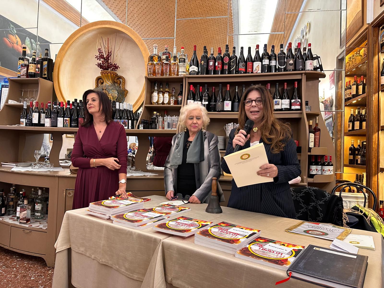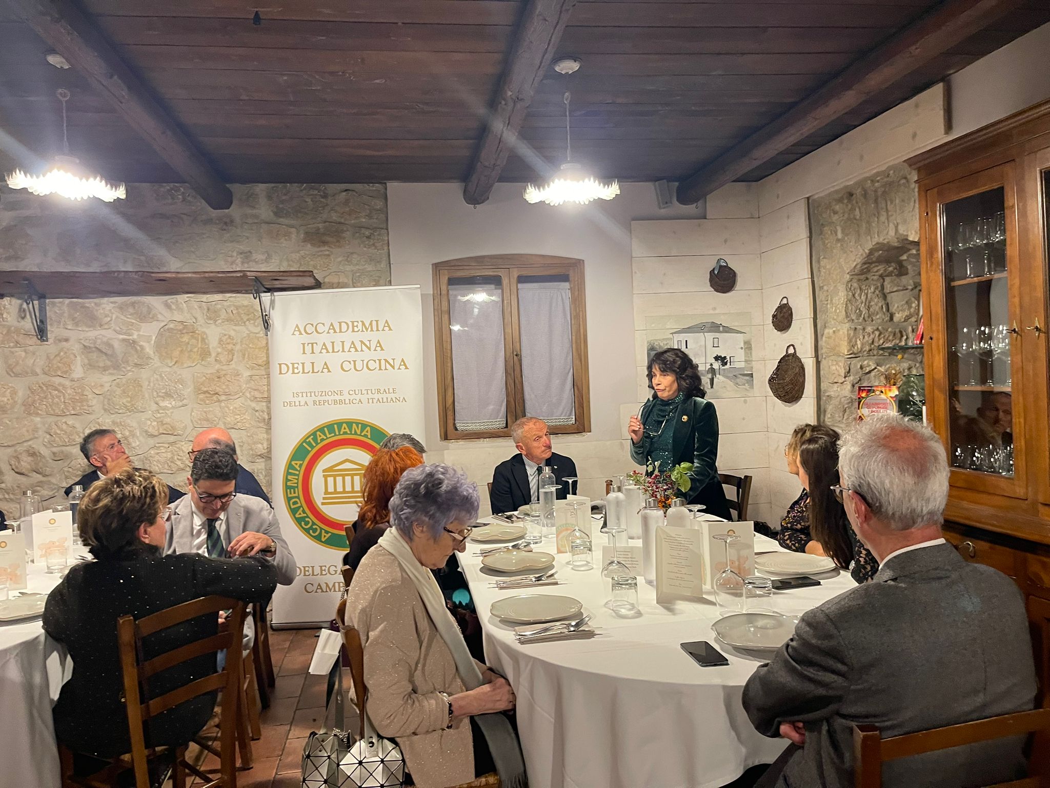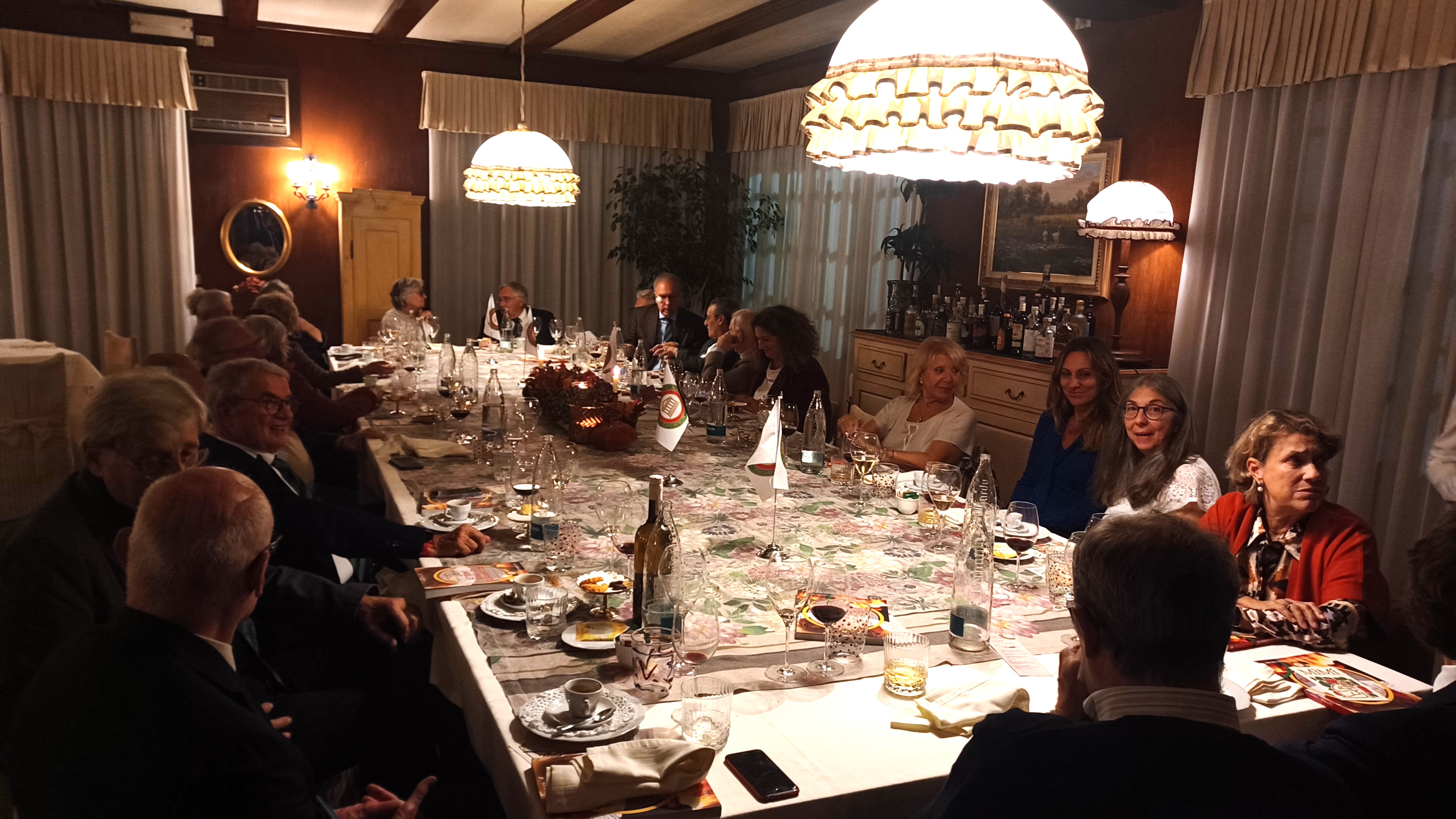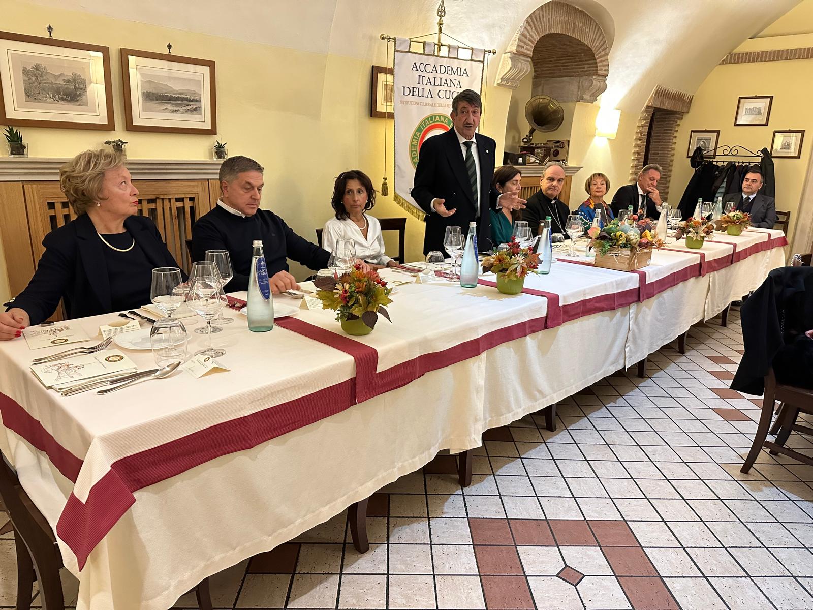 La tradizionale cena ecumenica della Delegazione reatina si è svolta alla trattoria “La Palazzina” di Rieti. Dopo i saluti del Delegato Francesco Maria Palomba e la presentazione del menu nella veste di Simposiarca, l’Accademica Valeria Lettera ha tenuto un intervento culturale. I vini sono stati illustrati da Enrico Maria Concutelli, responsabile di area della Cantina Casale del Giglio. Tra i partecipanti: il Prefetto di Rieti Pinuccia Niglio, il Colonnello Valerio Marra, il Colonnello Gianluca Ferraro e il Dr. Michele Tota, Vice Questore Vicario. Dopo l’aperitivo di polpettine fritte di “allesso”, i partecipanti hanno degustato le porchette PAT di Selci (Giorgio Giorgini), Poggio Bustone (Oreste Battisti) e Cantalice (Enzo Crosti), accompagnate da una giardiniera e da altre preparazioni della chef Oksana Pidhorodetska, eccellente interprete della cucina reatina. Il menù comprendeva polenta in umido con spuntature, salsicce, polpettine e pancetta; “allesso” di gallina, lingua, cotechino, muscolo e biancostato con varie salse; zampetti con salsa verde; patate lesse e fagiolini; e crostata di mele cotogne secondo la ricetta di Bartolomeo Scappi. In abbinamento, i vini di Casale del Giglio.
