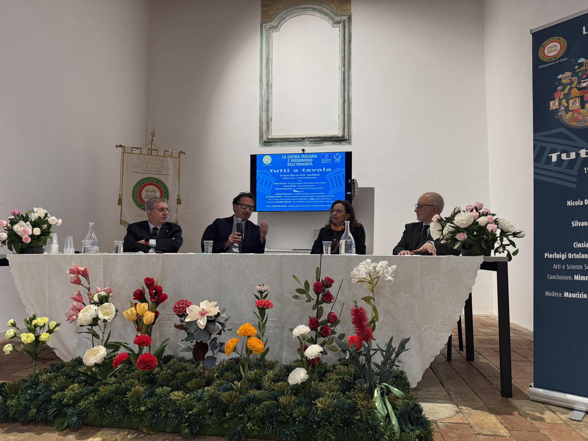 La Delegazione di Chieti ha scelto il borgo medievale di Bucchianico per celebrare il prestigioso riconoscimento della cucina italiana a Patrimonio Immateriale dell’Umanità UNESCO. Alla presenza del prefetto, Silvana D’Agostino, del soprintendente archeologico, paesaggio e belle arti, Chiara Del Pino, e del sindaco, Renzo Di Lizio, si è svolto, all’interno della biblioteca civica, nel complesso dell’ex chiesa medievale di Sant’Antonio, un convegno che ha approfondito il valore della tavola non come mero ricettario, ma come mosaico di tradizioni e linguaggio universale. Dopo il messaggio del Presidente Paolo Petroni, dagli interventi dei relatori — tra cui Cinzia Di Vincenzo, presidente del Club per l’UNESCO di Chieti, e il prof. Pierluigi Ortolano per l’aspetto linguistico — è emerso come l’identità nazionale si fondi su una convivialità domestica da proteggere. Il Vice Presidente Vicario, Mimmo D’Alessio, ha ricordato la responsabilità degli accademici come “sentinelle del gusto” nel tramandare questo patrimonio vivo. La giornata si è conclusa con la riunione conviviale presso il Ristorante “Da Silvio”, dove Gianluca Tucci e la chef Alessia Cicchini, sotto la supervisione del Simposiarca Gerardo Di Cola, hanno reso omaggio al traguardo raggiunto, proponendo un menu della tradizione teatina, espressione autentica di quella cultura e cura dell’altro che l’UNESCO ha oggi ufficialmente consacrato al mondo.