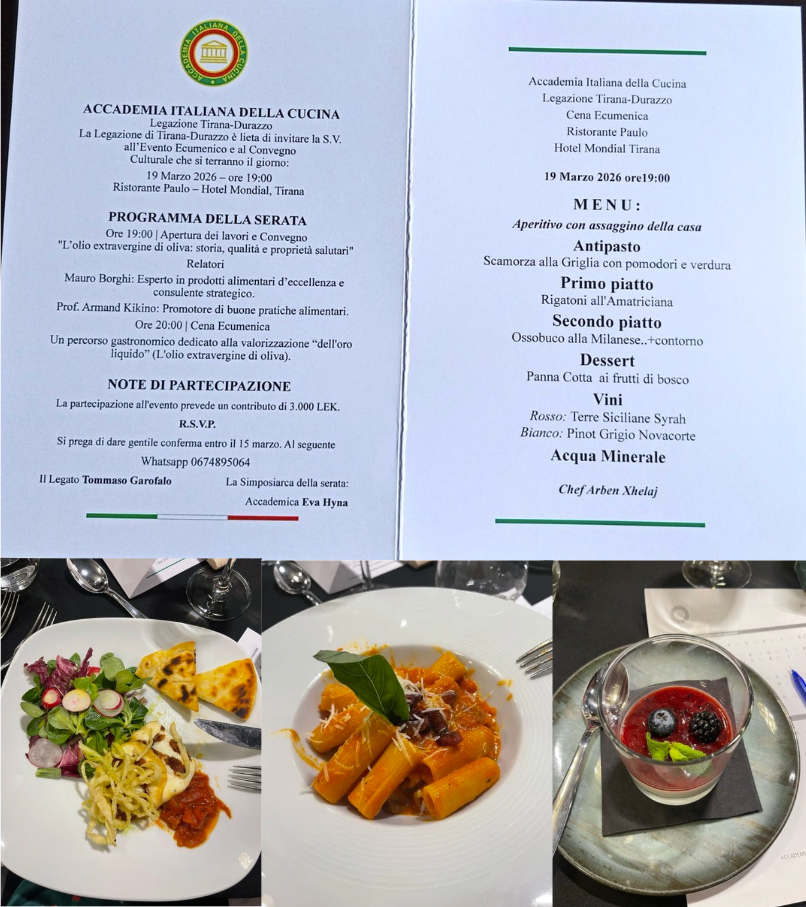 Si è svolta presso il Ristorante Paulo dell’Hotel Mondial di Tirana la Cena Ecumenica Straordinaria, organizzata per celebrare il prestigioso riconoscimento della cucina italiana quale Patrimonio Immateriale dell’Umanità da parte dell’UNESCO. L’evento è stato preceduto da un convegno sul tema “L’olio extravergine di oliva: storia, qualità e proprietà salutari”. La celebrazione ha rappresentato un momento di profondo significato, sottolineando il valore culturale e identitario della tradizione gastronomica italiana. La prestigiosa cornice dell’Hotel Mondial ha ospitato una serata che ha confermato l’impegno della Legazione nel promuovere e tutelare l’identità gastronomica italiana in Albania.