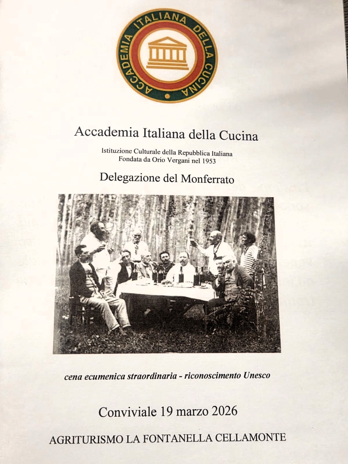 Il Delegato del Monferrato, Pietro Caire, ha riunito il gruppo degli Accademici per celebrare la riunione conviviale ecumenica straordinaria, a seguito del riconoscimento UNESCO che ha sancito l’ingresso della cucina italiana nel novero dei patrimoni immateriali dell’umanità. Il convivio si è svolto a Cellamonte, uno dei borghi più belli d’Italia, precisamente presso l’agriturismo La Fontanella. Qui, dopo un piacevole confronto sui riconoscimenti UNESCO già acquisiti dal territorio monferrino — per la cerca dei tartufi e per gli infernot — si è approfondito il tema dell’Ecumenica e si è potuto gustare, dopo i rituali antipasti, un grandioso fritto misto. L’atmosfera festosa, animata da oltre trenta partecipanti, si è arricchita di riflessioni dedicate alla festa del papà e al tradizionale pranzo domenicale nel Monferrato, vera “icona” di tradizione, gusti e sapori.