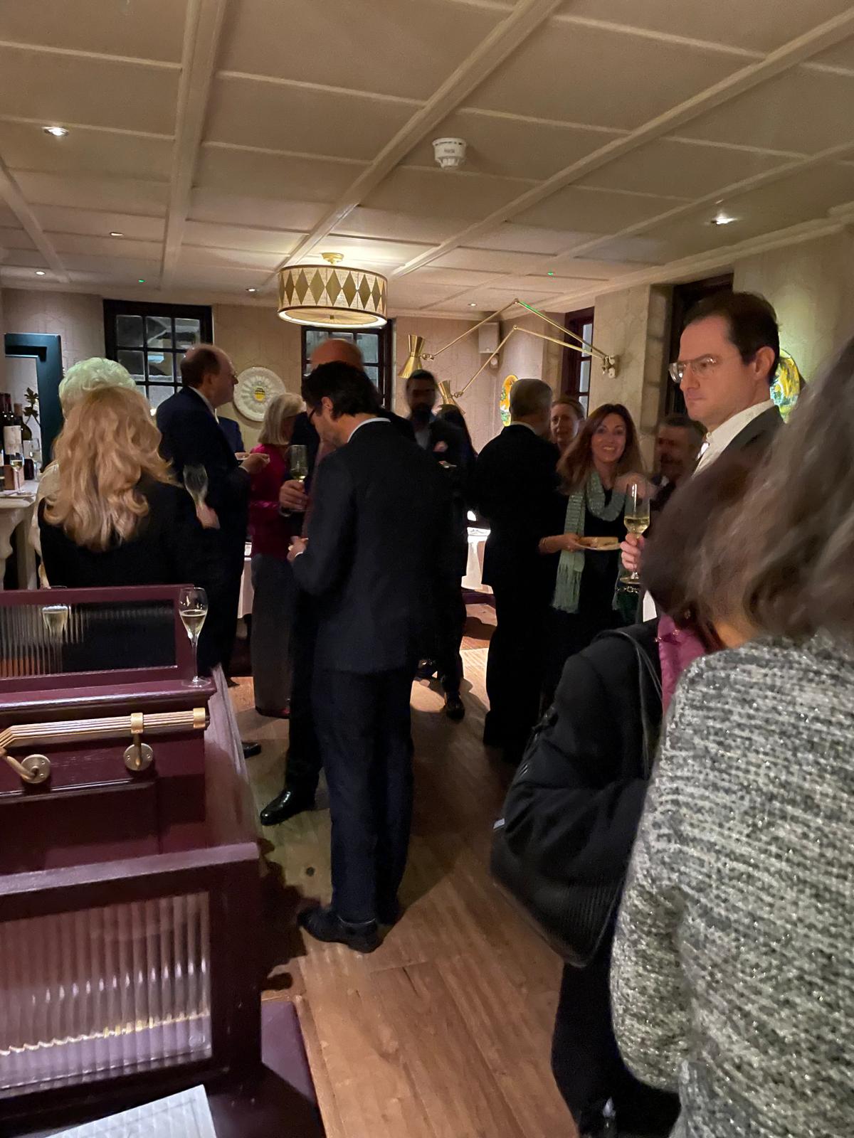 Gli Accademici della Delegazione di Londra e alcuni ospiti, tra cui il Console Generale Domenico Bellantone e consorte, si sono riuniti nei locali della Cantinetta Antinori, ristorante dell’omonima nobile famiglia, per celebrare la Conviviale Ecumenica 2025. Dopo un ricco aperitivo con prodotti tipici toscani, il Delegato ha presentato il volume redatto quest’anno dall’Accademia Italiana della Cucina "Gli Arrosti, Gli Umidi, I Bolliti" illustrando alcune ricette tipiche regionali e la loro evoluzione nel tempo. È stato quindi servito un menu di grande tradizione piemontese e toscana: salumi e formaggi della zona, crostini con pomodorini e basilico; a seguire agnolotti del plin con sugo d’arrosto e arrosto di fesa di manzo, in armonia con il tema della Conviviale, accompagnati da contorni di patate novelle e broccoletti con peperoncino dolce. Entrambi i piatti hanno suscitato commenti entusiasti, così come i cantucci fatti in casa con vin santo. Ottima la selezione dei vini della Cantina Antinori, serviti durante l’aperitivo e la cena. La serata, all’insegna della convivialità e dell’allegria, si è conclusa con un caloroso applauso allo chef Luigi Borelli, al quale il Delegato ha consegnato il piatto ricordo dell’Accademia, e a tutto il personale, nonché alle Simposiarche Silvia Mazzola e Jacqueline McKay per l’impeccabile organizzazione della Cena Ecumenica 2025.