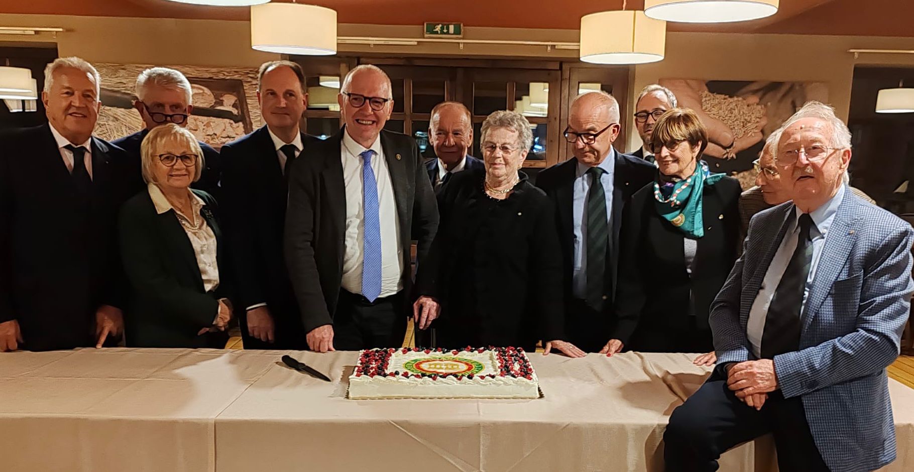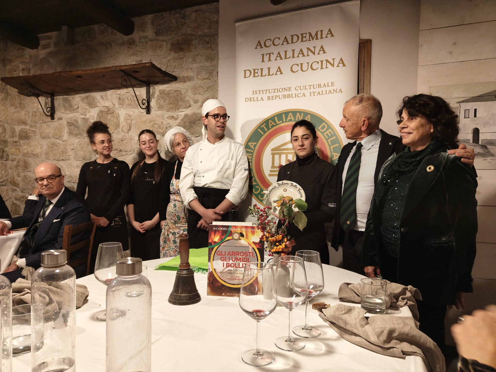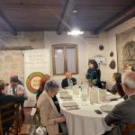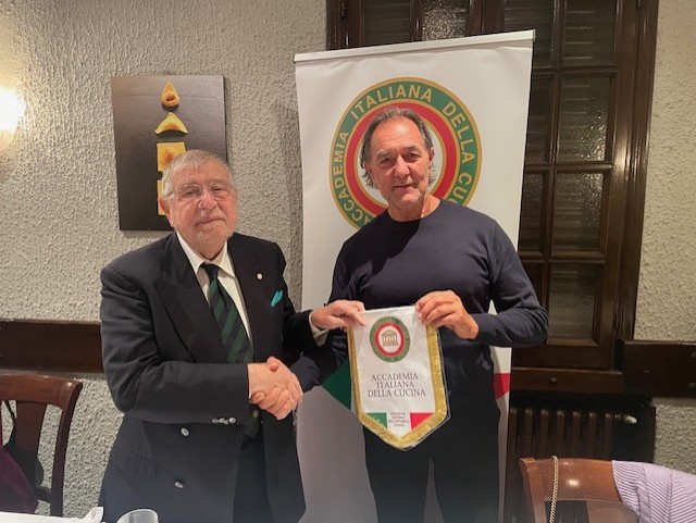 Cena ecumenica al ristorante La Kiuva di Arnad con un menu predisposto dal Simposiarca Cesarino Collé rigorosamente a base del tema della serata: finissima di carne salée con insalata croccante e dressing di noci; bis di pappardelle al ragù di cinghiale e gnocchetti di castagne con fonduta al Bleu d’Aoste; carbonade di manzo cotto allo Chardonnay con polenta; torta di compleanno della Delegazione Monterosa. Al termine della serata, l’Accademico Robert Rosset ha presentato l’edizione 2025 del volume della Biblioteca di Cultura Gastronomica dell’Accademia intitolato “Gli arrosti, gli umidi, i bolliti nella cucina della tradizione regionale”. Oltre alla cena ecumenica gli Accademici hanno festeggiato la ricorrenza dei venti anni della Delegazione Monterosa con una meravigliosa torta preparata per l’occasione da Gloria della pasticceria Gatò di Aosta. Gradito ospite, il Presidente della Regione Valle d’Aosta Renzo Testolin, da sempre amico della Delegazione e dell’Accademia Italiana della Cucina.