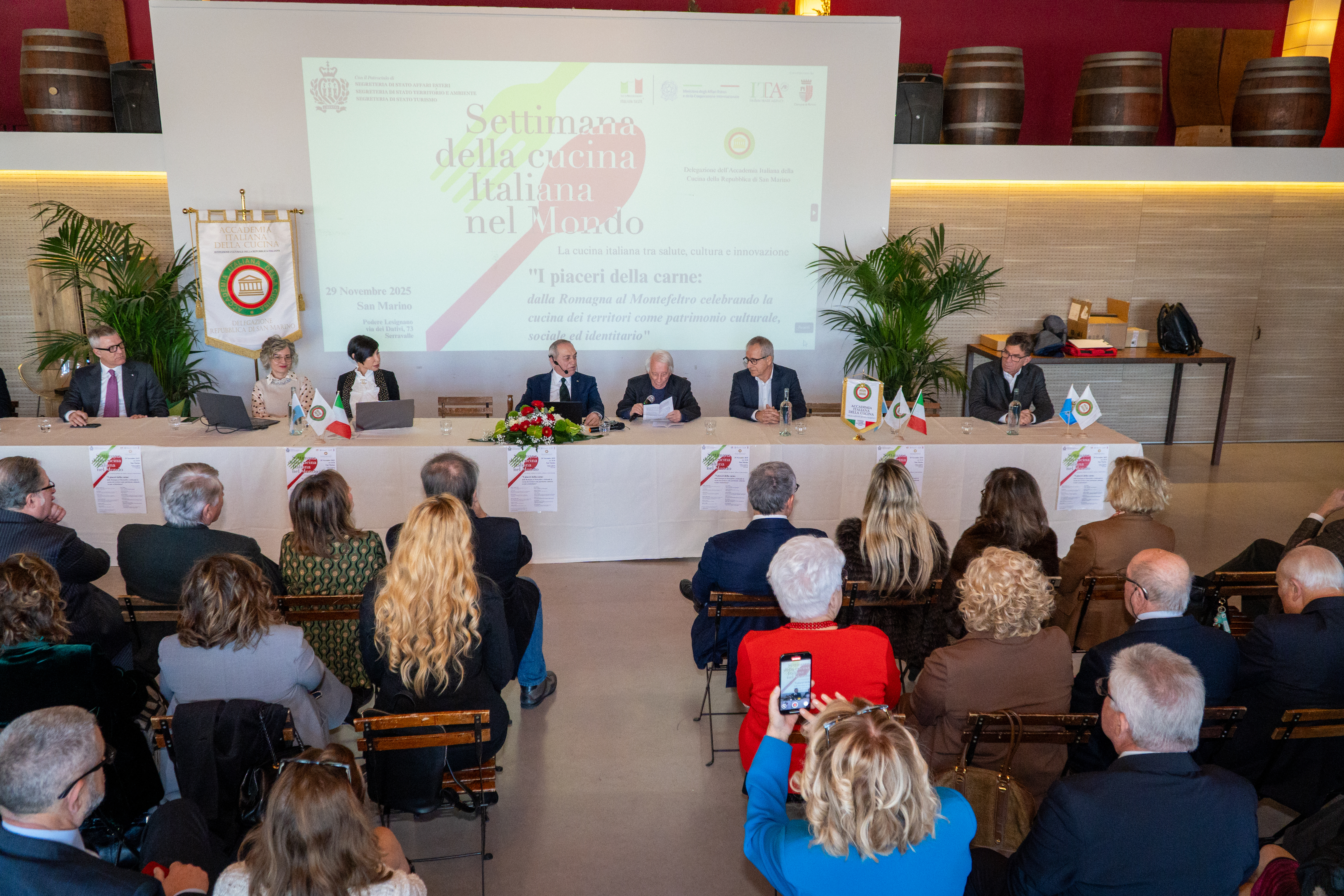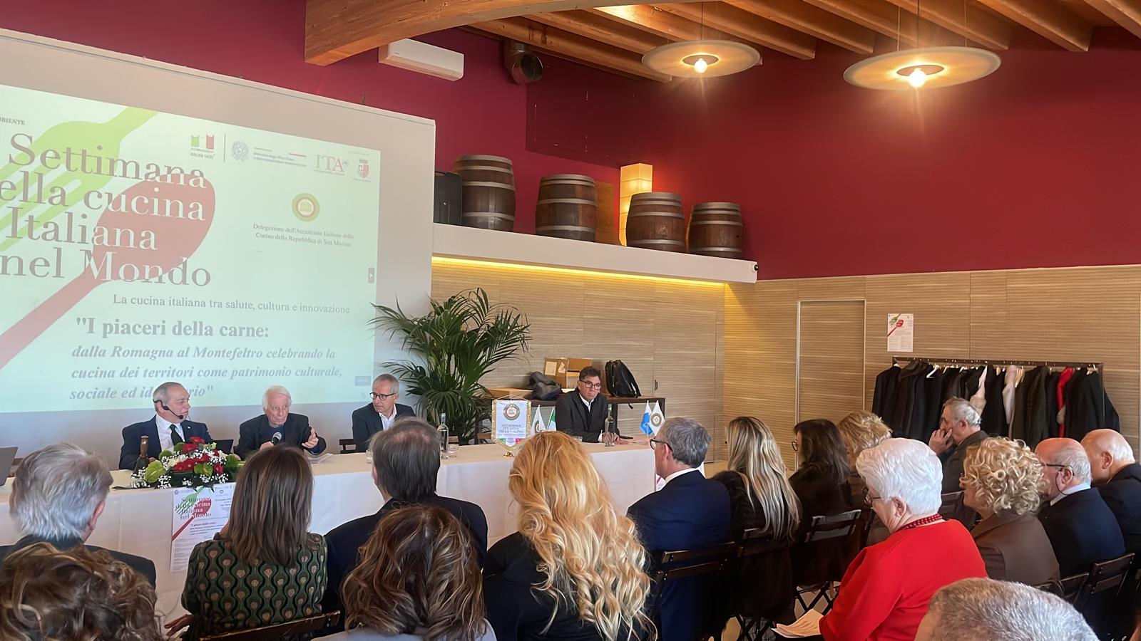 Nell’ambito delle celebrazioni della X SCIM, la Delegazione della Repubblica di San Marino dell’Accademia Italiana della Cucina, in collaborazione con l’Ambasciata d’Italia in San Marino, ha organizzato il convegno “I Piaceri della carne: dalla Romagna al Montefeltro celebrando la cucina dei territori come patrimonio culturale, sociale ed identitario”, dedicato alla valorizzazione della cucina come patrimonio culturale, sociale e identitario dei territori. Dopo l’introduzione del Delegato Stefano Valentino Piva e il saluto di S.E. l’Ambasciatore Fabrizio Colaceci, è intervenuto il Dr. Denis Cecchetti, Presidente dell’Associazione San Marino-Italia e della Camera di Commercio di San Marino, che ha sottolineato il ruolo strategico del settore agroalimentare italiano, pari al 15% del PIL considerando l’intera filiera, e la sua forte vocazione all’export e alla tutela dell’identità culturale attraverso le denominazioni di origine. Il Dr. Giovannino Conti ha portato il saluto del Segretario di Stato per gli Affari Esteri Luca Beccari, evidenziando l’importanza dell’iniziativa per la promozione delle tradizioni gastronomiche romagnole, montefeltrine e sammarinesi. Tra gli interventi più apprezzati, quello del Prof. Piero Meldini sulla storia della cucina romagnola, del Dr. Maurizio Marocco sul tema “Sano è buono”, di Michele Margotti sul rapporto tra carne e vino nei territori, della Dr.ssa Marina Corsi sulle proteine animali e della Dr.ssa Sara Ranocchi sul legame tra carne, salute e cultura. Ha concluso il Dr. Flavio Benedettini raccontando l’evoluzione degli allevamenti locali. Il convegno si è chiuso con un convivio curato dallo chef stellato Luigi Sartini, momento di confronto e convivialità tra gli Accademici delle diverse Delegazioni.