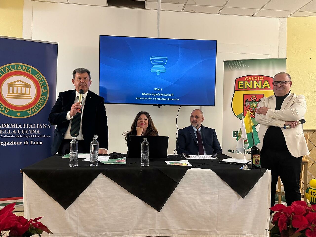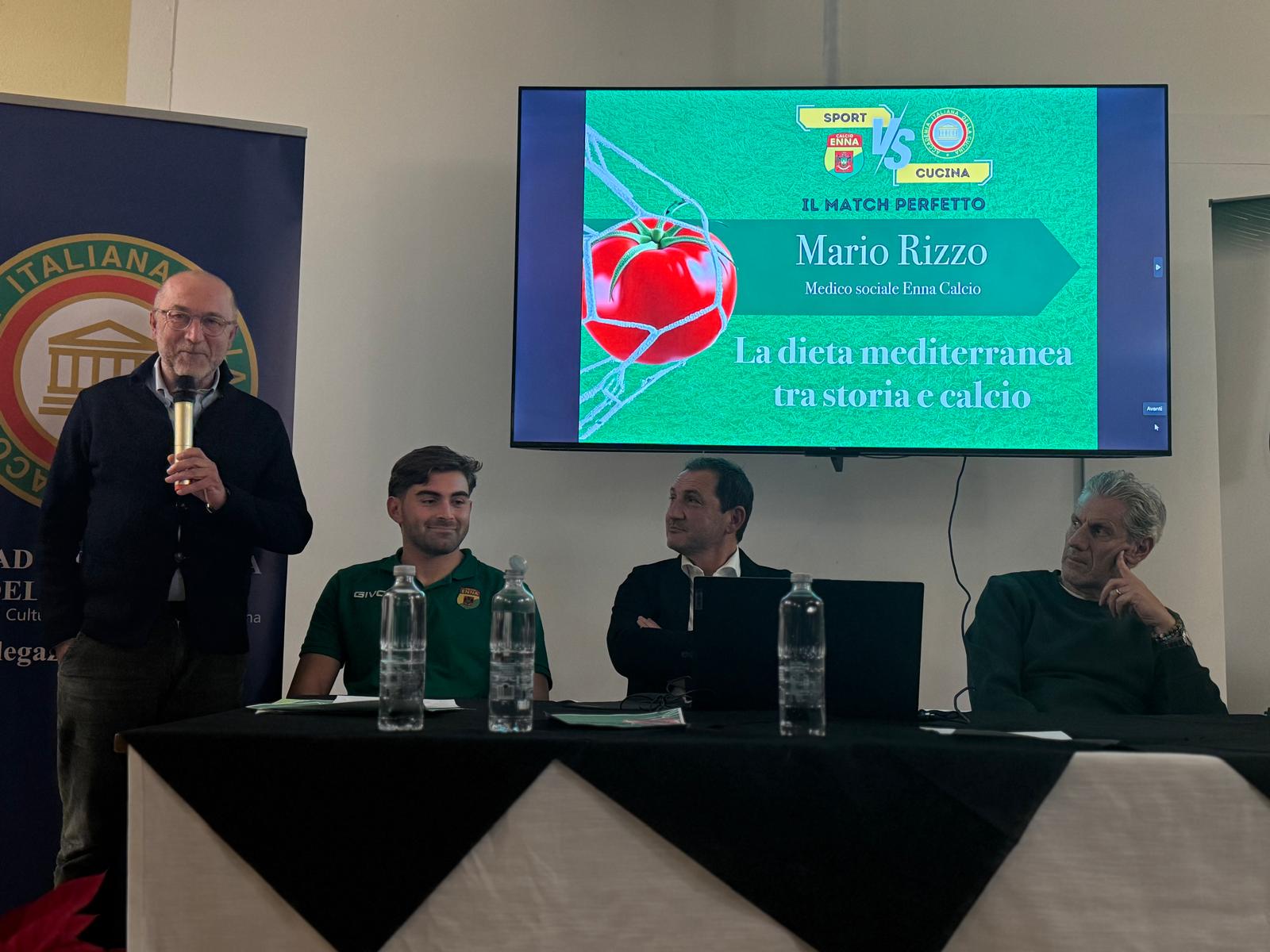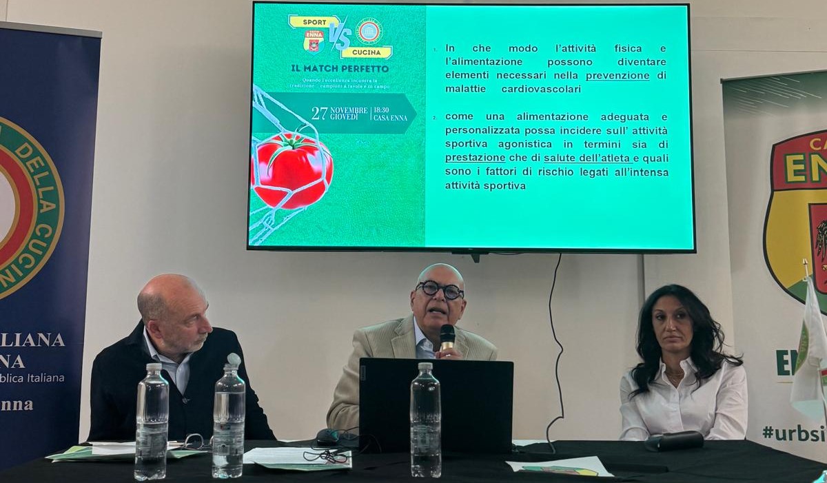 Casa Enna ha ospitato “Il match perfetto”, iniziativa promossa dalla Delegazione di Enna dell’Accademia e dall’Enna Calcio, dedicata al dialogo tra sport, nutrizione e prevenzione cardiologica. Davanti a un pubblico attento, esperti e professionisti hanno mostrato come tradizione gastronomica e pratica sportiva possano favorire salute e performance. Sandra Greco, nutrizionista, membro della European Sport Nutrition Society e FIFA Football Medicine Specialist, ha aperto gli interventi con “Performance a km zero”, illustrando i benefici dei prodotti locali nella preparazione atletica. L’Accademico Carmelo Battaglia, dirigente medico della Cardiologia UTIC dell’Ospedale Umberto I di Enna, ha approfondito il legame tra alimentazione e prevenzione cardiovascolare. Il medico sociale dell’Enna Calcio, Mario Rizzo, ha ribadito il valore della dieta mediterranea nel calcio, affiancato dalle testimonianze del tecnico Francesco Passiatore, del vice Alfredo Cimino e del portiere Andrea Loliva. Nel suo saluto, la delegata AIC Marina Taglialavore ha sottolineato l’importanza della tradizione culinaria, mentre il vice Delegato Fabio Montesano ha richiamato l’idea guida dell’evento: sport e cucina come “match perfetto” per il benessere collettivo. Il convegno, aperto dal presidente Luigi Stompo e moderato da Manuel Bisceglie, si è concluso con una tavola rotonda, un brindisi e le domande del pubblico.