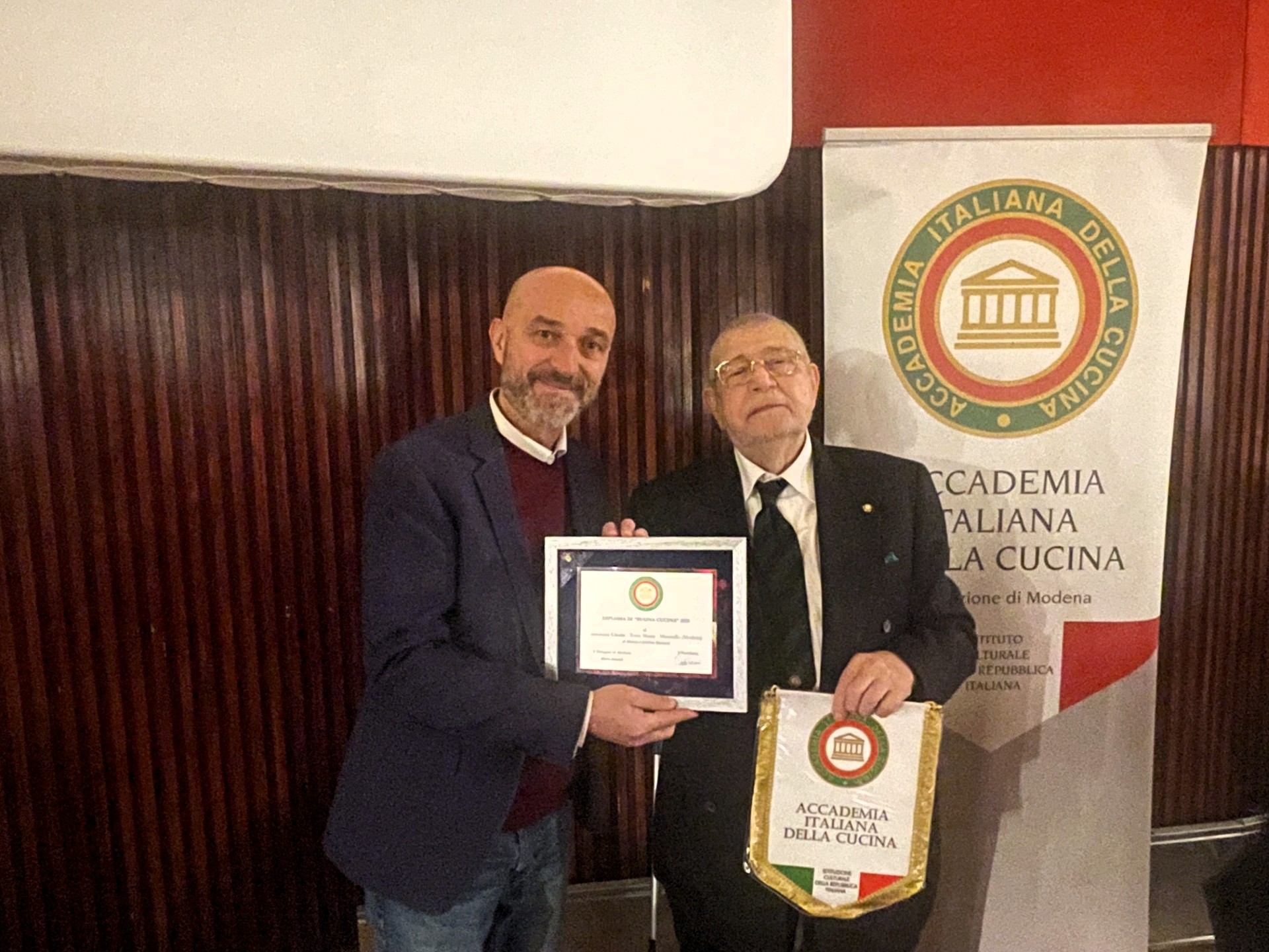 Nel corso della serata dedicata dalla Delegazione di Modena ai tradizionali auguri per il Natale in arrivo, il Delegato Mario Baraldi, alla presenza di un nutrito gruppo di Accademici, Consorti e Ospiti, ha illustrato una presentazione relativa alla storia dell’Accademia Italiana della Cucina, un sunto dell’attività svolta nel corso del 2025 che ha visto l’entrata di quattro nuovi Accademici, la consegna del sigillo dei 40 anni di appartenenza all’Accademico Giulio Romano, l’assegnazione dei premi Massimo Alberini (Gastronomia La Punta) e Giovanni Nuvoletti (Associazione Il Tortellante), con interessamento della stampa locale. Al termine della presentazione è stato consegnato ai titolari della Cicala, Andrea e Monia Bazzani, il Diploma di Buona Cucina. La cena degli auguri ha quindi avuto il suo proseguimento presso il Ristorante Cinema Teatro Arena, con un menu a base di piatti tradizionali, all’insegna di una delle cose più difficili da ottenere in cucina: la semplicità. La classica consegna alle signore di una stellina di Natale da parte dell’Accademico Segretario Marco Righi ha indicato al Delegato il giusto tempo per porgere a tutti l’augurio di Buon Natale.