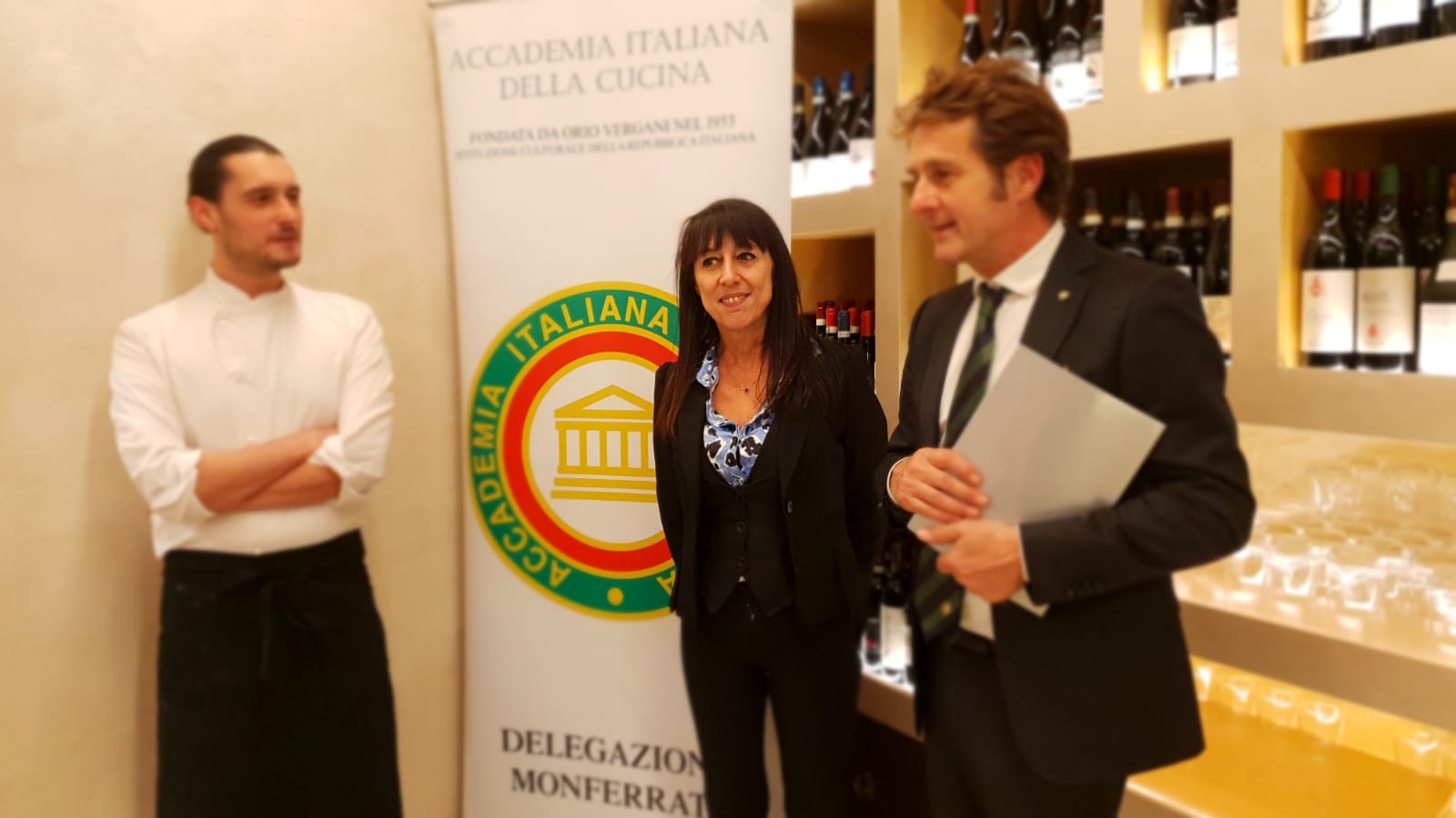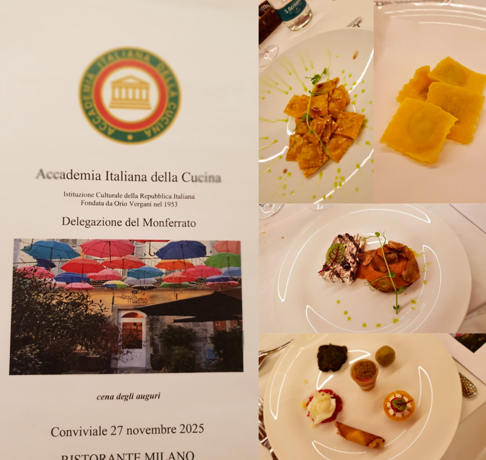 Riunione conviviale di Natale della Delegazione, in centro a Casale Monferrato, al ristorante “Milano”, uno storico locale per tanti anni di Guglielmo Robotti ed oggi rinnovato dall’entusiasmo di Mauro e Michela, che lo hanno profondamente ammodernato e reso senza alcun dubbio gourmet. Qui i piatti e i prodotti della tradizione trovano nuove vesti e colori, ma stupiscono per il forte richiamo monferrino. Tra le proposte: cannolo con tonno di coniglio, peperone in bagna cauda delicata, tartellette con fonduta di Robiola e salsiccia di Bra, friciulin, battutina di Fassona con uovo poché di quaglia e Castelmagno, sfera di paté di coniglio.con glassa al rabarbaro, variegata di formaggi tipici con muletta, flan di cardo gobbo con crema di peperoni e chips di topinambur, millefoglie di lingua, agnolotto della tradizione, bavarese di castagne del Monferrato. Vini: Azienda Agricola La Casaccia di Cellamonte. Dunque, dopo una carrellata di squisiti assaggi che hanno messo in chiaro le doti dello chef Mauro, il protagonista è stato l’agnolotto della tradizione, dapprima gustato al tovagliolo e quindi con il sugo dell’arrosto.