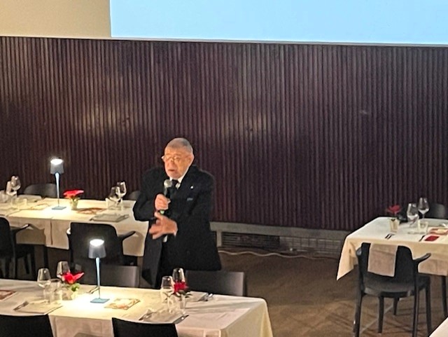 Cena di Gala al Dorchester Hotel organizzata dalla Delegazione per la X SCIM, con la partecipazione di S.E. l’Ambasciatore Italiano a Londra Inigo Lambertini, del Console Generale Domenico Bellantone, del Direttore ICE/ITA Giovanni Sacchi, del Direttore dell’Istituto Italiano di Cultura Francesco Bongarrà, dell’Addetta all’Agricoltura Gabriella Manfredi e del Presidente della Camera di Commercio Roberto Costa. L’Ambasciatore, nel suo saluto, ha elogiato l’attività dell’Accademia in Italia e all’estero, a tutela del patrimonio culturale che la cucina italiana rappresenta. Il Delegato Maurizio Fazzari ha ricordato i 40 anni della Delegazione, i fondatori del 1985 e l’evoluzione della nostra cucina nel Paese; ha festeggiato la Vice Delegata Sidney Ross per i 30 anni di appartenenza all’Accademia, accolti da applausi, e rivolto un ringraziamento speciale al Direttore del Dorchester, Luca Virgilio, per disponibilità e amicizia. Ha quindi dato il benvenuto a Francesco Bongarrà quale Accademico Onorario. Chef d’eccezione Giorgio Locatelli e Francesco Mazzei, insieme alla brigata del Dorchester guidata dal Culinary Director Martyn Nail che ha curato i canape dell’aperitivo. Locatelli e Mazzei hanno intrattenuto i presenti con simpatia e proposto piatti molto apprezzati: ravioli con patate e caviale (Locatelli) e la celebre Porchetta del Re (Mazzei), preparata per una cena con Re Carlo. La brigata del Dorchester è poi entrata con carrelli di tiramisù servito al cucchiaio. Grandi applausi e straordinaria convivialità. Il Delegato ha consegnato al Dorchester il piatto ricordo e ringraziato la Simposiarca Sidney Ross per l’impeccabile organizzazione.