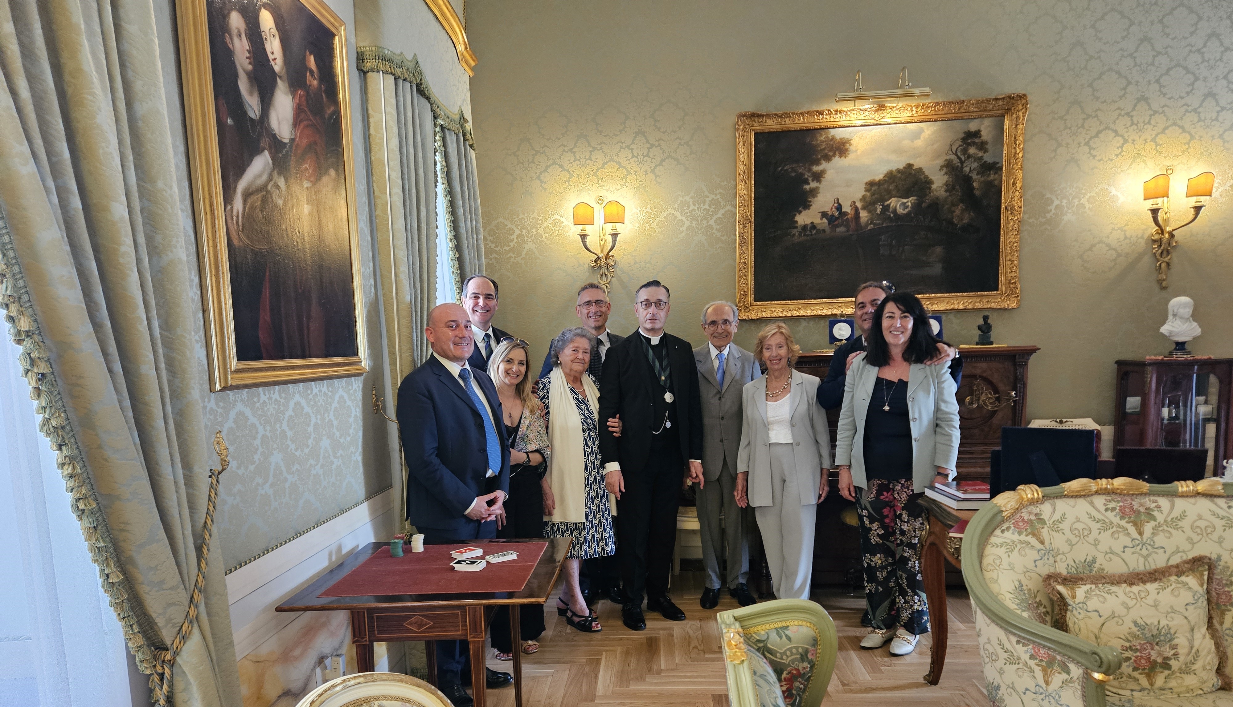 Il nuovo Legato per lo Stato Città del Vaticano, Fabrizio Turriziani Colonna, ha organizzato il primo incontro della Legazione, ricordando la visita di Papa Pio IX a Frosinone, iniziata il 13 maggio 1863. Nel palazzo Torti Turriziani Colonna, visitato e onorato dal Pontefice nella felice circostanza del viaggio in Ciociaria, si è tenuto un evento conviviale durante il quale sono stati illustrati alcuni elementi della tavola nobiliare del XIX secolo: riti e oggetti che hanno accompagnato gli eventi storici in quel secolo di veloci e profondi cambiamenti istituzionali. Il Legato, dopo aver ricordato la figura del Beato Pio IX, ha portato all’attenzione dei presenti le porcellane, la cristalleria e la posateria che adornavano la tavola, dedicandosi a far emergere i particolari di un sistema conviviale di intramontabile gusto che distingueva la classe dirigente nel passato e che oggi si presenta come un’eccellenza dell’arte della tavola in Italia. Dopo l’aperitivo servito nella sala di compagnia a base di olive ascolane e fritti, si è passati nella sala da pranzo dove sono stati serviti pomodori ripieni di riso, vitel tonnè e fagiolini, per concludere con la tradizionale zuppa inglese. Nella sala di compagnia, il caffè è stato accompagnato con diversi liquori. Oltre agli Accademici della Legazione, erano presenti due Accademici di Frosinone, il Comandante Provinciale dei Carabinieri, col. Mattioli, e diversi altri ospiti, i quali hanno apprezzato notevolmente l’organizzazione, i piatti, i vini e l’ospitalità.