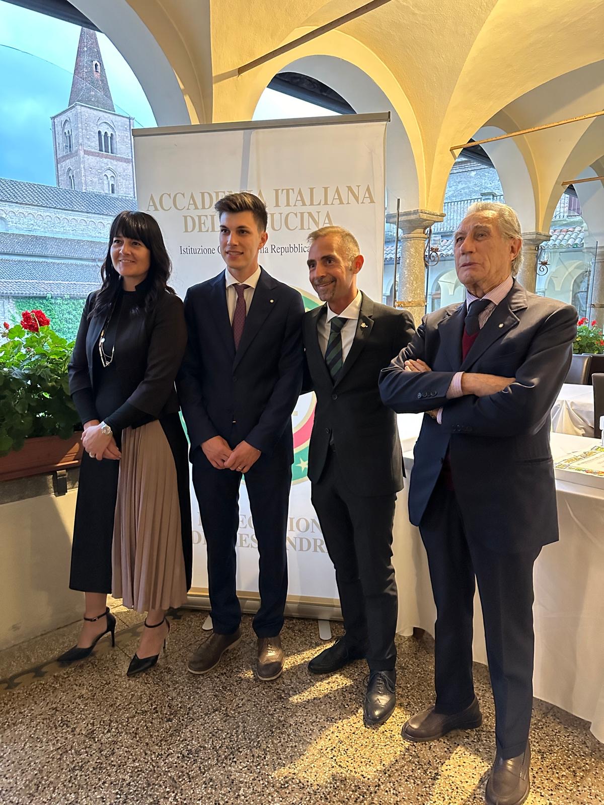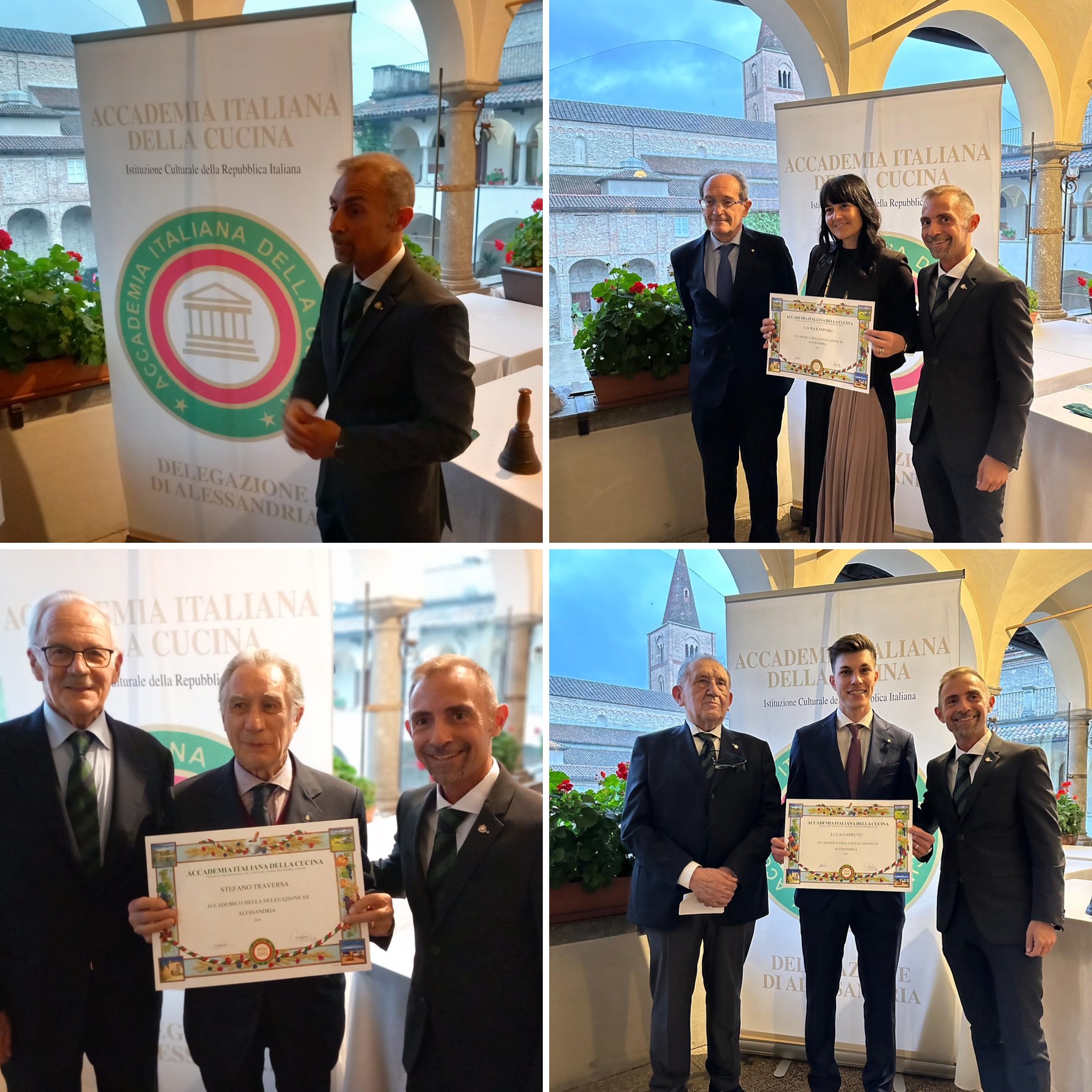Il loggiato cinquecentesco dell'ex seminario vescovile di Acqui Terme ha fatto da cornice all'ultima riunione conviviale delle Delegazione alessandrina prima della pausa estiva. Gli Accademici si sono ritrovati presso il Ristorante “Il Moncalvo” la cui cucina è affidata al giovane chef Luca Guidetti, idee chiare e tecnica moderna, con l'obiettivo di dare una svolta in chiave contemporanea e gourmet alla cucina della tradizione sin qui operata dalla chef storica Angela Gervino, sempre presente unitamente al marito Filippo Tirri, patron e responsabile della sala. Una serata dal clima un po' autunnale ha visto l'ingresso di tre nuovi Accademici, Laura Kaminski, Stefano Traversa e Luca Garruto, presentati rispettivamente dagli Accademici Giovanni Costa, Giulio Stabilini e Adriano Benzi. Prima della cena un altro appuntamento con le eccellenze della Provincia di Alessandria, a cura di Giorgio Borsino, incentrato sul formaggio Montebore, sul Filetto baciato di Ponzone e sui Baci di Tortona. Consegnata infine la vetrofania 2024 dell'Accademia ai gestori del locale con il plauso dei presenti.