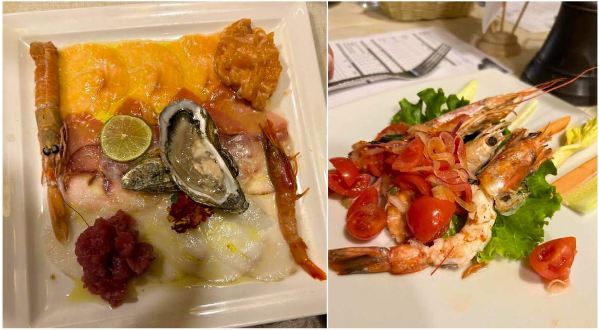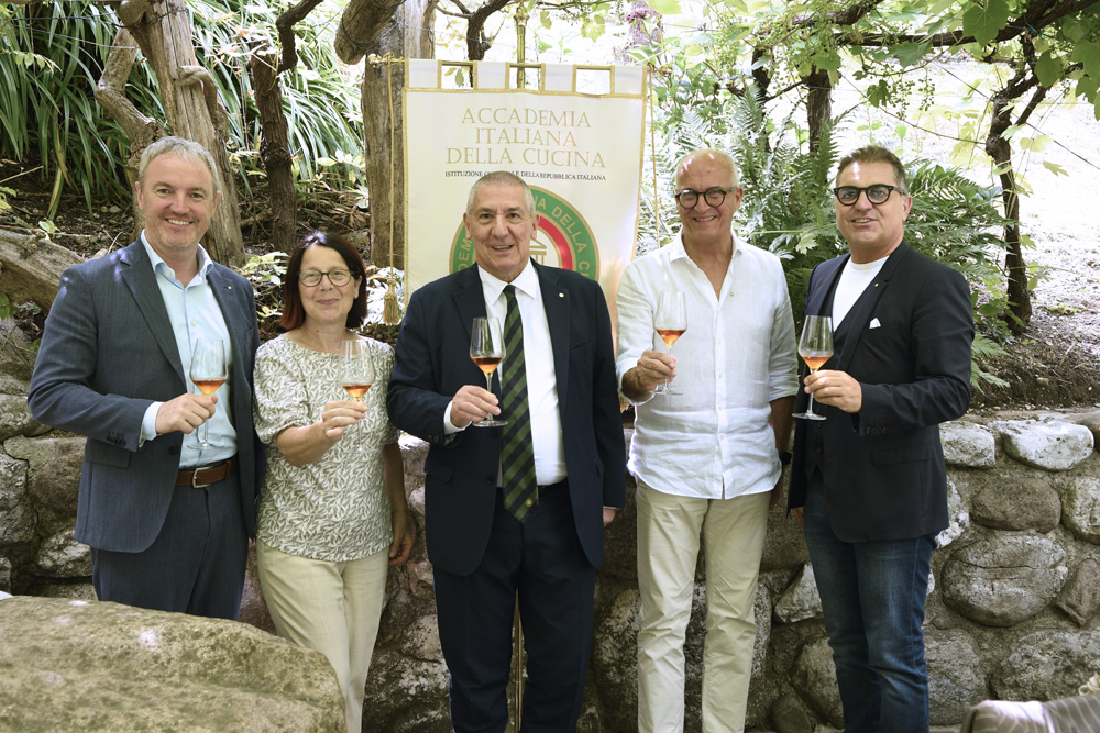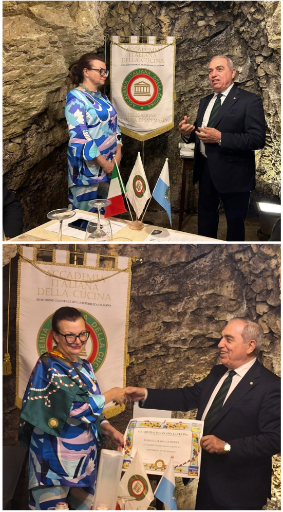 Magnifica serata nella grotta del ristorante il Piccolo: protagonisti il gambero rosso di Mazara del Vallo e la corba rossa del Gargano, due eccellenze ittiche del mare Mediterraneo. Un suggestivo grottino, scavato nella roccia del monte Titano, ha accolto gli Accademici e i numerosi ospiti (foto 1). Dopo un breve saluto del Delegato Stefano Piva e la cerimonia per la consegna delle insegne di appartenenza alla nuova associata Isabella Gumpert (foto 2), lo chef Mario ha raccontato i piatti in cui avrebbe servito i protagonisti delle “caratteristiche sfumature di rosso”. La cucina proposta, curata e raffinata, sensibile alla stagionalità e frutto dell’estro dello chef Mario, ha presentato due antipasti: un “completo di crudités” e una catalana di crostacei (foto 3); il primo piatto “risotto alla rapa rossa, gambero di Mazara del Vallo a tartare e stracciatella” (foto 4) ha stimolato sapori piacevolmente ricchi e complessi nonché straordinariamente equilibrati. Il secondo piatto, trancio di corba rossa del Gargano alla Mediterranea con la sua polpa soda ed umida dal sapore dolce e delicato. E per finire, uno squisito babà con gelato alla crema. La brigata di sala e cucina dello chef Mario ha meritato l’elogio dei commensali. A conclusione della riuscita serata, il ringraziamento al Simposiarca Cesare Tabarrini e il saluto del Delegato.