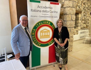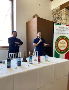 La riunione conviviale si è svolta presso il ristorante Baglio Coriolano ubicato all’interno di un antico frantoio che fin dal 1895 è stato utilizzato per la lavorazione e la conservazione del vino e dell'olio. All'ingresso del locale si possono ancora ammirare restaurati grossi botti e pesantissimi frantoi. Birra e gelato, un insolito abbinamento, questo è stato il tema della riunione conviviale, dove hanno relazionato il mastro birraio Gabriele Benenati spiegando la differenza fra le birre artigianali e quelle industriali, e il chocolate maker Isidoro Stellino che ha relazionato sulle qualità del gelato artigianale fatto con prodotti naturali. Ad ogni pietanza servita è stata abbinata una birra artigianale. L’antipasto bruschetta con pesto e ricci di mare, crudità di lampuga, spatola fritta, è stato abbinato con la birra Berliner Weisse ai fiori di ibisco. Il primo di strozzapreti con ragù bianco di pescatrice al sentore di finocchietto è stato abbinato con la birra Shine american IPA. Il secondo di seppia nera in tempura di birra, patata farcita è stato abbinato con la birra Pulse Tripel. Foto 1. Liborio Cruciata Delegato di Alcamo-Castellammare del Golfo con Rosetta Cartella Delegata di Canicattì. Foto 2. I relatori: da sinistra Isidoro Stellino a destra Gabriele Benenati. Foto 3. Accademici.
