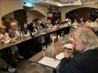 La Delegazione di Stoccolma ha ricevuto la gradita visita della Delegazione di Lodi guidata dal Delegato Bruno Balti. Dopo una serata tipicamente svedese in un caratteristico locale dell’Arcipelago, è stata organizzata la sera successiva un riunione conviviale presso il ristorante Esperanza nel centro di Stoccolma. Dopo il saluto dei due Delegati, l’Accademico Emilio Gentile ha brevemente relazionato sullo sviluppo della gastronomia italiana in Svezia negli ultimi 80 anni, dall’arrivo dei primi immigrati italiani - tempi in cui era difficilissimo reperire prodotti italiani - ad oggi, quando in ogni negozio alimentare brillano i prodotti tricolori sia originali sia spesso, purtroppo, d’imitazione. Il convivio è stato apprezzato anche dagli ospiti lodigiani specialmente i passatelli fatti in casa dallo chef marchigiano Mirco Guidi. Apprezzato, dalla stragrande maggioranza degli Accademici, anche il filetto d’agnello. Buono il dessert e nella norma l’antipasto. Ottimo accoppiamento con i vini toscani provenienti da un produttore in Radda in Chianti che collabora con il ristorante. Servizio premuroso ed il più possibile accurato visto il numero dei partecipanti, gestito dalla proprietaria Jenny Rosas Cashani. Una serata riuscita, terminata con lo scambio di doni.