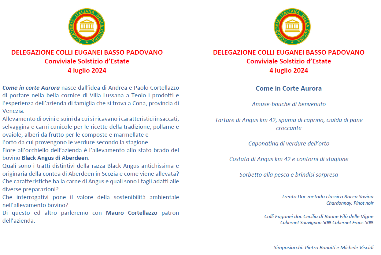La Delegazione Colli Euganei-Basso Padovano ha celebrato il solstizio d'estate presso il ristorante "Come in Corte Aurora" a Teolo, locale che nasce per far conoscere i prodotti dell'azienda agricola di famiglia il cui fiore all'occhiello è l'allevamento del pregiato bovino Black Angus. Nel corso della serata il patron allevatore Mauro Cortellazzo ha tenuto una conferenza sulle caratteristiche dell'allevamento e della pregiata carne bovina protagonista della cena. Foto 1. Menu e programma della serata. Foto 2. Il nuovo Accademico Filippo Tormene. Foto 3. Il nuovo Accademico Andrea Demetrio Carta Mantiglia. Foto 4. Il brindisi degli Accademici.
