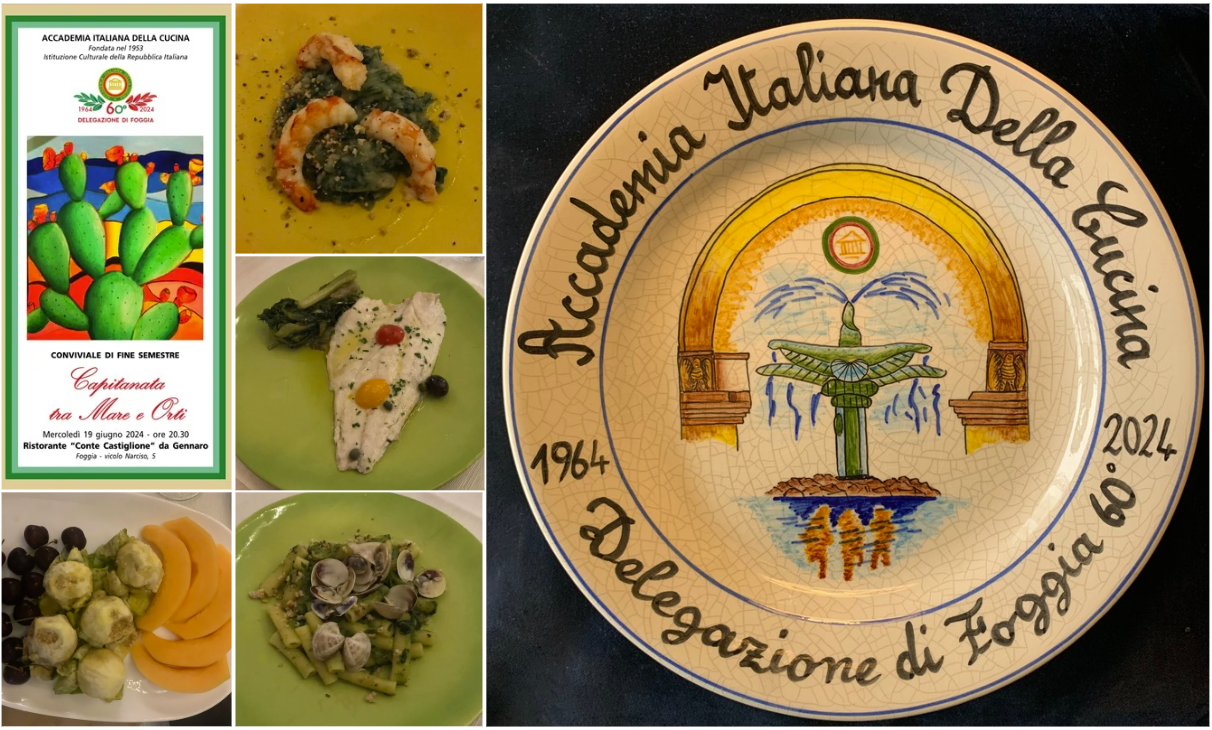 La riunione conviviale conclusiva del primo semestre si è svolta, a cura del Simposiarca Gianfranco Fenizi, presso il Ristorante “Conte Castiglione” nel cuore del “Piano delle Fosse Granarie”, tra Porta Arpana (accesso alla Reggia di Federico II), Borgo Croci (ove vivevano i Terrazzani) e l’Epitaffio (punto di incrocio dei tratturi della Transumanza). Dopo un brindisi augurale per la incipiente estate, svoltosi nel dehors dell’adiacente vicoletto, il Delegato Valerio Antonio Vinelli ha esposto l’attività svolta dalla Delegazione nel 1° semestre e il programma per il 2° semestre, che avrà come fulcro le celebrazioni del 60^ della Delegazione. Ha, quindi, presentato la nuova Accademica Anna Maria Vasco e il piatto celebrativo del 60^. Il Vice Delegato Giuseppe Vinelli ha esposto sinteticamente i 60 anni di storia della Delegazione e i simboli riportati nel piatto celebrativo (le tre fiammelle delle origini della Città nel 1066 circa, l’arco del portale del palazzo Imperiale di Federico II del 1223 e la Fontana del Sele del 1924). A cura del Simposiarca la presentazione del tema e del menù della serata, incentrati sull’abbinamento tra verdure e pescato di Capitanata: gamberi con crema di fave e cicoria, maccheroncini con lupini e cime di rapa, orata con scarola. È stata, infine, raccontata la storia del “ficodindia”, originario del Messico, importato da Cristoforo Colombo e divenuto uno dei simboli dell’estate. Al dinamico titolare e chef del locale Gennaro Dello Mastro il Delegato ha donato il guidoncino e il piatto della Delegazione e la vetrofania dell’Accademia.