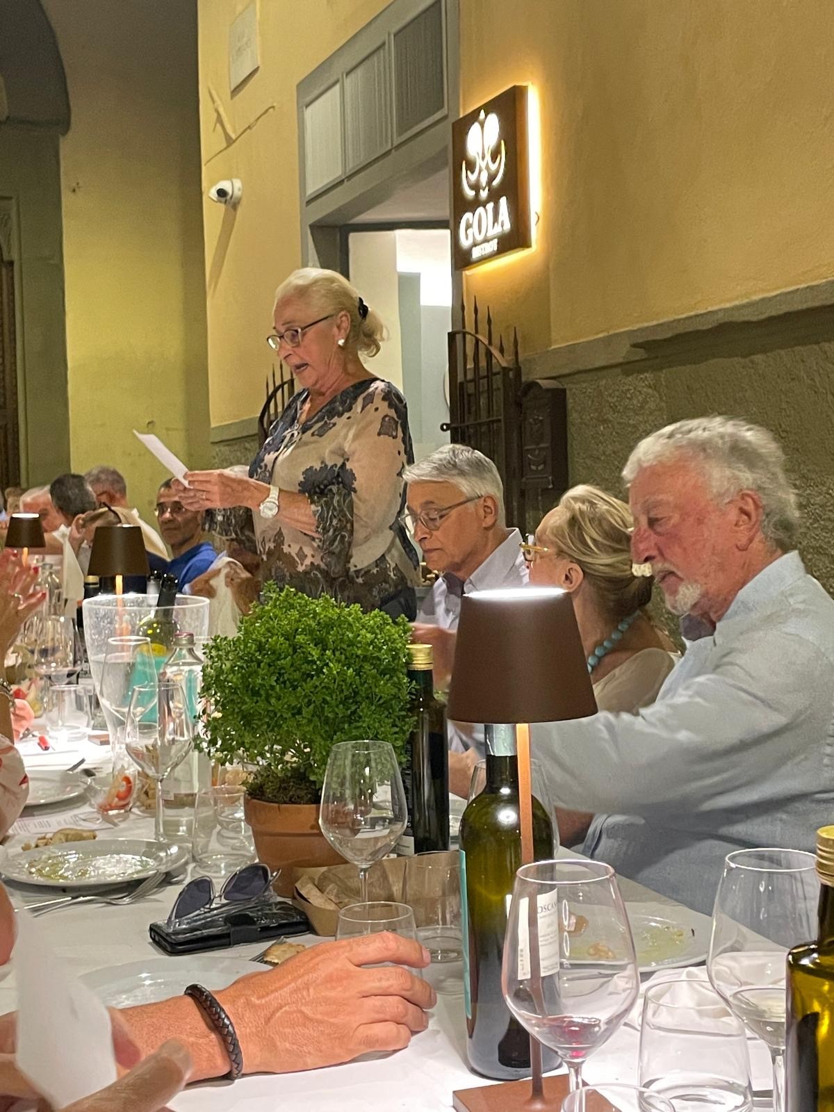 Con la suggestiva Chiesa degli Agostiniani a fare da sfondo, sotto la luce avvolgente che solo le serate estive sanno offrire, si è svolta la riunione conviviale di luglio presso l’Osteria Gola Bistrot. È stata presieduta dal Vice Delegato Giovanni Barresi e ha visto la partecipazione della quasi totalità degli Accademici che hanno accolto con entusiasmo l’occasione di una serata nel cuore di Empoli con i tavoli che si allungavano a riempire via Santo Stefano. La serata, condotta in modo brillante dalla Simposiarca di turno Sandra Ristori, ha preso l’avvio con una varia selezione di antipasti, seguiti da un ottimo e particolare menu, nell’insieme molto apprezzato. Fra i piatti, tutti ben curati, ricordiamo soprattutto i risotti, che caratterizzano il menu del locale. La serata si è conclusa con un finale inaspettato, l’arrivo di un furgoncino Volkswagen del 1967, unico in Italia, attrezzato per la produzione di un buonissimo gelato artigianale che è stato offerto a tutti i presenti e servito con ciliegie cotte nel vino rosso. Un ottimo convivio per un degno saluto prima della pausa estiva e un meritato plauso al responsabile del “Gola Bistrot”, Alessio Marronaro, alla compagna Tania Caselli e a tutto il personale che si è dimostrato attento e disponibile.