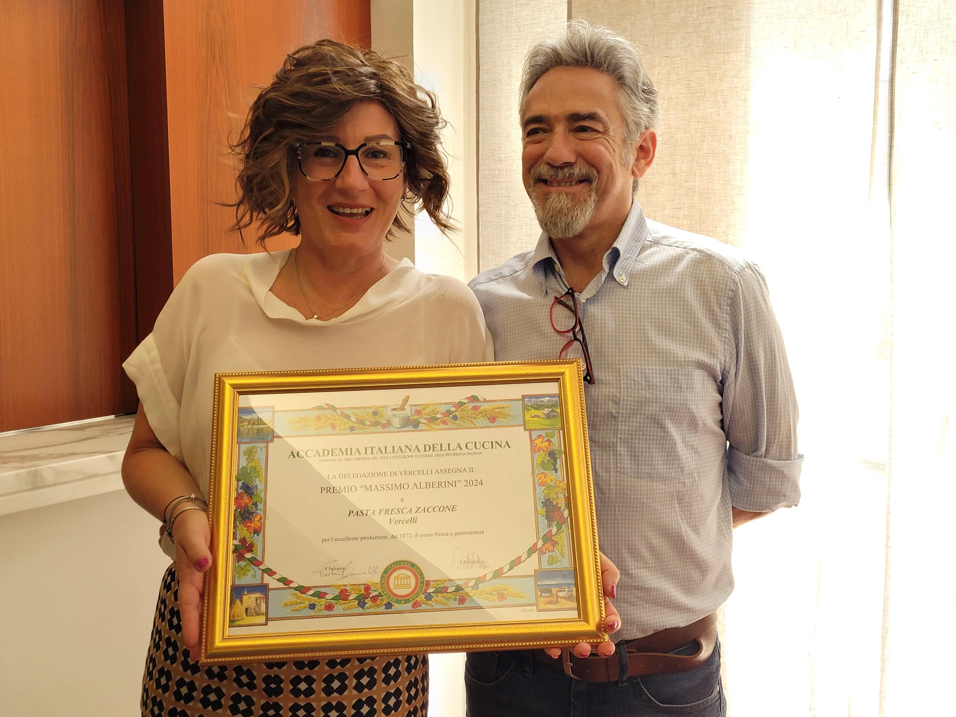La Delegazione di Vercelli ha assegnato il premio Alberini all’attività “Pasta fresca Zaccone”, locale nato nel 1972, da un’idea di Giovanni Zaccone, che oggi continua in via Verdi, a due passi da piazza Cavour, con il figlio Giuliano che rappresenta la seconda generazione. La cerimonia si è tenuta all’Ascom di Vercelli con il presidente Ascom Angelo Santarella, che è anche Accademico, e la Delegata Paola Bernascone Cappi a fare gli onori di casa. Alla cerimonia è intervenuto anche il Sindaco Roberto Scheda. Il pastificio Zaccone unisce artigianalità e creatività nell’esaltare il gusto dei suoi ingredienti: utilizza farine nazionali in gran parte macinate a pietra naturale ed offre solo ed esclusivamente ripieni di stagione lavorati a mano. La carne utilizzata per i ravioli è di razza piemontese, il formaggio solo Grana Padano e Parmigiano Reggiano stagionato per 24 mesi. La trasformazione delle materie prime in prodotto finito avviene in un moderno laboratorio a vista e rispettoso delle più severe norme igienico-sanitarie. Una parte del negozio è dedicata alla gastronomia della tradizione piemontese. A ritirare la targa Giuliano Zaccone con la moglie Chiara Broglia, circondato dal suo staff: “È un riconoscimento che dedico al mio papà e a tutto il mio staff. Senza l’aiuto dei miei collaboratori io non riuscirei a far nulla. Da soli non si va da nessuna parte. Siamo una squadra ben affiatata. Cerchiamo ogni giorno di mantenere i prodotti tipici e le ricette classiche, unendo a queste qualche novità, nel rispetto della produzione e delle materie prime”, ha dichiarato con soddisfazione il titolare.