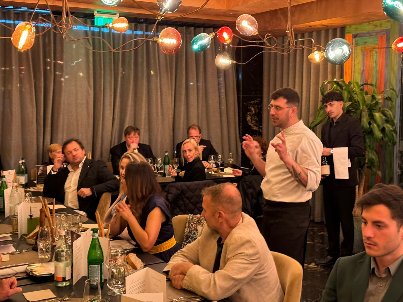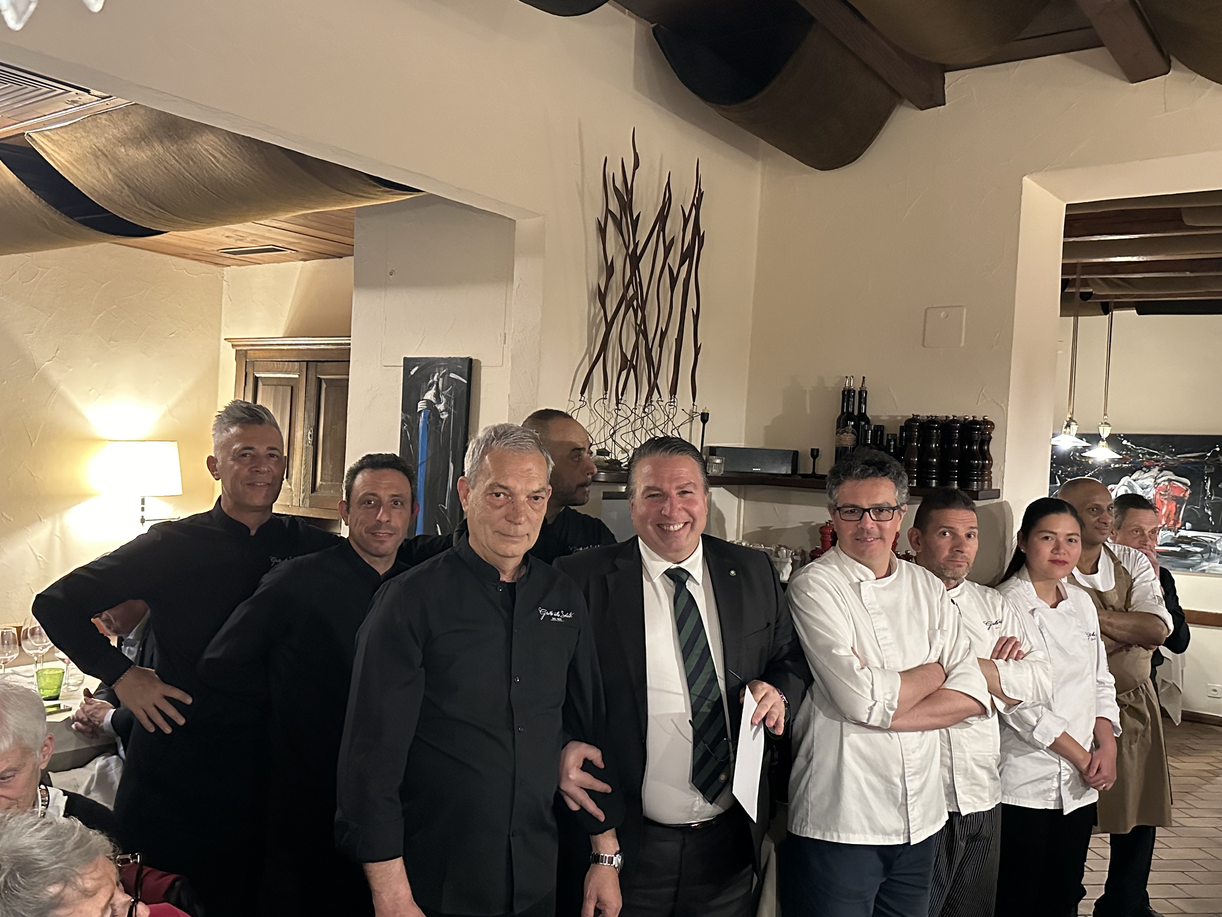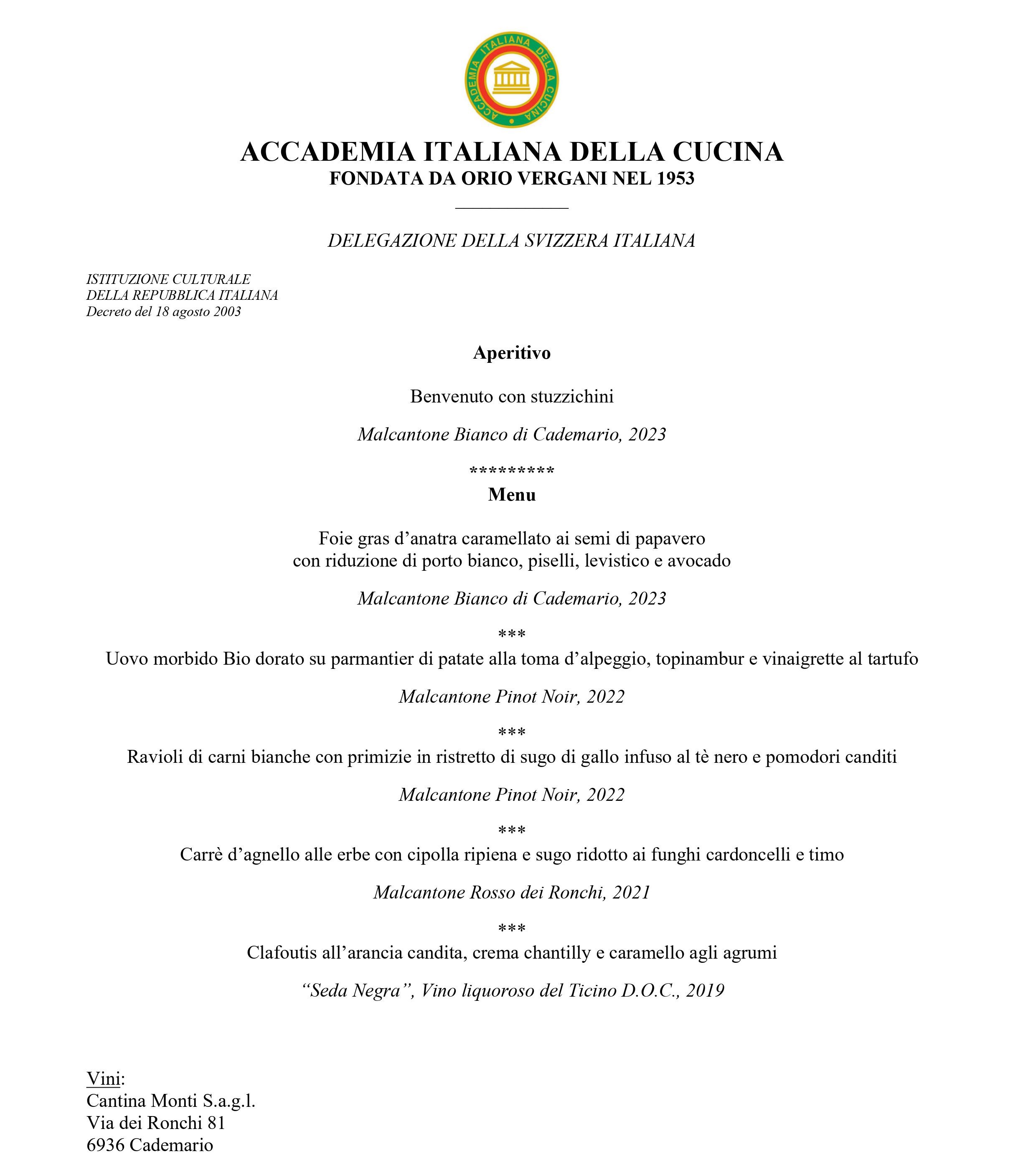 La seconda riunione conviviale si è tenuta presso il Grotto della Salute, un rinomato ristorante situato nel cuore di Massagno. Gli Accademici sono stati calorosamente accolti dal gerente Gianalberto Meregalli e dallo chef Fabio Barbaglini, che insieme costituiscono un duo dinamico, elevando l'esperienza culinaria a nuovi livelli. La gestione impeccabile di Meregalli, unita all'arte culinaria innovativa di Barbaglini, ha trasformato il Grotto in una meta essenziale per gli amanti della cucina italiana autentica e sofisticata. Ospiti della serata, Ivo Monti, eminente maestro viticoltore svizzero, e sua figlia Sabrina, rappresentante della terza generazione, erede e innovatrice nel campo. Essi incarnano l'armonia tra la tradizione enologica e la sostenibilità ambientale. Il loro lavoro nel vigneto trasforma i rigori del clima svizzero in vini di qualità eccezionale, con una gestione guidata da passione e precisione. Questa collaborazione si prefigura come un futuro promettente per il vino svizzero, caratterizzato da un approccio che bilancia cura familiare e innovazione responsabile. Durante la serata hanno offerto un'approfondita discussione sui vini selezionati per l'abbinamento con il menu e hanno condiviso le loro prospettive sulle sfide poste dal cambiamento climatico, che sta riscrivendo le dinamiche dell'enologia globale. La conviviale ha visto la partecipazione di 42 ospiti, tutti vivacemente entusiasti delle pietanze e dei vini proposti.