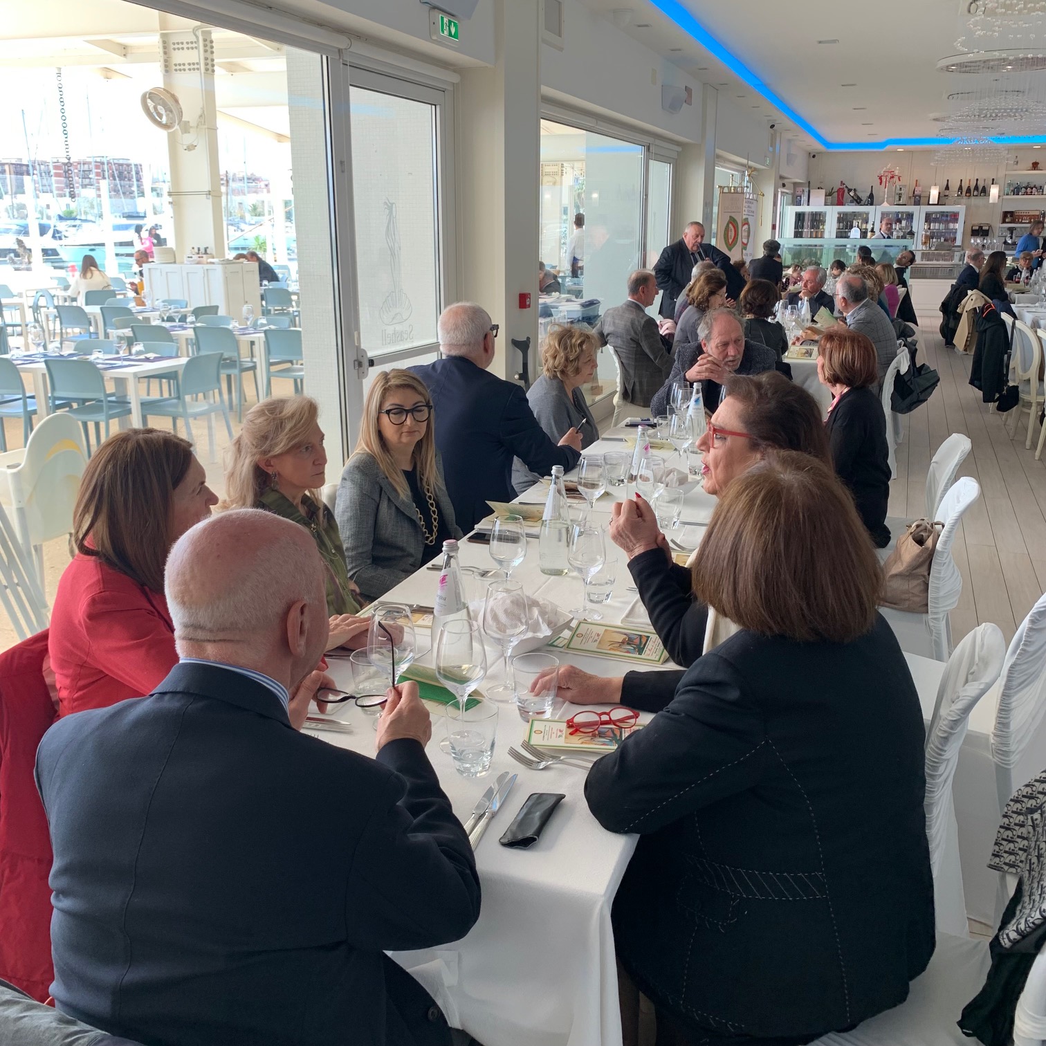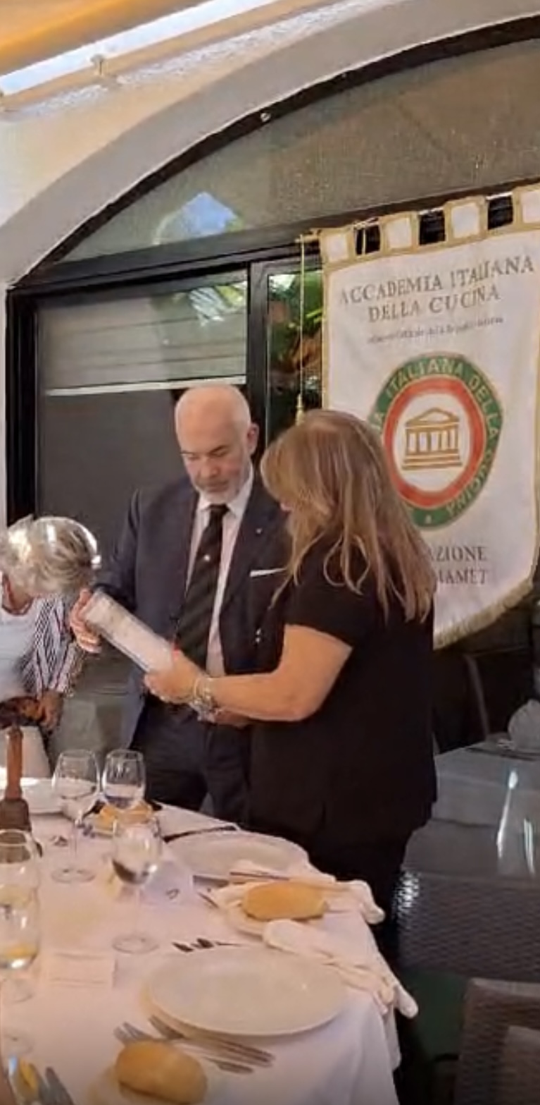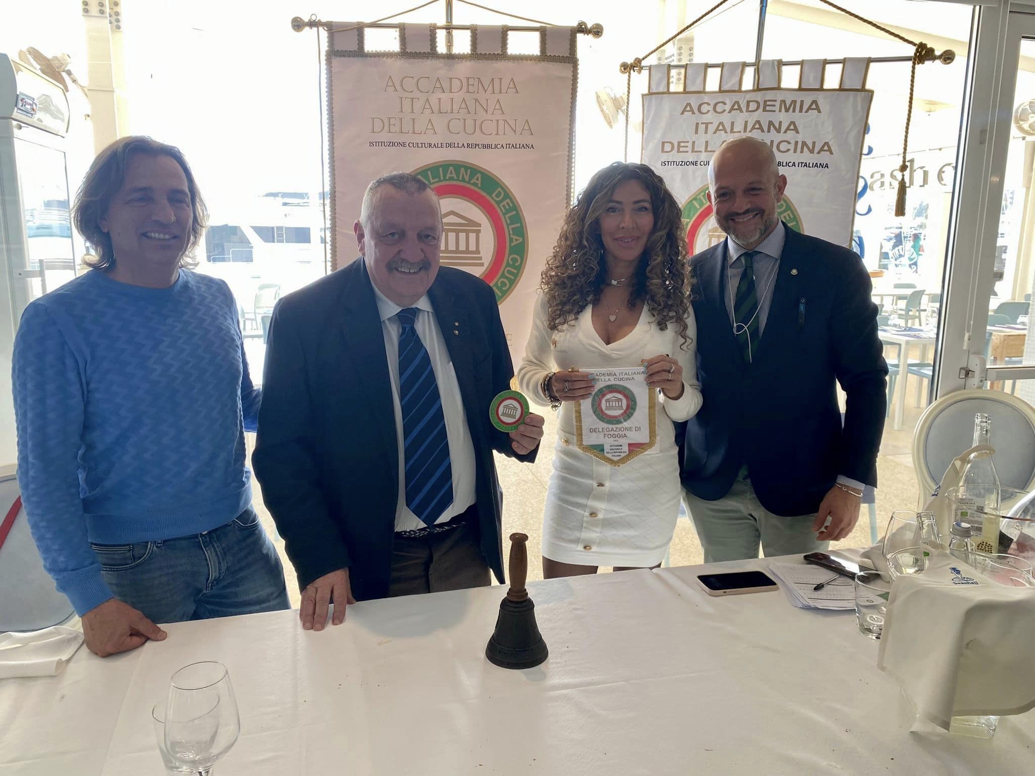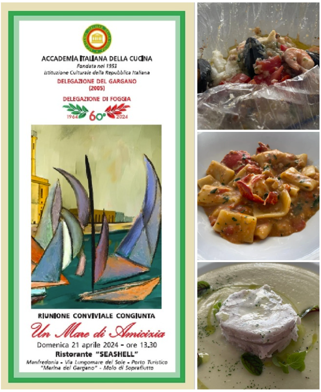 Con l’approssimarsi dell’estate e l’insorgente voglia di mare, le Delegazioni del Gargano e di Foggia si sono incontrate in una riunione conviviale congiunta, denominata “Un Mare di Amicizia”, presso il ristorante “Seashell” nel Porto Turistico “Marina del Gargano” di Manfredonia. I Delegati Giuseppe Trincucci e Valerio Antonio Vinelli, con l’ausilio dei titolari del locale, i coniugi Cristiano Dello Mastro e Mary Fabrizio, nonché dei tre chef (ognuno cura una portata) Luigi Ciuffreda, Matteo Bisceglia e Gilberto Di Gioia, hanno organizzato un pranzo tutto a base di pesce. Entrée con una zuppetta di pesce e frutti di mare al cartoccio in carta fata. Per primo una calamarata con astice e crostacei del golfo. A seguire una darnetta di leccia, pesce azzurro predatore delle acque del Gargano. Frollato per più giorni e cotto a bassa temperatura è stato servito su una crema di patate e ostriche. Il tutto accompagnato con bianco Passerina di Terra di Chieti e rosato Tuttavilla di Canosa di Puglia. Deliziosi in chiusura la crostata di ricotta e il limoncello di produzione propria. I Delegati hanno esposto la storia del locale, inaugurato nel settembre 2014, poco dopo la nascita del nuovo porto turistico, e hanno presentato Cristiano, erede di una famiglia di ristoratori, e la dinamica consorte Mary che ha affiancato lo chef Gilberto nella presentazione del menù. Numerosa la partecipazione di Accademici e ospiti. Donati ai titolari Cristiano e Mary i guidoncini delle Delegazioni e la vetrofania dell’Accademia Italiana della Cucina.