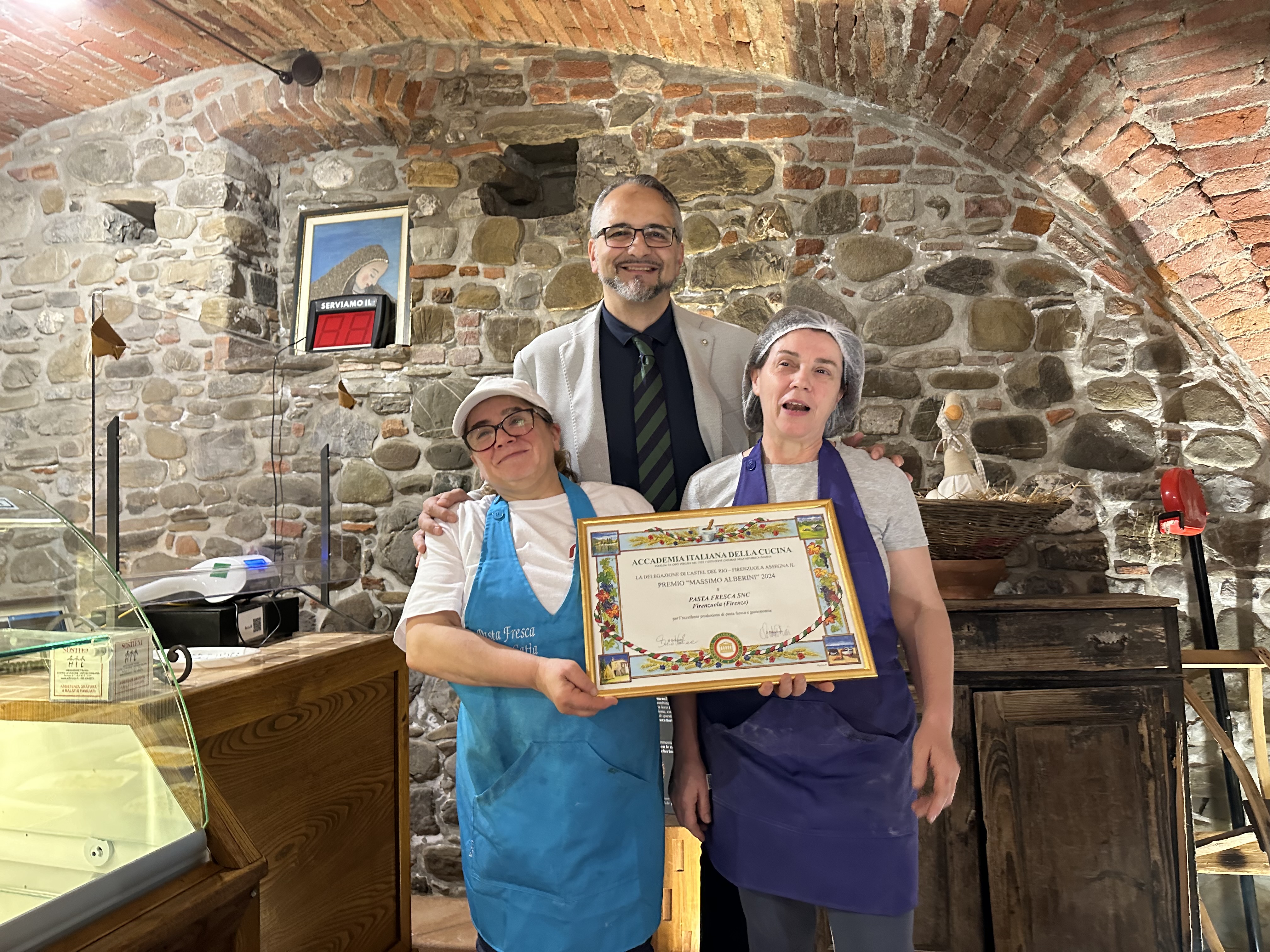 Nella stessa giornata il Delegato Dario Vecchione ha consegnato il premio Massimo Alberini al negozio Pasta Fresca Snc: nemmeno una giornata di festa per la meritata assegnazione del premio è riuscita a distogliere le due proprietarie dal lavoro al servizio dell’affezionata clientela firenzuolina. La consegna alle emozionate signore Catia e Carla è avvenuta fra gli applausi dei clienti in attesa di ritirare ravioli e tagliatelle per il pranzo della domenica. Da anni ormai praticamente un’istituzione cittadina, il piccolo negozio lavora ancora come una volta producendo tutto a mano, eccezion fatta per un’impastatrice e una sfogliatrice per tirare la pasta, ma soprattutto con ingredienti provenienti in massima parte dal territorio dell’Appennino Tosco-Romagnolo.