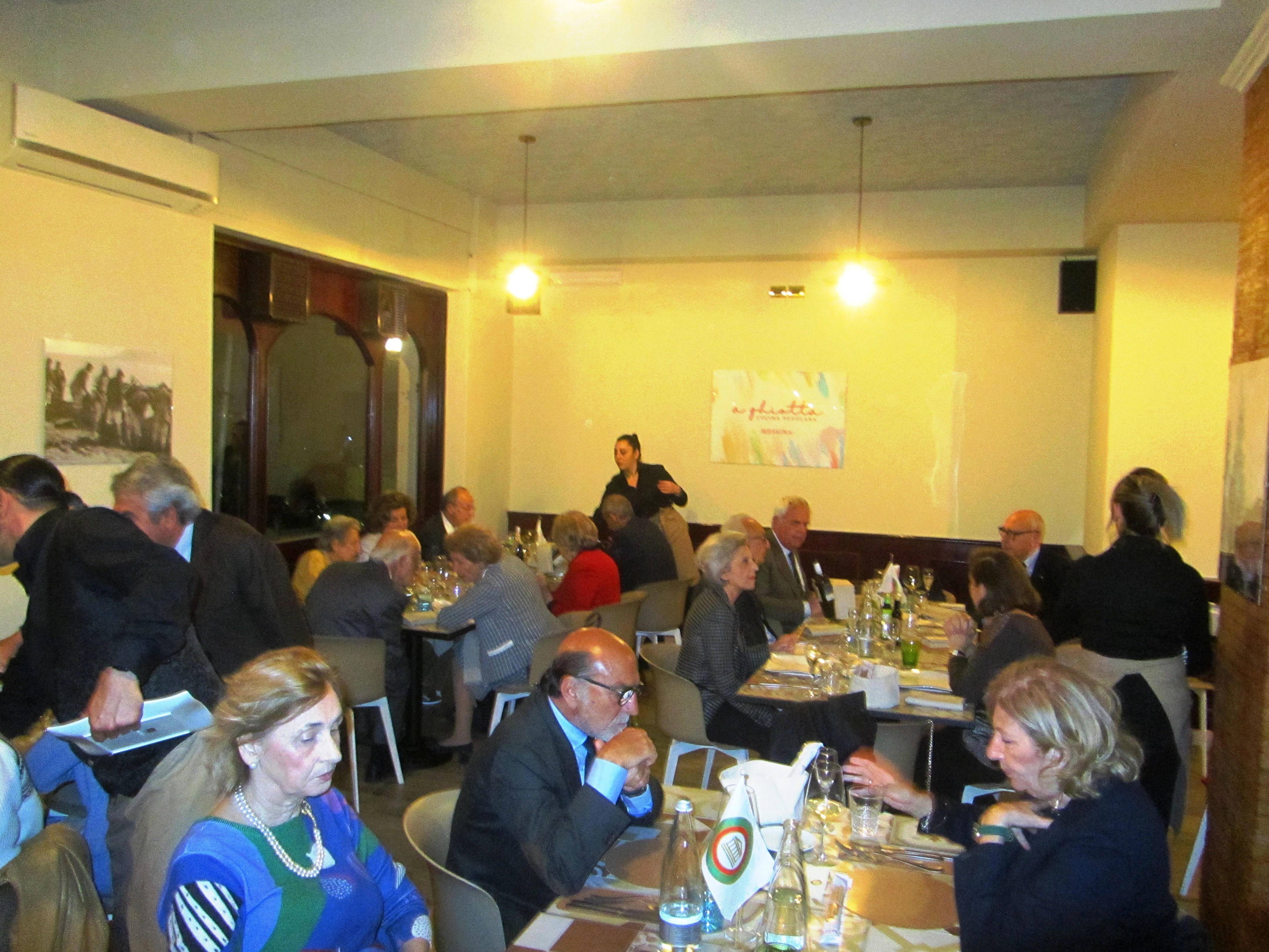 La Delegazione di Messina si è ritrovata con entusiasmo e con un cospicuo numero di Accademici e graditi ospiti in un locale inaugurato da pochi giorni, la cui denominazione ne rivela la più autentica tradizione. “A ghiotta - Cucina popolana” si ispira infatti a un sugo storico della tradizione marinara messinese, presente, con specifiche varianti, lungo le rotte marinare del Tirreno da Messina alla Toscana, Sardegna settentrionale, Marsiglia e Baleari. La “gghiotta” è un ragù di pesce sia di pesce spada sia di stoccafisso preparato con pomodori, olive, odori e patate utilizzati come condimento per la pasta. Il Delegato (foto 1), Simposiarca per la serata, ha anche informato i numerosi Accademici (foto 2) dello stato di organizzazione del convegno accademico organizzato a Messina per il Sessantesimo anniversario di fondazione della Delegazione. Gamberi crudi e caponata di pesce spada hanno aperto il convivio il cui pezzo forte è stato la pasta con la ghiotta di pesce stocco seguito - prima del dessert tipico messinese con gelato, frutta e biscotti secchi - dagli attesi involtini di pesce, forse penalizzati nella resa dal grande numero di piatti da servire (portate in foto 3). Festosa e convinta fra gli applausi la consegna del guidoncino alla titolare e alla sua squadra (foto 4).