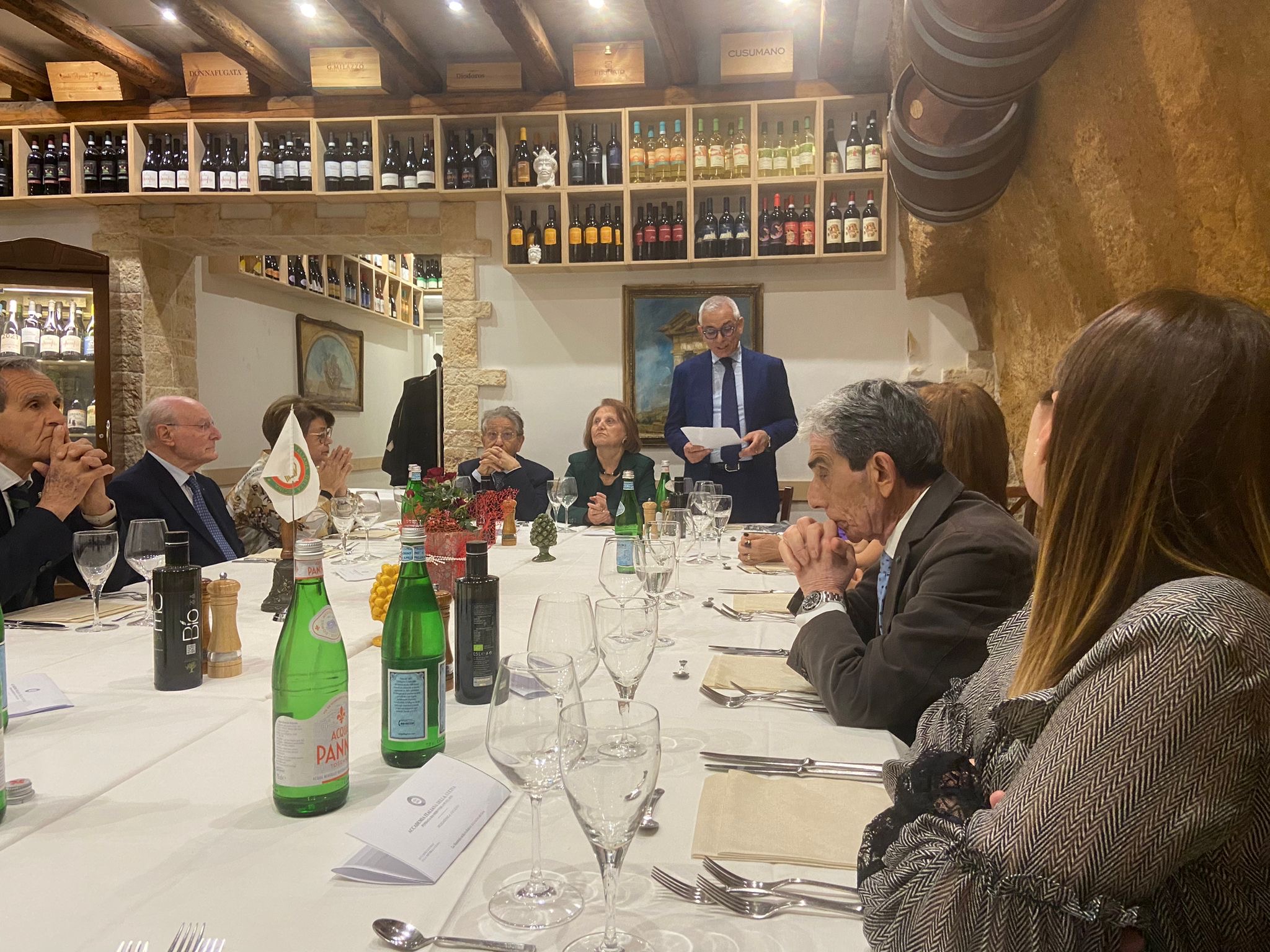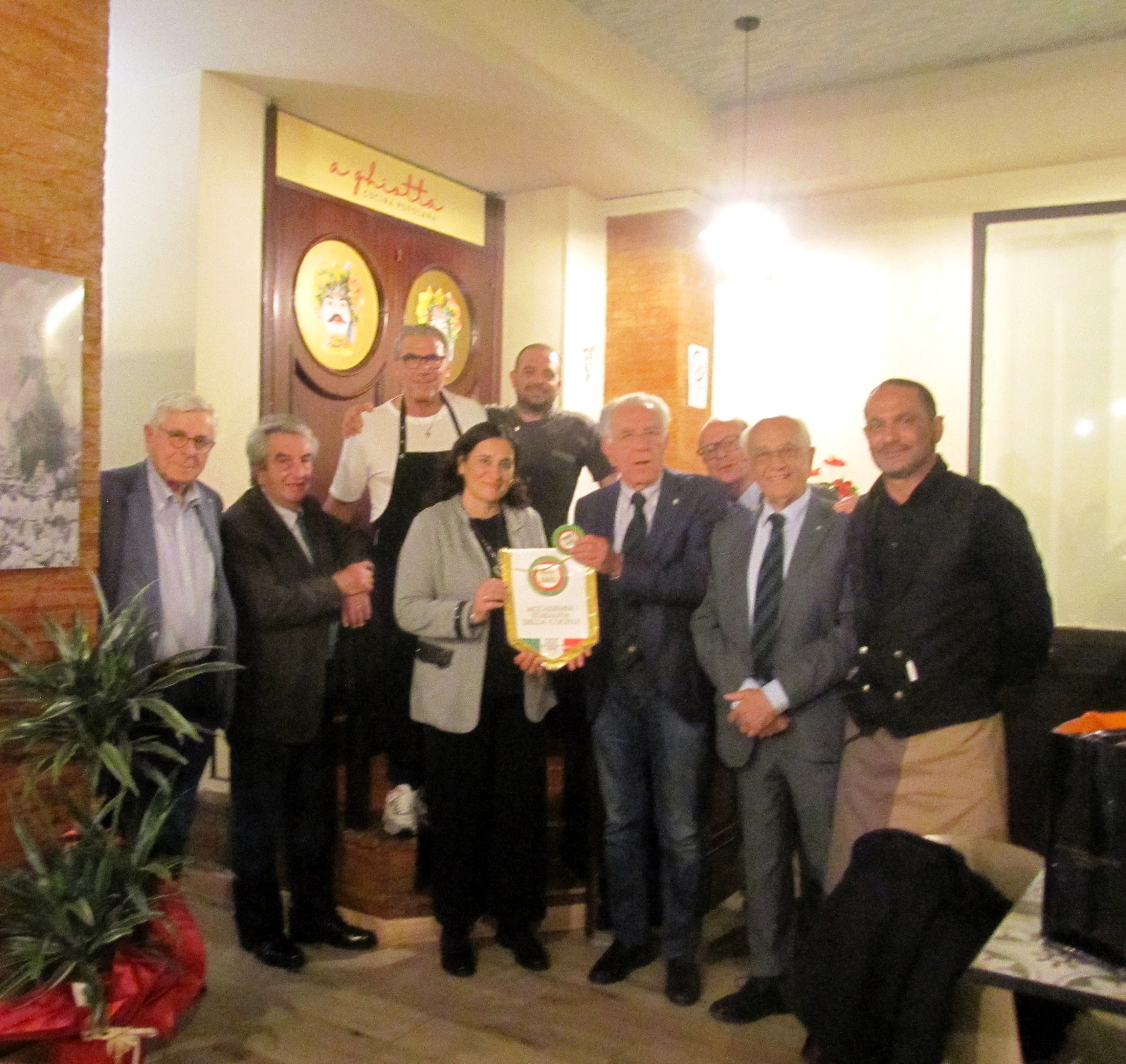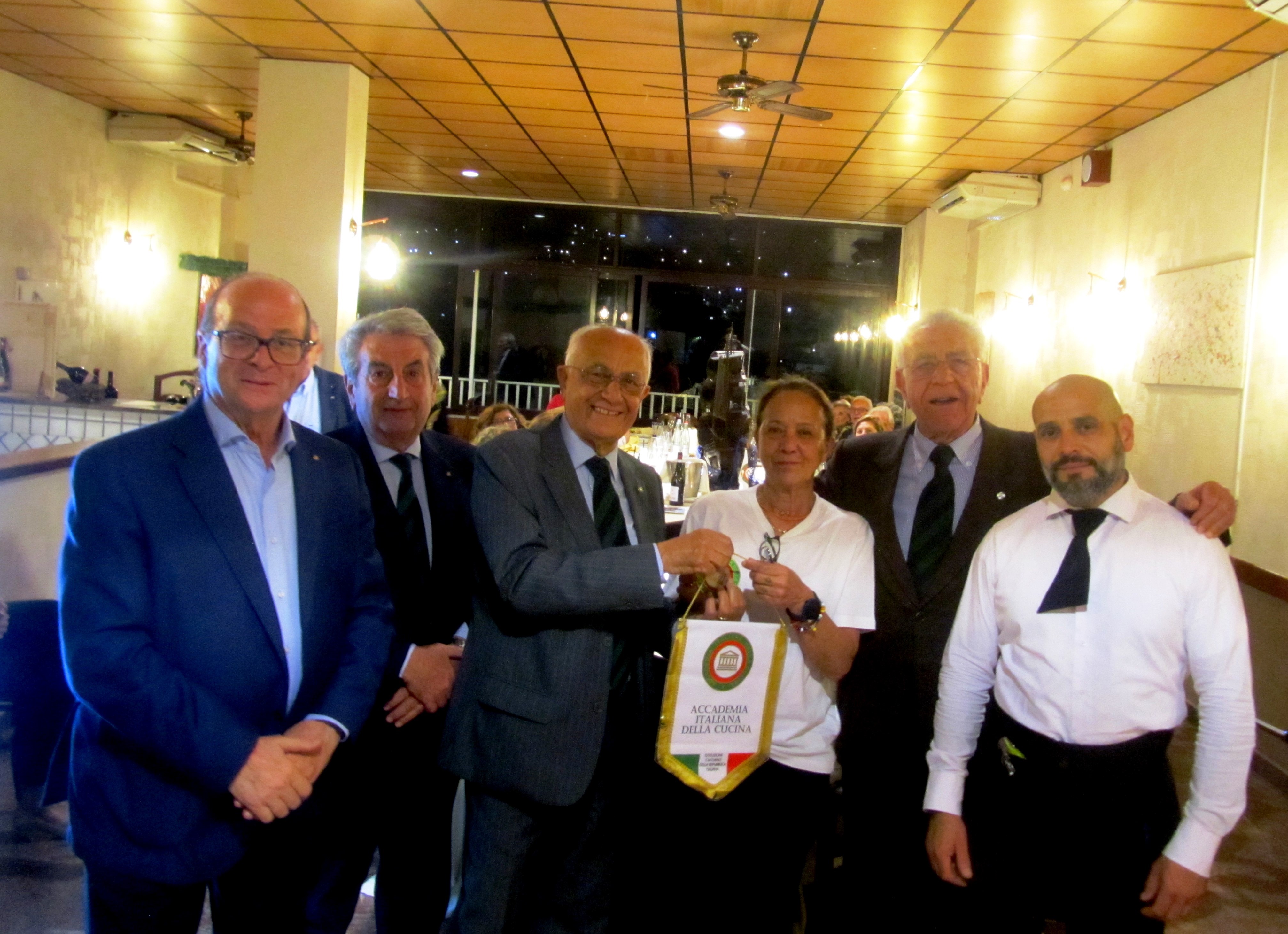 La riunione conviviale si è svolta in un ristorante di grande tradizione siciliana, il Riva, dove in cucina regna il giovane chef Danilo Lipari che mantiene salde le radici culinarie della sua terra d’origine. Proprio la “sicilianità” del ristorante ha fornito l’imperdibile spunto di mescolare cucina e cultura. Avere a disposizione i romanzi polizieschi di Andrea Camilleri, tutti ambientati in Sicilia, a cui attingere, ha fornito l’occasione di indagare un genere letterario, il giallo, che nasce già nell’Ottocento e dove la maggior parte dei detective protagonisti si rapportano in un modo o nell’altro al cibo. I gialli di Camilleri ci trasportano in una Sicilia dove troviamo il protagonista, Montalbano, che mentre indaga su crimini e delitti ci fa esplorare l’arte culinaria dell’isola. Il grande “pititto” che caratterizza il commissario, è l’espediente attraverso il quale Camilleri ci introduce alla cucina siciliana “verace”, quella della nonna Elvira, dal cui ricettario vengono le oltre 60 ricette che troviamo nei vari racconti. La “sciavurosa” caponatina, l’“arancinu di Adelina”, le sarde a beccafico, i famosi sauri imperiali in cipollata che tanto fanno “squittire” Montalbano, tutti piatti in menu, sono stati accompagnati da letture in cui Camilleri ce ne spiega le ricette, mescolandole ai ricordi dell’infanzia. Durante il convivio, gli Accademici Giovanni Costantino, Paola Stranges, Ramiro Calì Corleo e Marino Egisto Paolucci si sono alternati in una staffetta, insieme culturale e divertente, ad arricchimento della serata.