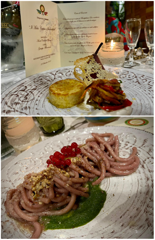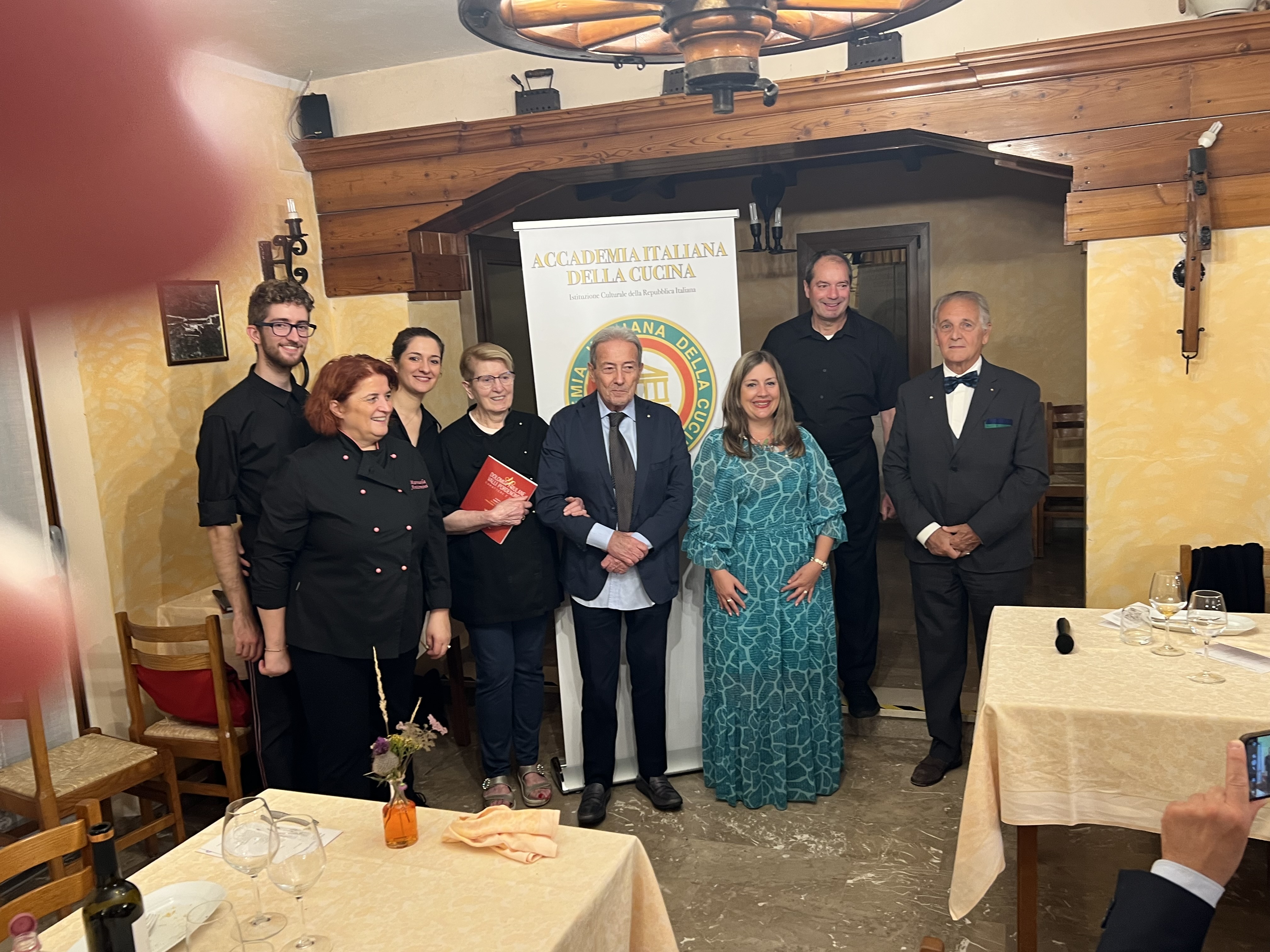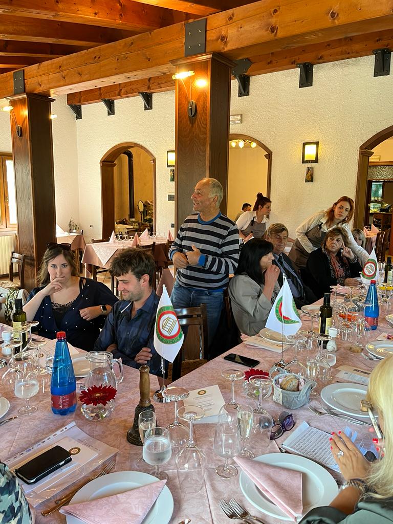 Convivio di ritrovo dopo il periodo estivo al limite della Delegazione in prossimità del Lago Santo, per gustare una cucina di confine tra Emilia e Toscana ricca di spunti. Su programma di Maria Bianca Pini Bentivoglio portato a compimento da Laura Farina, la Delegazione ha scelto come ristorante La Buca delle fate il cui menu propone da tempo e con successo la produzione casearia della Az. Agr. Le capre della Selva Romanesca, abilmente usato nella cucina di Mia, chef del locale. E la Delegazione coglie l’occasione per consegnare proprio all’Az. Agr. Le capre della Selva Romanesca di Frassinoro il Premio Massimo Alberini 2023. All’evento sono quindi presenti i giovani conduttori dell’Azienda, con il responsabile dell’allevamento Mattia Manfredini e rappresentanti del caseificio accompagnati dal conduttore senior Riccardo Marcolini. Un incontro gustoso vissuto in allegria e concluso con passeggiata alle capanne celtiche ristrutturate di Fatalcina tra suggestioni di boschi, leggende da focolare e rosseggiare autunnale delle foglie del Mirtillo nero dell’Appennino modenese dalle tante proprietà.