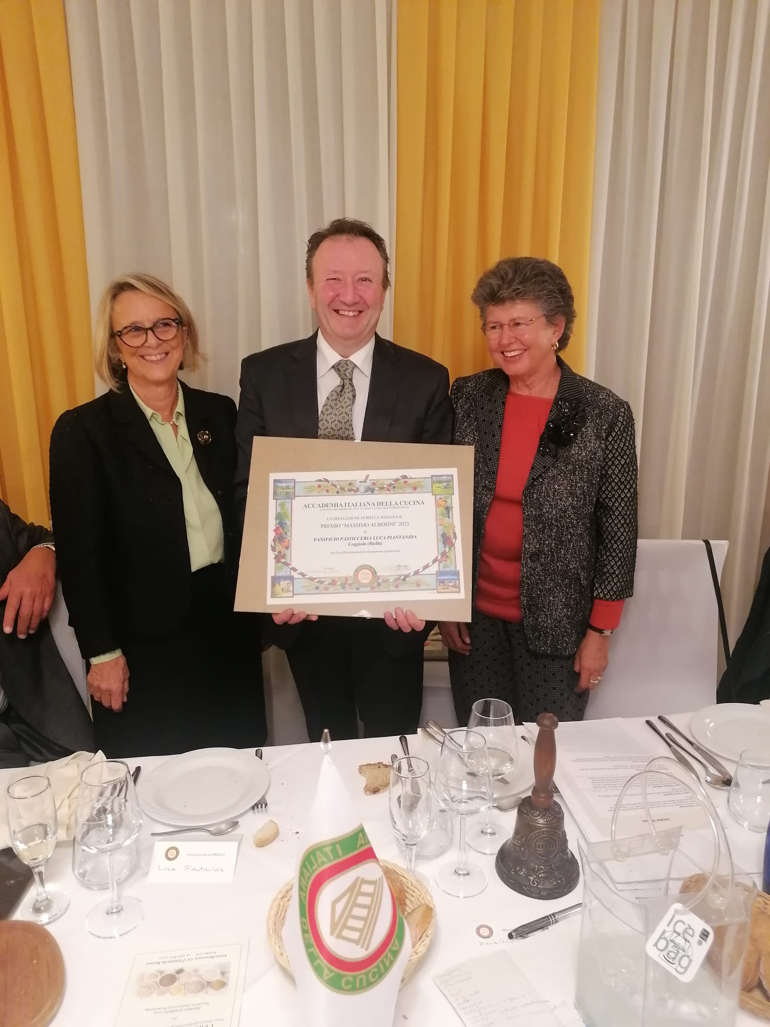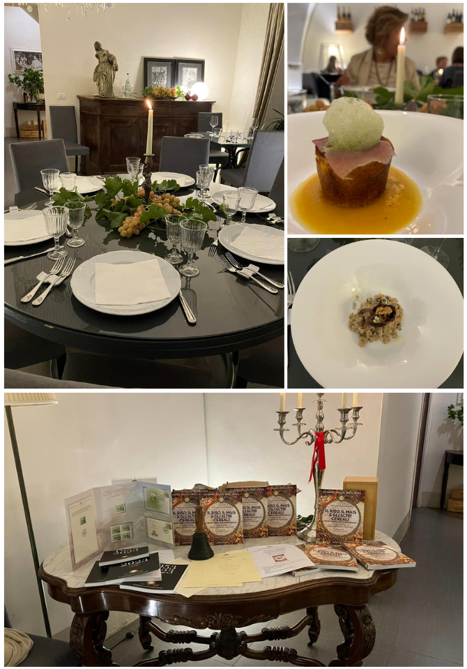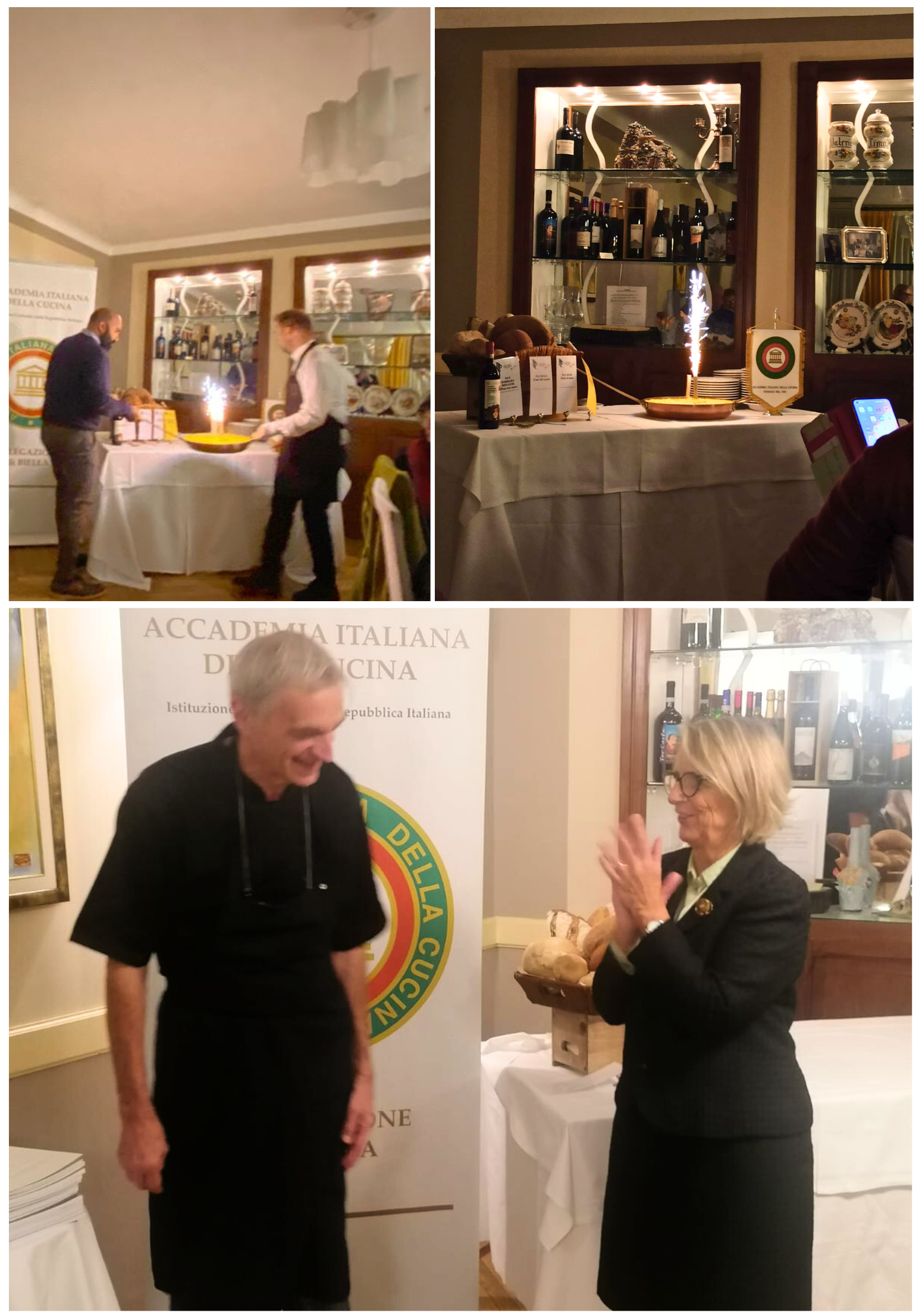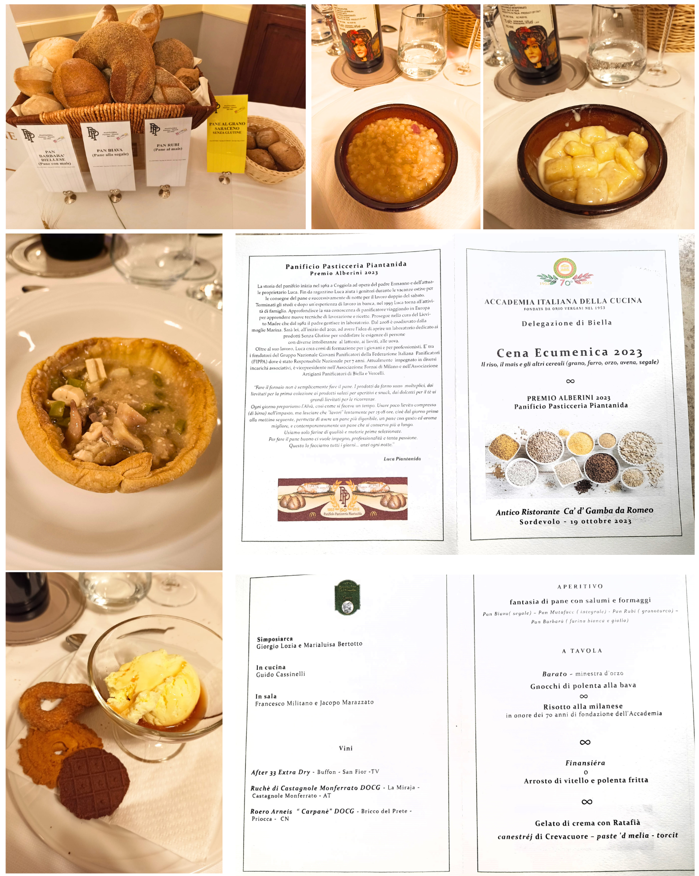 Cena Ecumenica presso il ristorante Cà d' Gamba di Sordevolo abbinata alla consegna del Premio Alberini alla Panetteria Pasticceria Piantanida di Coggiola. Il premio è stato consegnato a Luca, figlio di Ermanno, fondatore dell'azienda, dalla Delegata Maria Luisa Bertotto assieme a Laura Zegna, presidente della Commissione Turismo di Confindustria Piemonte e del Consorzio Alpi Biellesi di cui Piantanida è un associato (foto 1). Nel corso della serata Luca Piantanida ha illustrato i diversi pani di sua produzione che accompagnavano i piatti in menu. Giorgio Lozia, referente biellese della cultura, ha parlato dei canestrelli, famosi biscotti locali (foto 2a). La Delegata Bertotto (foto 2b) ha introdotto il menù sui cereali che comprendeva un antico piatto tradizionale, il “barato” (minestra d'orzo), degli gnocchi con l'utilizzo di mais nell'impasto, il gelato servito con tipici biscotti biellesi. Unico piatto che esulava dal contesto della cena ecumenica, la finanziera, un must del ristorante Cà d' Gamba (piatti e menu in foto 3). Infine, il risotto alla milanese presentato in una padella di rame con candele accese come una torta di compleanno per festeggiare i 70 anni di fondazione dell'Accademia (foto 4 presentazione del risotto; Delegata con lo chef Cassinelli).