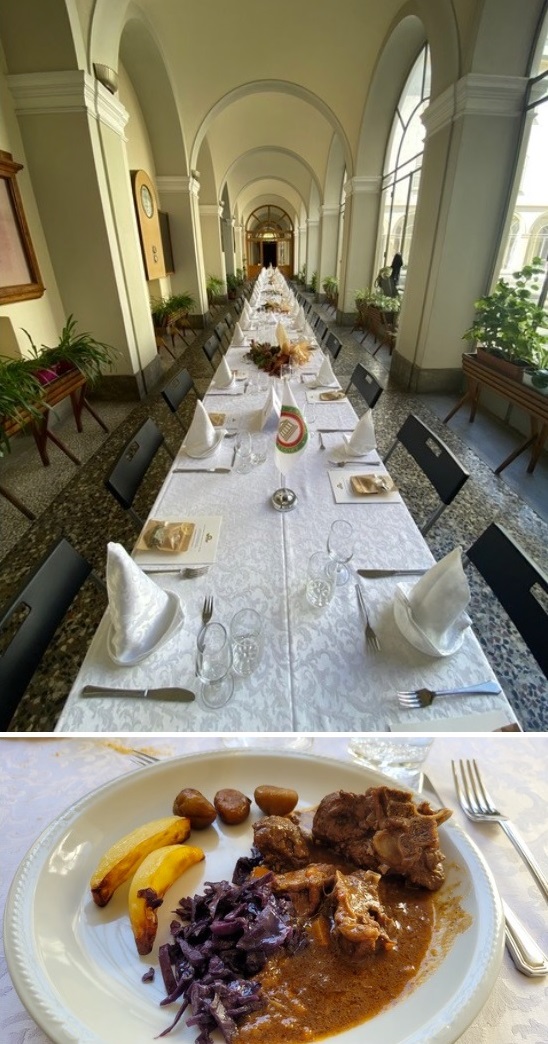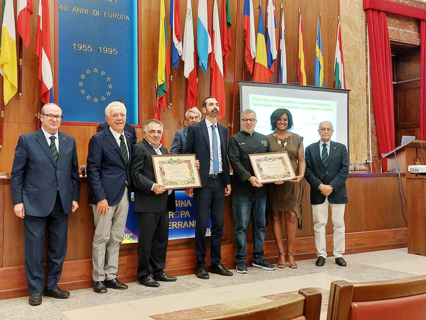 La Cena Ecumenica è stata preceduta da un evento celebrativo dei 70 anni dell’Accademia, tenuto nel Salone delle Bandiere della Casa Comunale. Introdotto dal Delegato, che ha preso le mosse dal racconto della conviviale fondativa per giungere alla illustrazione del manifesto dei 70 anni (foto 1a), il Sindaco Federico Basile ha quindi evidenziato la valenza dell’Accademia nell’integrazione con il tessuto culturale della comunità nella tutela delle sue radici e tradizioni (foto 1b). Pregnanti l’intervento di Francesco Cacciola (foto 1c), coordinatore del corso di laurea in Scienze gastronomiche dell’Ateneo, e la relazione storica conclusiva di Attilio Borda Bossana, Consultore di Delegazione e Direttore del CST Sicilia Orientale (foto 1d). Difronte ad una vastissima rappresentanza di Accademici e a un folto pubblico, il Sindaco e la Consulta hanno quindi consegnato i due premi Villani 2023 (foto 3) a Salvatore Delia per la pasticceria secca e ripiena messinese e a Nino e Consuelo Modica per l’arancia candita. Il menu dell’Ecumenica (Foto 3) proposto dal ristorante-pizzeria L’Orso in Duomo, è stato apprezzato dalla Delegazione con una valutazione informale di eccellenza e con la consegna del piatto dell’anno 2023 nei pressi della cinquecentesca fontana del Montorsoli davanti la Cattedrale (foto 4).