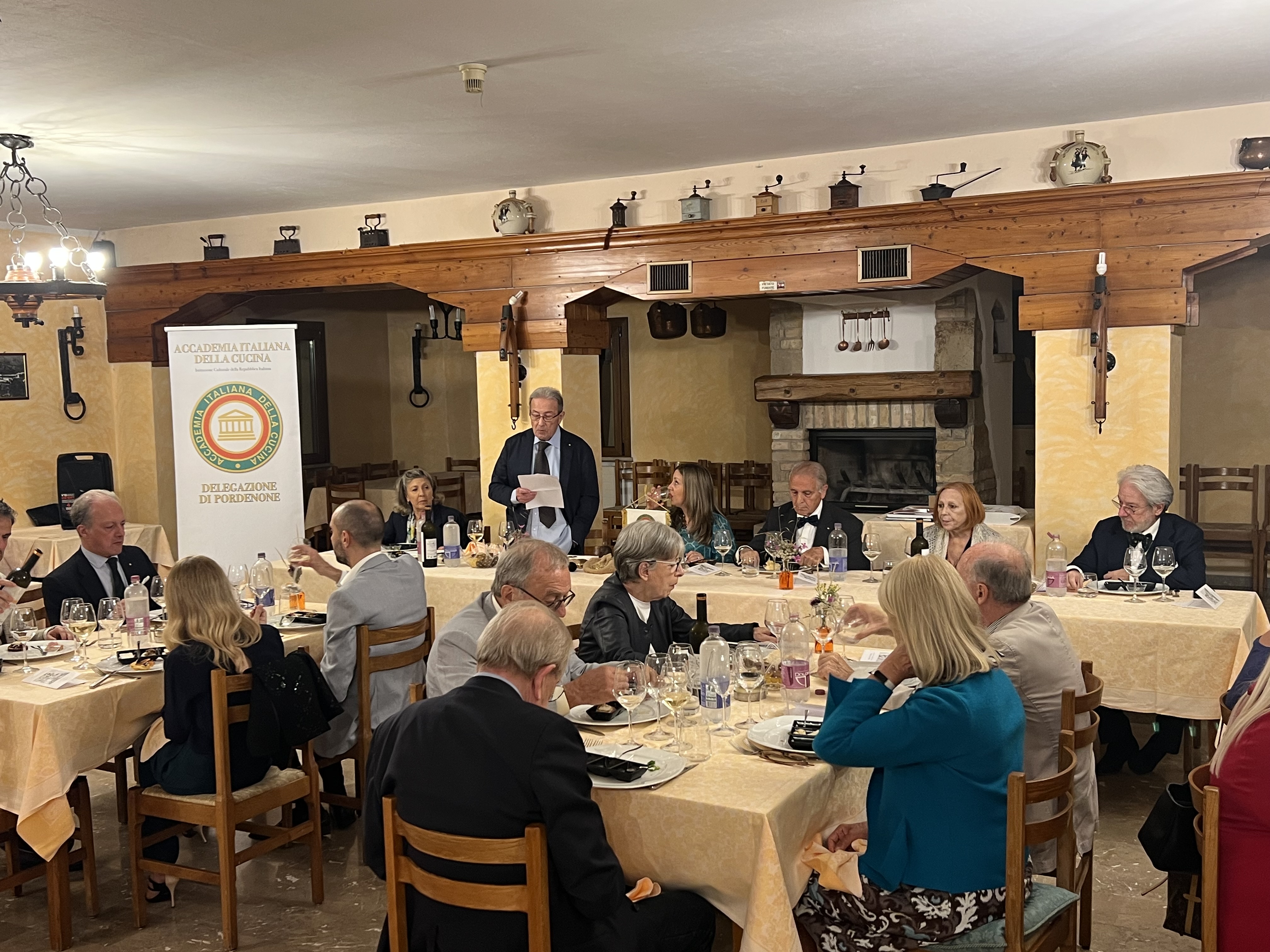 Riunione conviviale sul tema “Dal chicco al piatto” al ristorante Bornass di Aviano curata dal Simposiarca della serata Arnaldo Grandi e dal Segretario-Tesoriere della Delegazione di Pordenone Alfredo Taiariol che hanno pensato, assieme alla chef Manuela Antonini, a un variegato menù volto a valorizzare i tesori della Pedemontana. Nella selezione: crostino di pane di zucca con cipolla rossa in agrodolce e ricotta affumicata di malga, cestino di formaggio con ricotta di Marsure figo moro da Caneva e pitina croccante, risotto con funghi finferle e un delizioso coniglio “alla maniera della nonna” cucinato dalla sig.ra Luisa. La serata, coordinata dalla Delegata Cristina Sist, è stata caratterizzata in apertura dalla relazione dettagliata e precisa dell’Accademico Arnaldo Grandi. A conclusione della parte culturale gastronomica si è tenuta la cerimonia di ingresso nella Delegazione di Pordenone dell’Accademico Raffaele Palmieri. Durante il simposio si è osservato un minuto di silenzio per onorare le recenti scomparse di due stimati Accademici, Angela Mormile e Nello Tesolin.