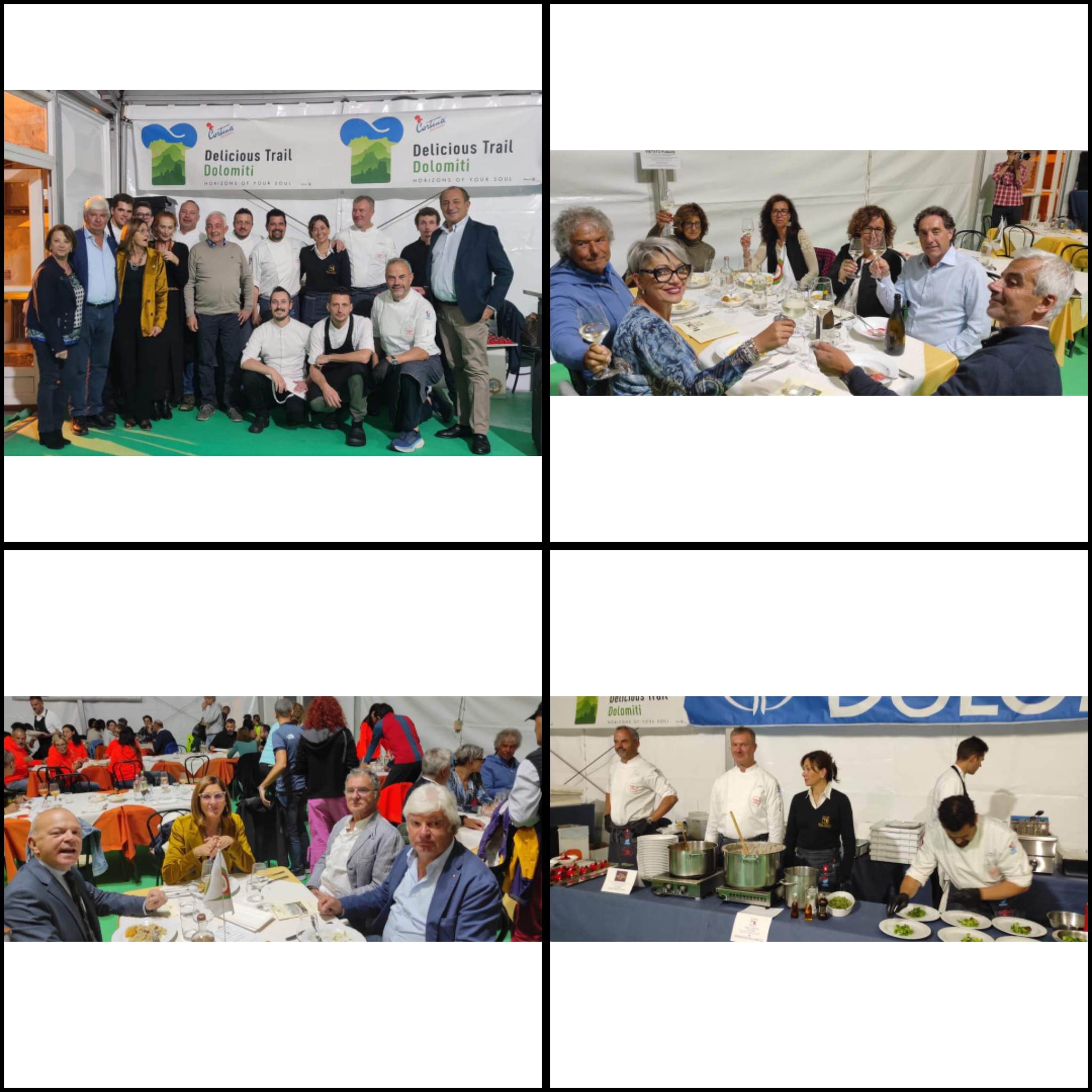 La Conviviale di settembre della Delegazione di Cortina d’Ampezzo si è tenuta nell’ambito della Delicious Trail Dolomiti, la famosa gara che si svolge tra il centro di Cortina, Pocol, Croda da Lago, 5 Torri, Nuvolau, Lagazuoi e Passo Falzarego, attraversando i musei all’aperto della Grande Guerra. Ciò che rende unico nel proprio genere questo evento è la valorizzazione dell’aspetto enogastronomico in quanto è ben nota l’alta qualità della cucina e la cura del servizio presentate dagli organizzatori. Venerdì 29 settembre a Pocol, presso il Pala Delicious allestito per l’occasione a fianco dell’Hotel Villa Argentina, gli Accademici si sono ritrovati per degustare le proposte di cinque ristoranti e di una pasticceria di Cortina: Rio Gere con Nicola Bellodis, Villa Oretta con Luigi Anzanello, Tivoli con Graziano Prest, Lago Scin con Carlo Festini Cucco, Al Camin con Fabio Pompanin, Pasticceria Alverà con Massimo Alverà: occasione unica per vedere riuniti all’opera tutti insieme i cuochi del territorio e dialogare con loro, che hanno cucinato a vista all'interno del tendone, componendo un menu gustoso e calibrato. Gli Accademici hanno trascorso una serata originale che ha saputo esaltare la cucina tradizionale del territorio.