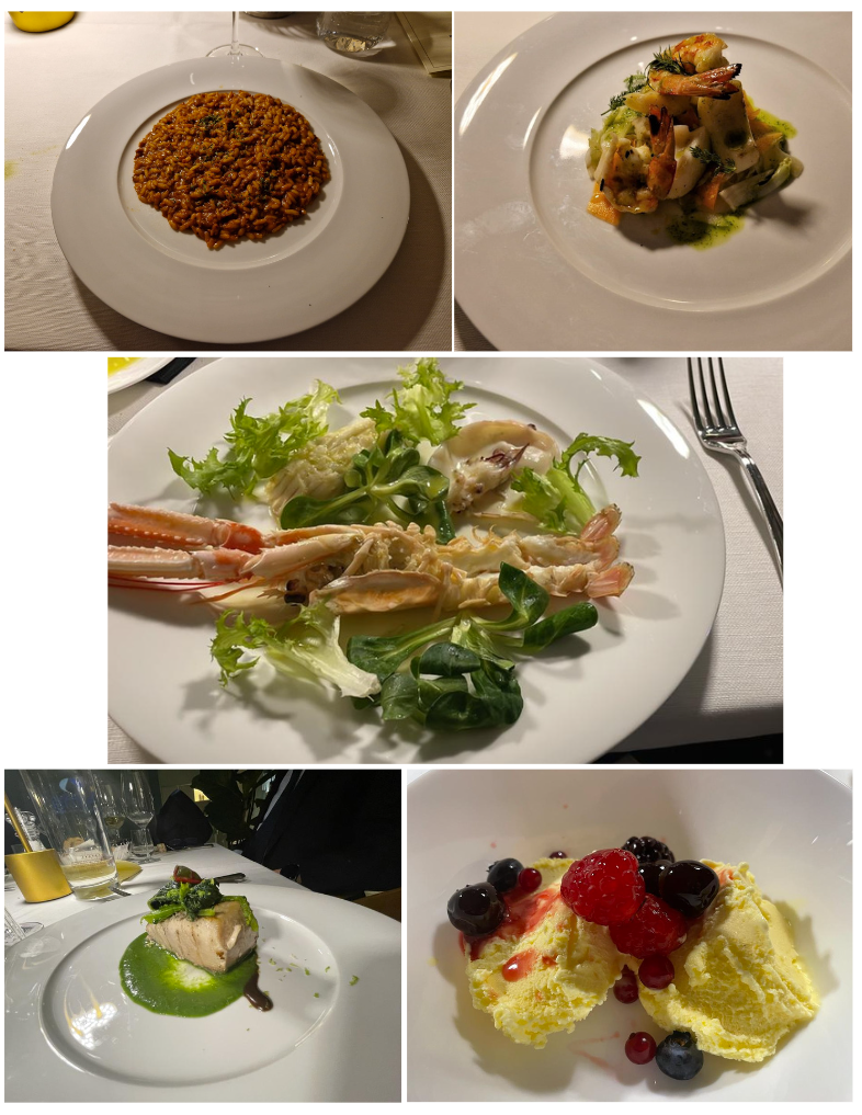Mentre la Delegazione di Cortina d’Ampezzo si riuniva per la Conviviale di Primavera, scendeva sulla valle un’inaspettata nevicata che rendeva ancora più accogliente la calda atmosfera del nuovo ristorante Alajmo, che ha aperto di recente nei locali dello storico El Toulà. In un ambiente elegante e raffinato, rinnovato e curato nei minimi dettagli, i Simposiarchi Maurizio Pozzan e Diego Belli hanno ricordato la storia del ristorante e della famiglia Alajmo: percorso che ha anticipato il menu servito in tavola, un misto di tradizione ed innovazione. I piatti sono stati gustati e dibattuti tavolo per tavolo, mentre il servizio attento e scrupoloso ha reso la serata particolarmente gradevole. Dalla particolarità dei piatti e degli abbinamenti proposti è scaturito più volte un interessante confronto con il direttore del locale Davide Da Re, che ha reso la serata particolarmente stimolante dal punto di vista delle tradizioni culinarie e degli obiettivi dell’odierna cucina. Foto 1. I Simposiarchi Maurizio Pozzan e Diego Belli. Foto 2. Il cuoco Mattia Barni alle prese con la sfoglia alla crema pasticcera. Foto 3. La brigata di cucina. Foto 4. Risi e Bisi.