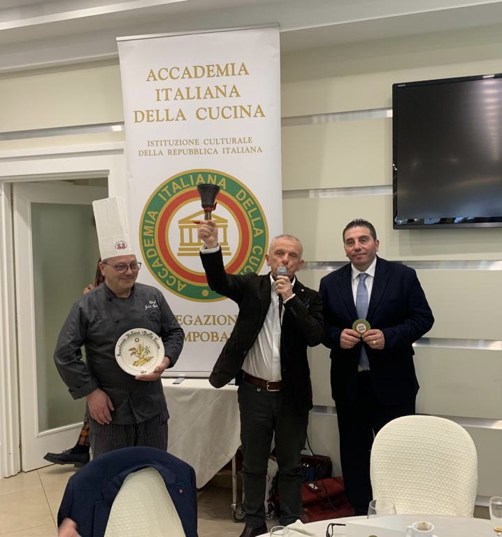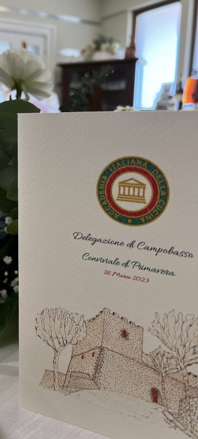 La riunione conviviale è stata organizzata a Villa D’Evoli, una location storica incastonata nella campagna della valle del Fiume Biferno, che dalle falde dei monti del Matese raggiunge l’Adriatico nei pressi di Termoli, cuore del verde Molise. Lo chef ha fondato la sua proposta di menù sulla cucina di mare, consentendo agli Accademici e e ospiti di gustare il pescato fresco della vicina costa adriatica, comodamente immersi nel verde della valle. Con il sapiente supporto del Simposiarca Maurizio Nerilli, che ha reso l’incontro ricco di spunti e di riflessioni sulle origini, produzione e tradizioni delle vivande e del vino serviti, sono stati gustati un antipasto variegato di mare e due primi che hanno soddisfatto il gusto di tutti gli intervenuti, l’uno con la chitarrina con spada e verdure e l’altro con risotto, salmone e lime. Particolarmente apprezzata per la freschezza, delicatezza e fragranza, è stata la spigola al sale naturale accompagnata da uno scampo reale. Anche il dolce, una gustosissima e leggera sfogliatina con mela e gelato, non ha deluso i commensali, soddisfatti per il connubio riuscitissimo di frutta e dolce. A chiudere il convivio, come sempre, il Delegato Ernesto Di Pietro ha ringraziato lo chef e il suo staff con parole di encomio e simpatia, consegnando ai proprietari il materiale di rito, a testimonianza del passaggio dell’Accademia a Villa d’Evoli.