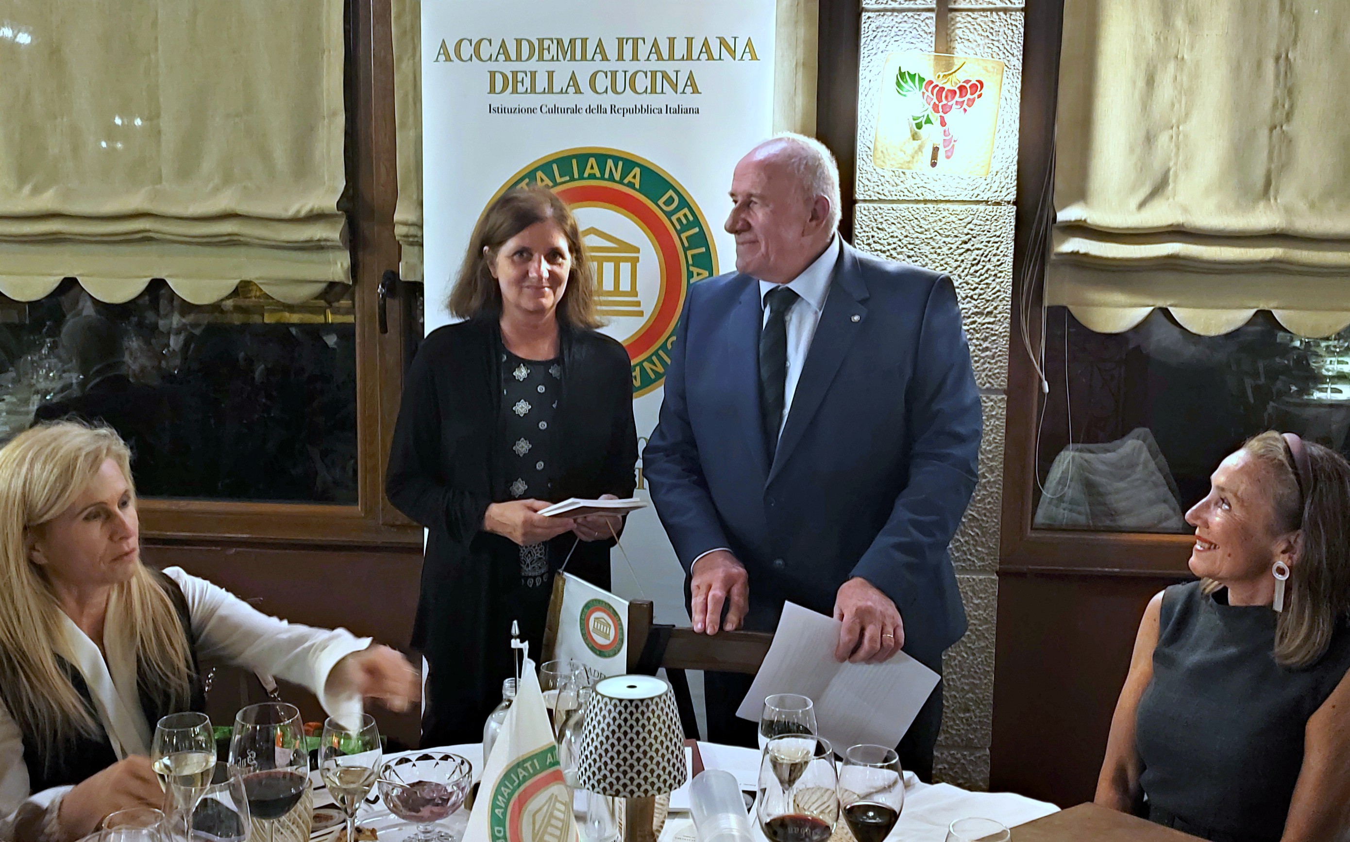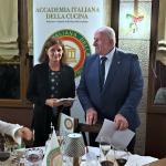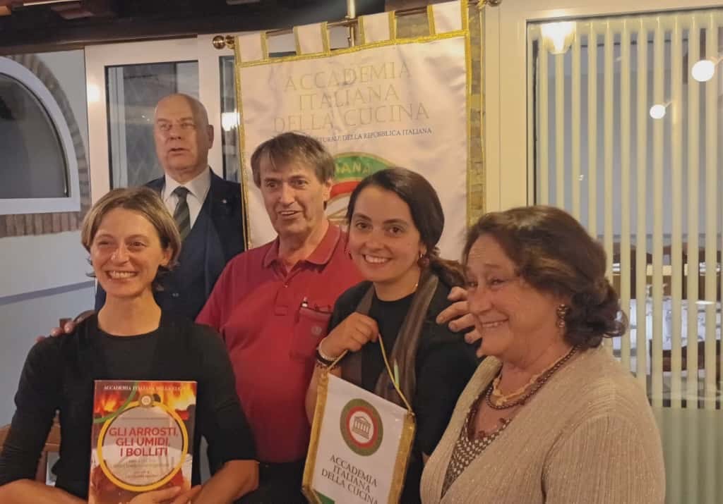 In occasione della cena ecumenica, il Delegato di Roma Eur-Ostiense, Claudio Nacca, ha consegnato il Diploma di Buona Cucina ai fratelli Ennio, Francesco e Marina Mariani, quinta generazione alla guida dello storico locale "Checchino dal 1887", mentre in sala si affaccia già la sesta con i figli di Marina e Francesco. Il riconoscimento premia l’eccellente cucina di Ennio e la custodia della tradizione romanesca, legata alle carni e al celebre quinto quarto: la leggenda vuole che proprio qui sia nata la coda alla vaccinara, creata agli inizi del Novecento dalla bisnonna Fermina. L’ambiente celebra la romanità con il soffitto a botte, gli arredi storici e le stampe originali di Pinelli, donate ai genitori dei fratelli Mariani da Giuseppe Ceccarelli, giornalista nonché primo Delegato dell’Accademia Italiana della Cucina di Roma. Checchino, quindi, è anche la casa della Delegazione romana sin dalla sua fondazione, oltre settant’anni fa. Per questo la Delegazione Roma Eur-Ostiense, competente per territorio, ha voluto condividere la cena ecumenica 2025 con la Delegazione di Roma. Durante la serata, il Delegato di Roma, Giuseppe Florio, ha consegnato i diplomi per i quarant’anni di appartenenza agli Accademici Paolo Basili e Francesco Ricciardi, accolti da calorosi applausi. La Direttrice del CST di Roma, Silvia De Vincentiis, ha infine illustrato il volume dedicato al tema ecumenico dell’anno: “Gli arrosti, gli umidi e i bolliti nella cucina della tradizione regionale”, con un approfondimento sulla Città metropolitana di Roma.