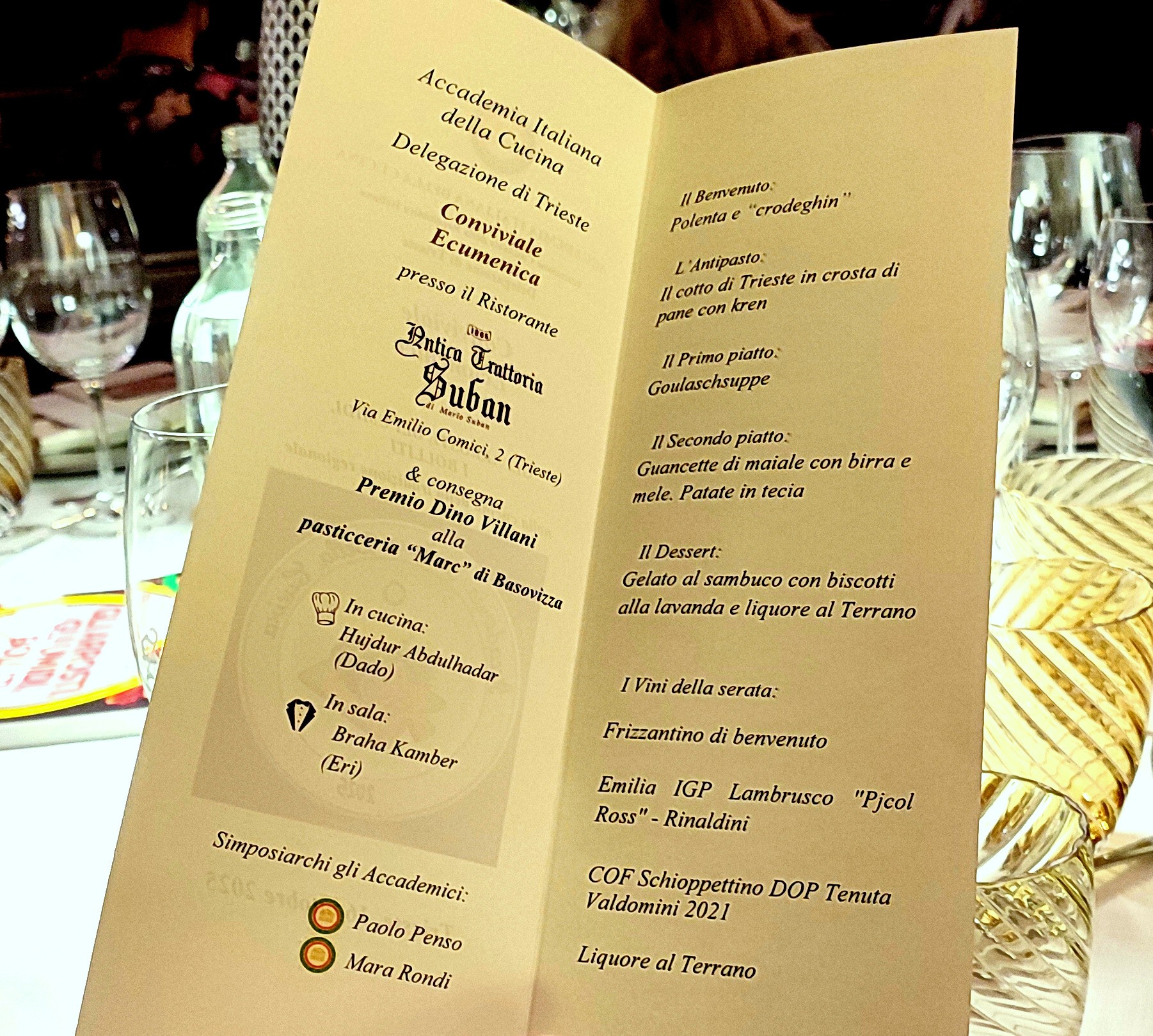 La Conviviale Ecumenica si è svolta all’Antica Trattoria Suban, locale storico d’Italia, con un menù dedicato ai piatti della tradizione regionale: polenta e crodeghin come benvenuto, Cotto di Trieste in crosta di pane affettato in sala, gulaschsuppe, guancette di maiale alla birra e mele con patate in tecia, per concludere con gelato al sambuco e biscotti alla lavanda accompagnati da liquore di Terrano. Nel corso della serata è stato conferito il Premio Dino Villani alla Pasticceria MARC per il suo Kranz, dolce tipico della colazione triestina. Realizzato con un intreccio di pasta frolla e pasta sfoglia farcite con marmellata di albicocca, arance candite e uvetta, il Kranz viene completato da una spolverata di zucchero a velo dopo la cottura. La Pasticceria MARC lo prepara nella versione classica sin dalla sua fondazione, nel 1983.