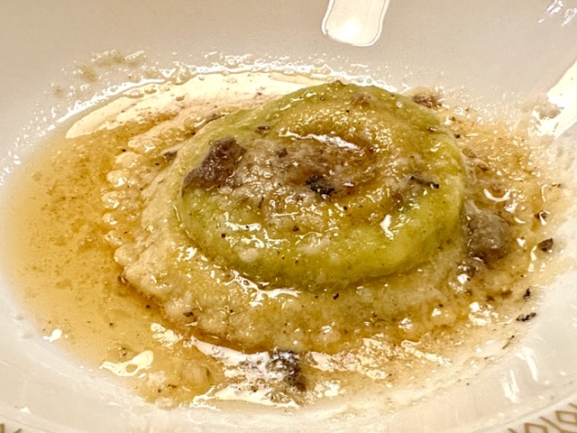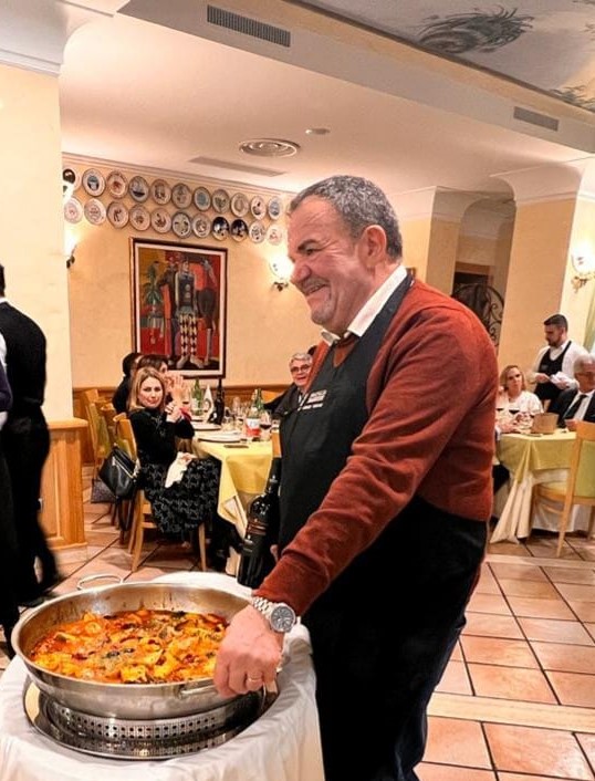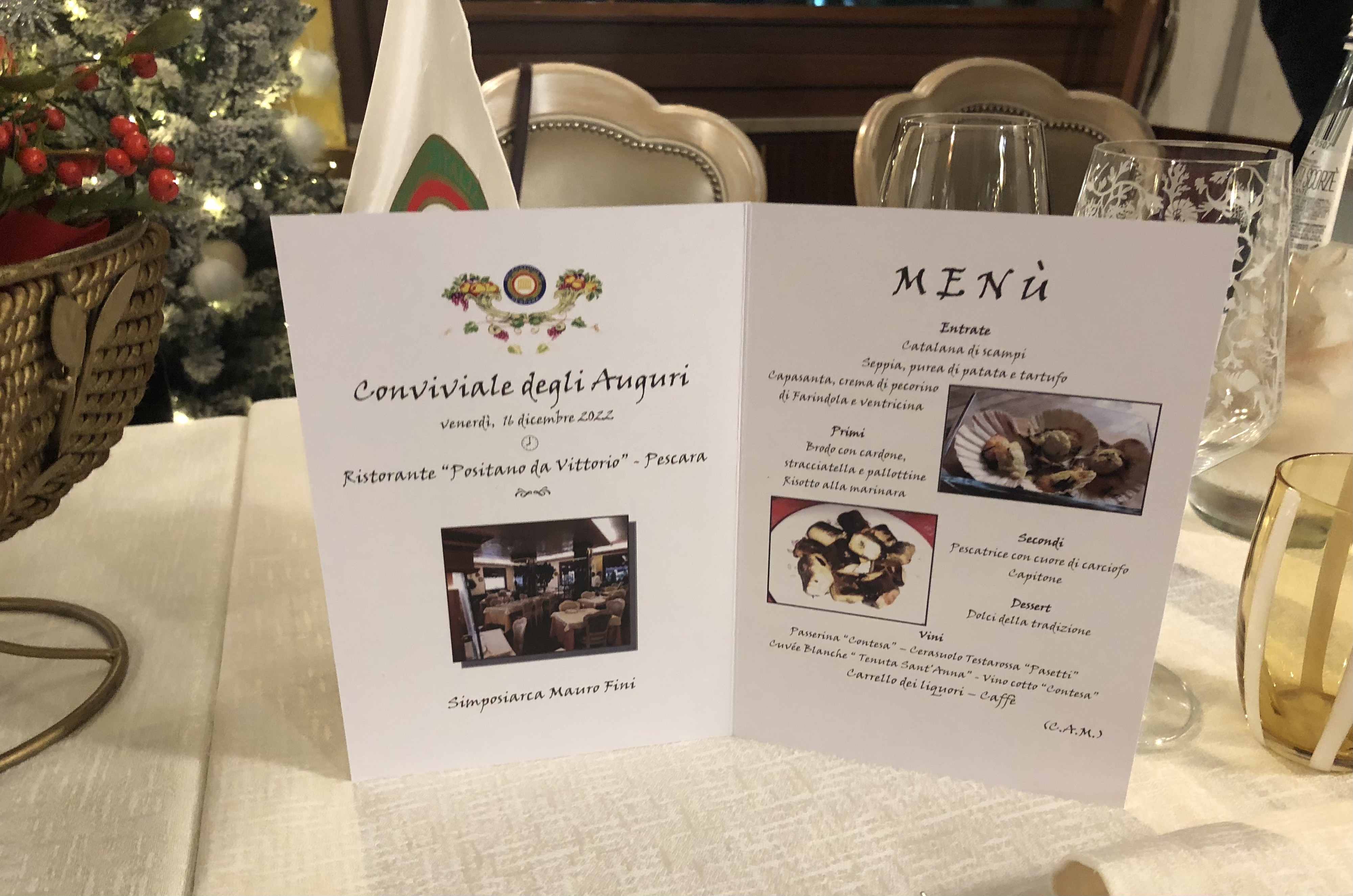 Il ristorante “Positano da Vittorio”, sul lungomare del capoluogo adriatico, ha ospitato la conviviale degli auguri della Delegazione di Pescara. Il Delegato Giuseppe Fioritoni ha aperto la serata con una breve digressione sulle tradizioni storiche delle festività dicembrine (Foto 1). Apprezzatissimo il menu scelto dal Simposiarca Mauro Fini (Foto 2), che ha sintetizzato elementi tipici del cenone di Vigilia e del pranzo di Natale, coniugando meravigliosamente piatti tradizionali del territorio e altri arditamente innovativi. Tra gli antipasti di pesce, squisita la capasanta con crema di pecorino di Farindola e ventricina (Foto 3). Bis di primi terra e mare: brodo con il cardone, le pallottine e la stracciatella, piatto sovrano abruzzese nel giorno del Natale. A seguire, l’altrettanto immancabile capitone e, dulcis in fundo, un fantastico tris di cacionetti ai ceci, al miele e mandorle e alla scrucchiata, accompagnato da un prezioso vino cotto. A fine serata la Delegazione ha espresso vivo compiacimento alla famiglia Pecoraro e alla brigata di cucina per l’ottimo servizio e la impeccabile realizzazione delle portate (Foto 4).