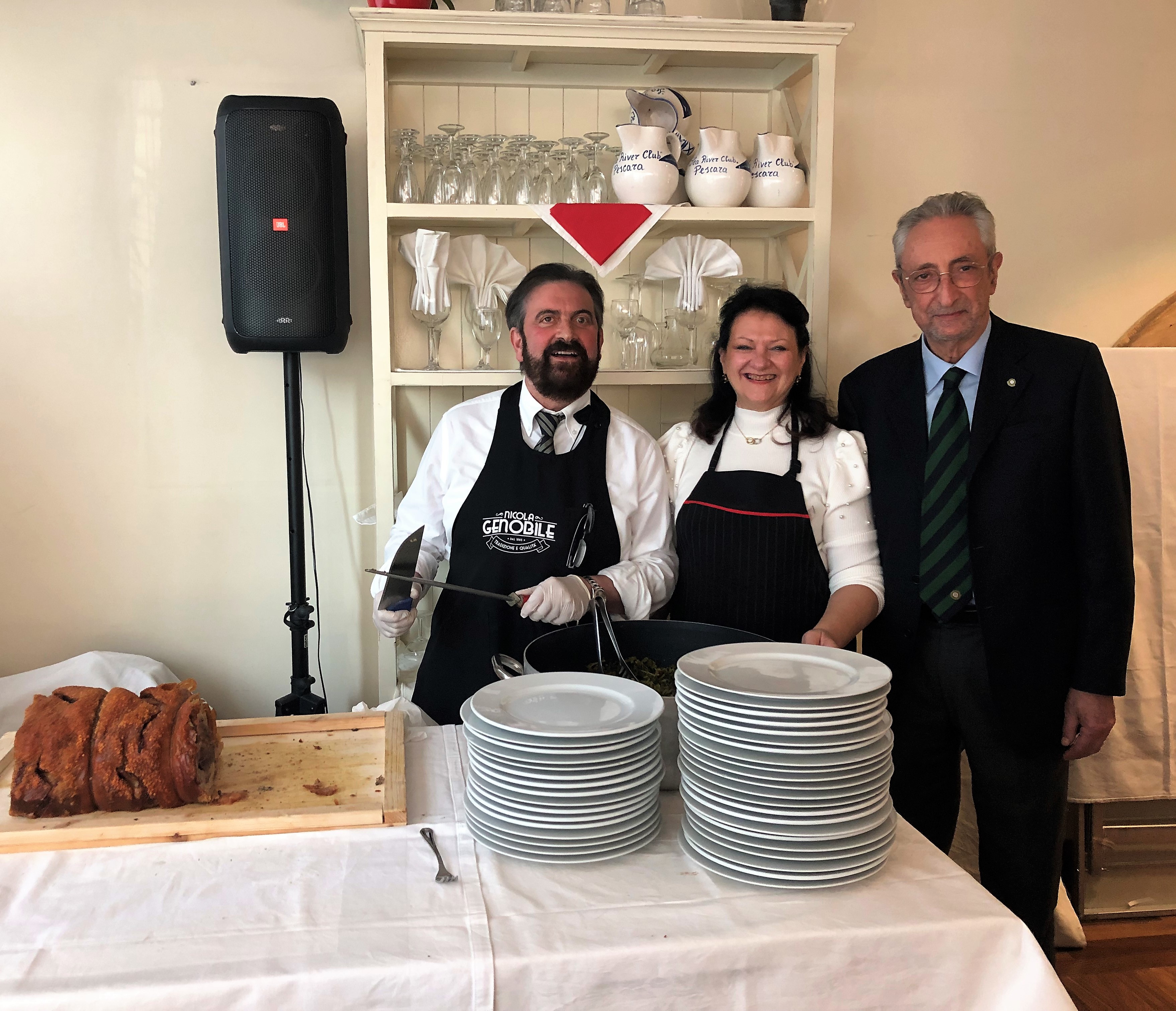 L’anno accademico della Delegazione pescarese si è aperto con il festeggiamento di Sant’Antonio Abate, in una riunione conviviale che si è svolta al Sea River, sul lungofiume di Pescara. Come tradizione vuole, per celebrare il Santo patrono dei macellai, dei contadini e degli allevatori, leit motiv del simposio è stato la carne di maiale, e in particolare Sua Maestà la porchetta, oggetto di una appassionante relazione dell’Accademico trevigiano emembro del Centro Studi “Franco Marenghi” Giancarlo Saran. Non è mancato un momento poetico con una lettura del sonetto che Gabriele d’Annunzio dedicava a Giacomo Acerbo, ringraziandolo per avergli fatto dono di una porchetta che gli rievocava profumi domenicali pescaresi. Nel corso della conviviale, la porchetta è stata degustata in quattro declinazioni regionali: la siciliana di Caronia, la laziale di Ariccia, la umbra di Grutti e, per finire, quella abruzzese di Torrevecchia Teatina, tagliata e servita personalmente dal pluripremiato maestro porchettaio Nicola Genobile di Torrevecchia Teatina. La riunione è stata anche l’occasione per ufficializzare l’ingresso del neo Accademico Alberto Massignani che ha ricevuto le insegne dal vice Presidente vicario Mimmo D’Alessio. Foto 1. Accademico Massignani con il Delegato Fioritoni e il vice Presidente vicario D’Alessio. Foto 2. Il maestro porchettaio Nicola Genobile con il Delegato. Foto 3. L’Accademico Giancarlo Saran offre un piatto tipico trevigiano all’Accademico pescarese Massimo Di Cintio. Foto 4. Il menu.